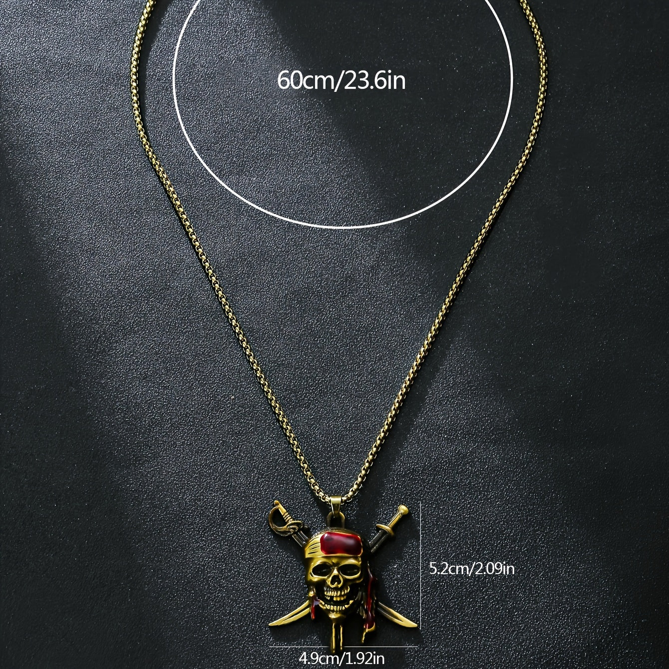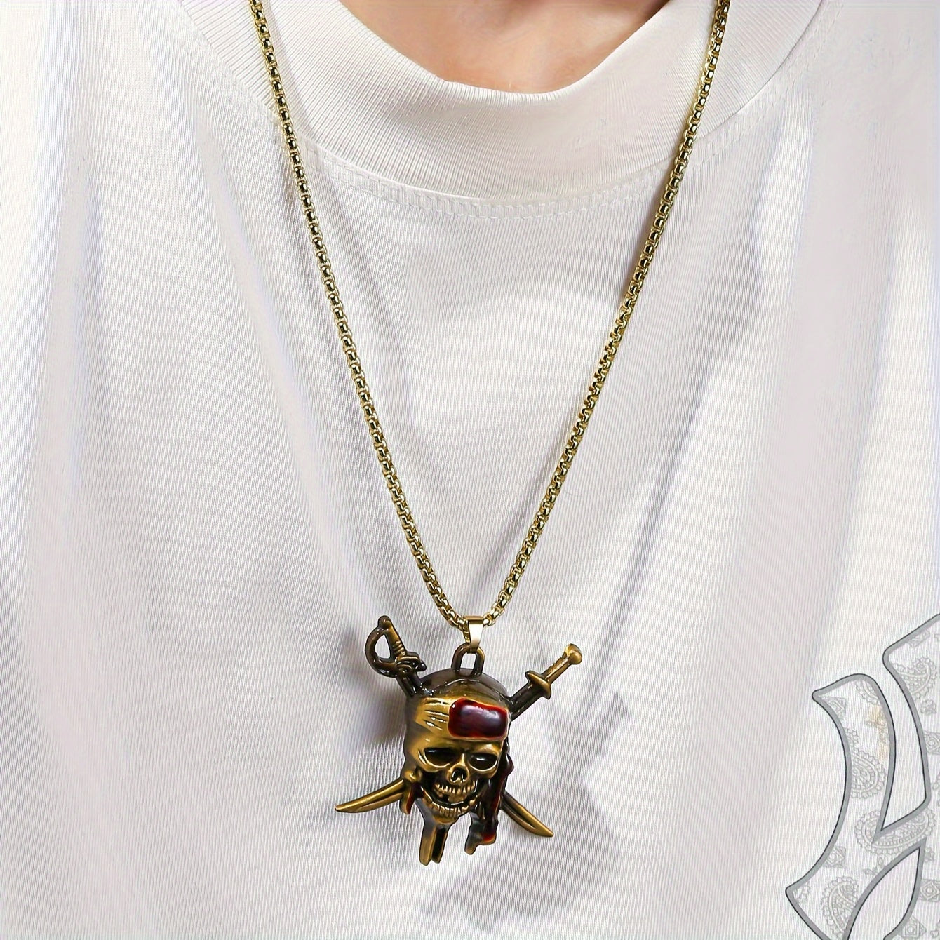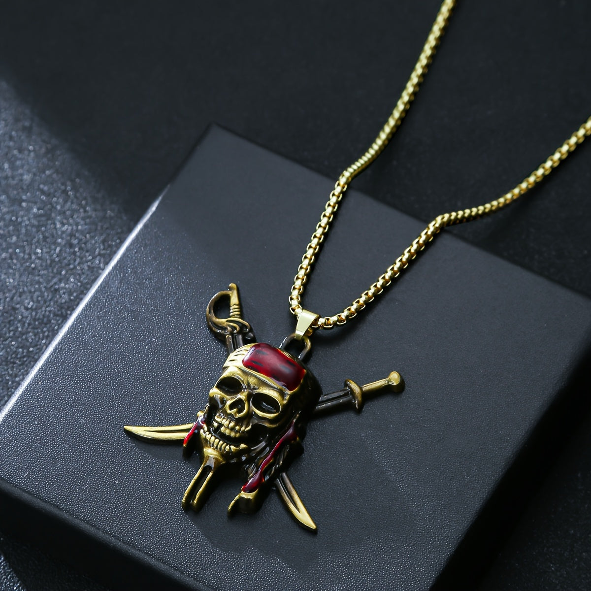 Make a bold fashion statement with this golden toned pirate skull pendant necklace featuring a red bandana. Perfect for men who love hip hop style.