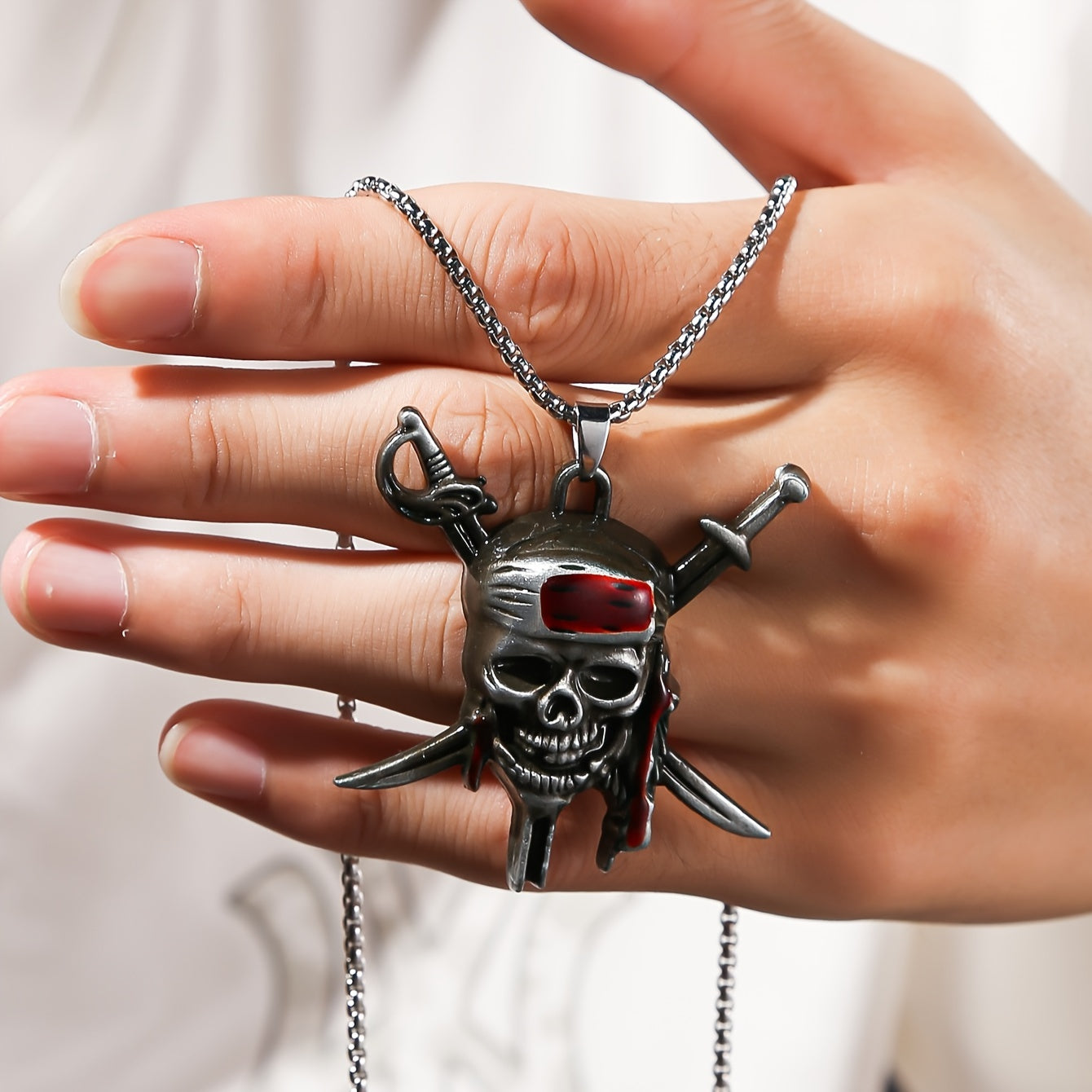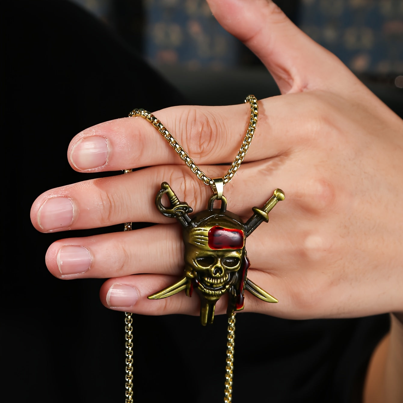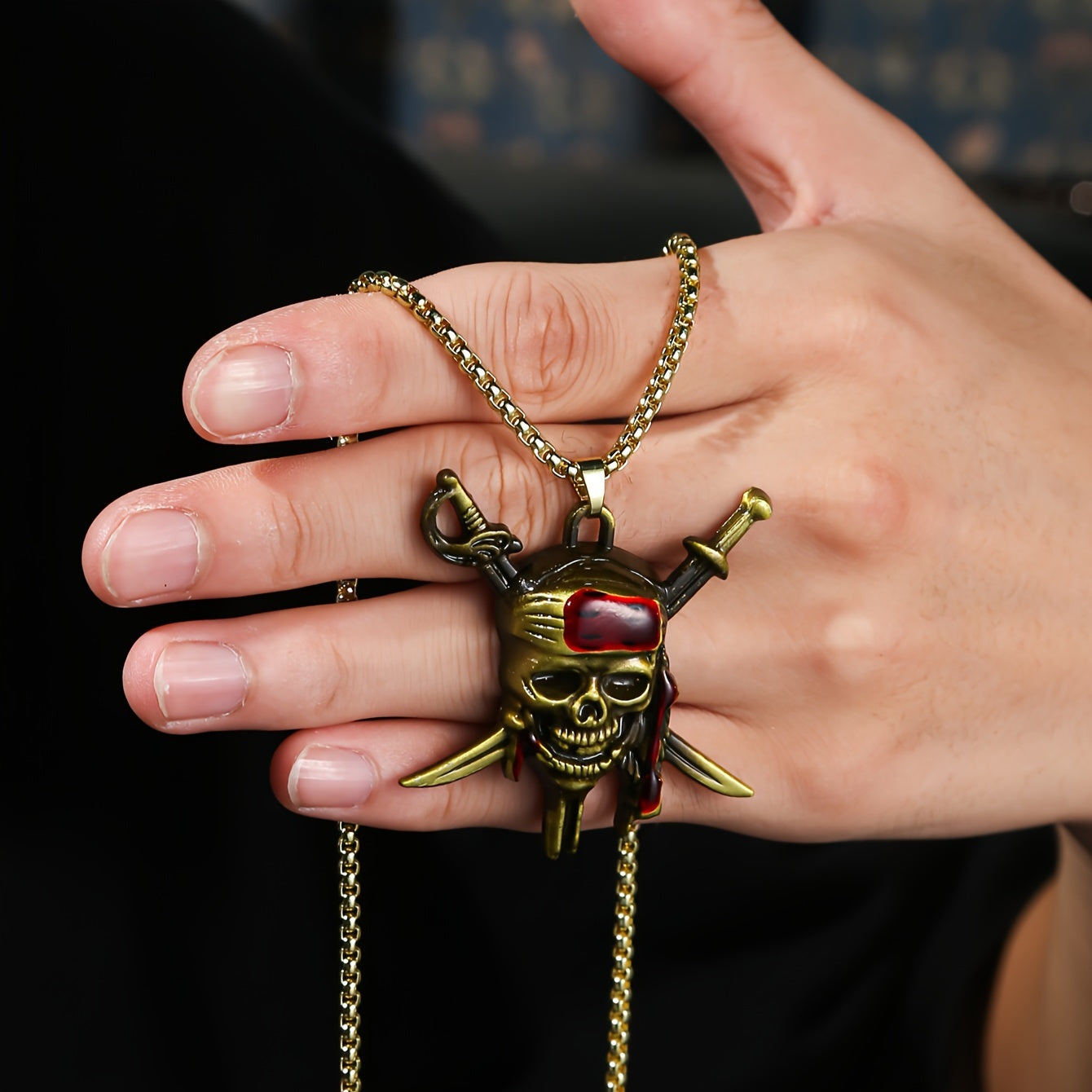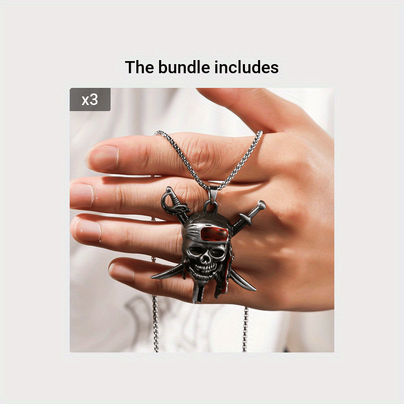 Make a bold fashion statement with this golden toned pirate skull pendant necklace featuring a red bandana. Perfect for men who love hip hop style.