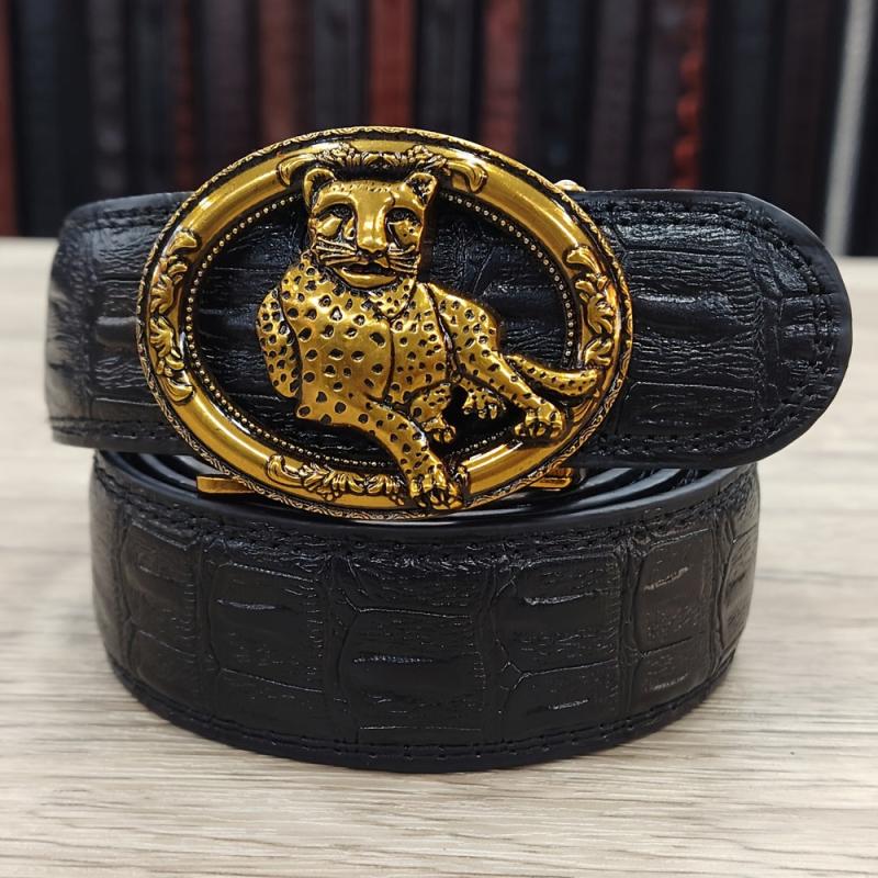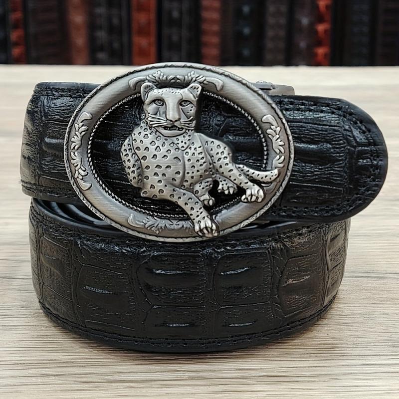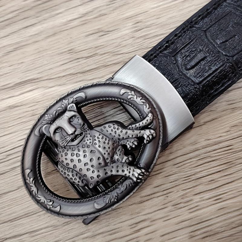 Upgrade your casual attire with this stylish leather belt featuring an embossed leopard buckle. Perfect for adding a touch of animal print to your look.