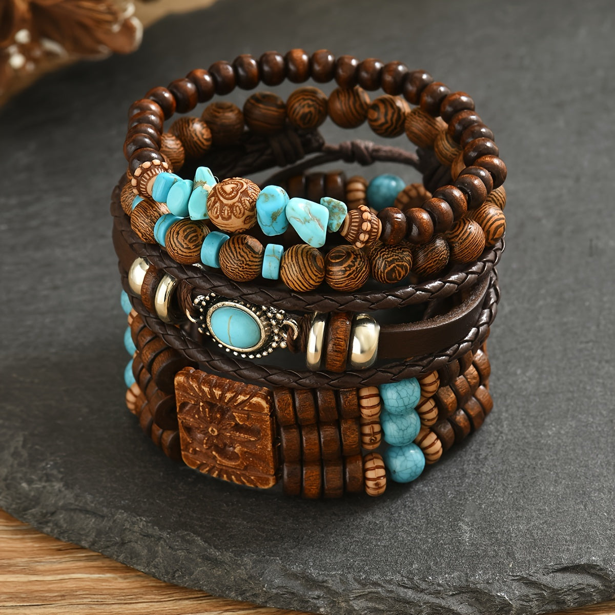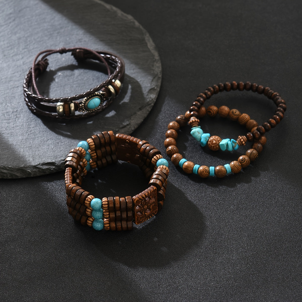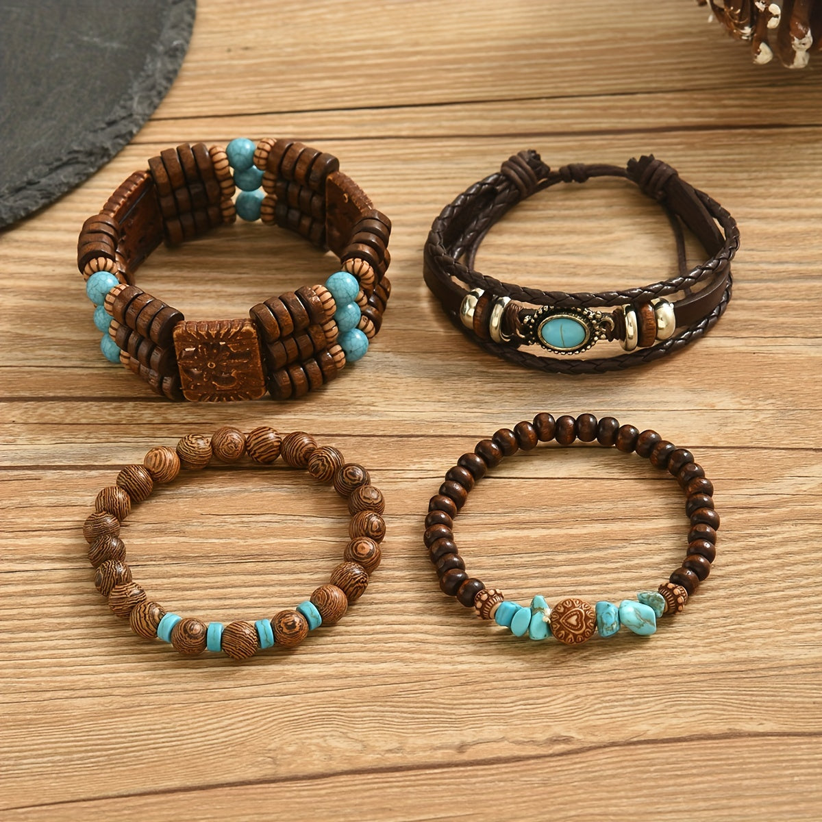 This set includes 4 vintage-style braided bracelets made of PU leather and featuring chicken wing wood and turquoise accents. Ideal as a Christmas or friendship gift.