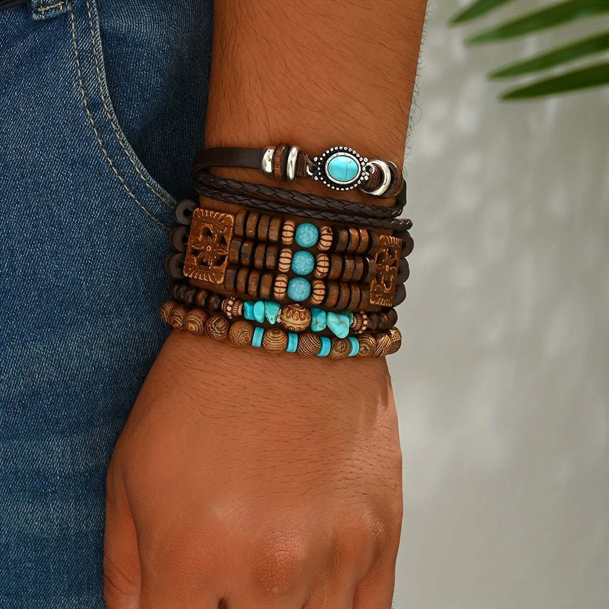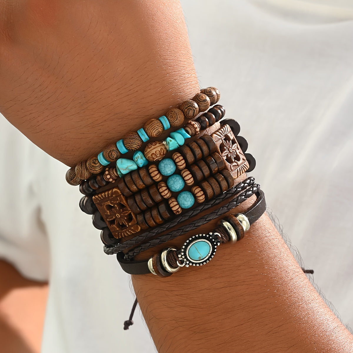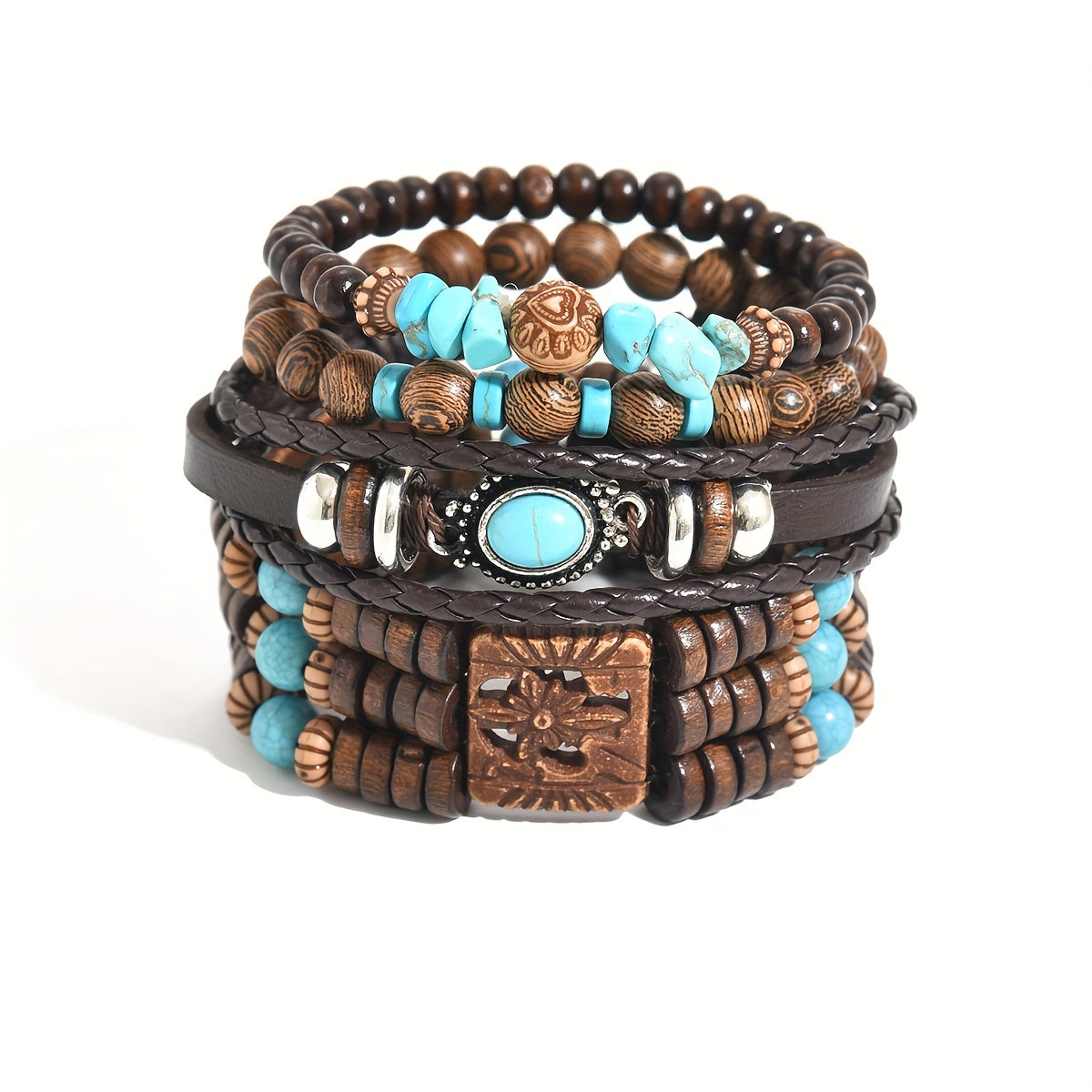 This set includes 4 vintage-style braided bracelets made of PU leather and featuring chicken wing wood and turquoise accents. Ideal as a Christmas or friendship gift.