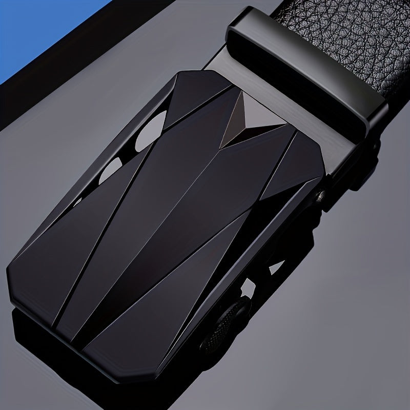This men's belt features a sleek faux leather strap with a textured pattern and an automatic alloy buckle. It offers comfort and style for everyday wear.