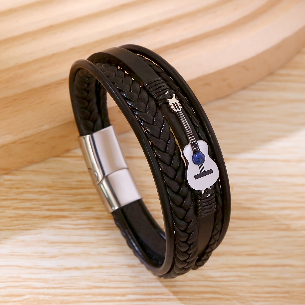 This stylish bracelet features a guitar charm on a braided faux leather band, perfect for parties or gifts. The band is adjustable to fit most sizes.