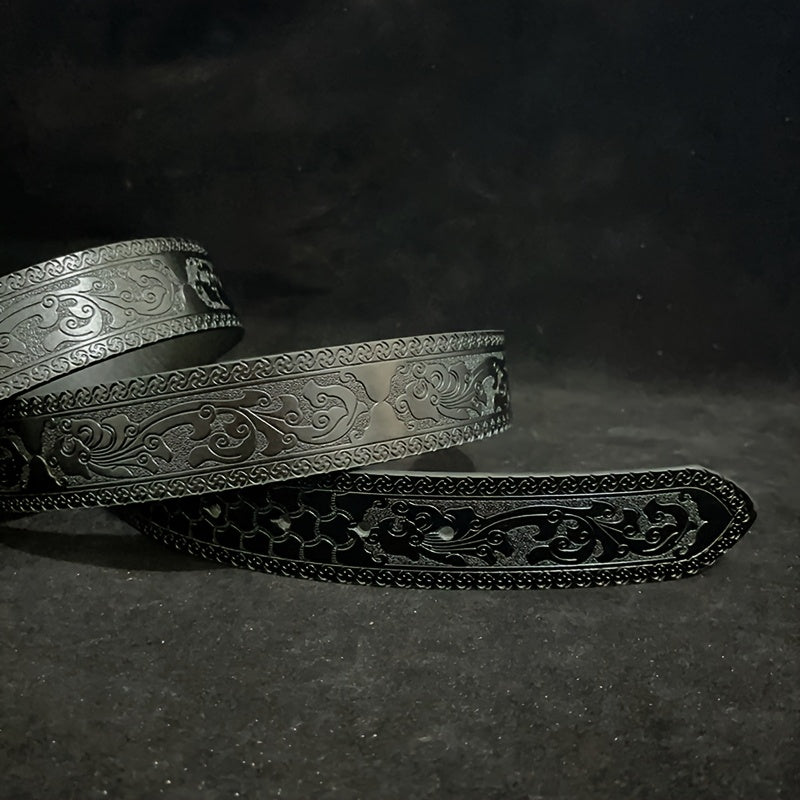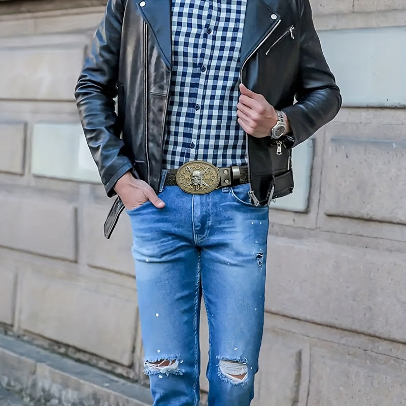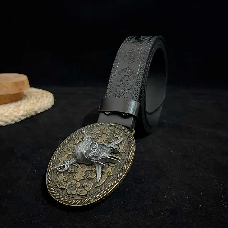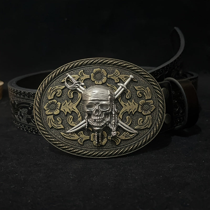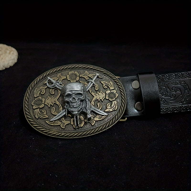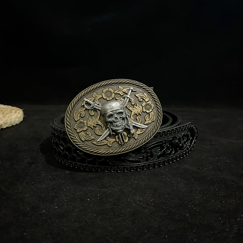 This men's belt features a unique design with a silvery pirate skull head buckle and golden pattern, perfect for adding a stylish touch to any outfit. Made of PU material, this belt is durable and suitable for jeans or cowboy attire.