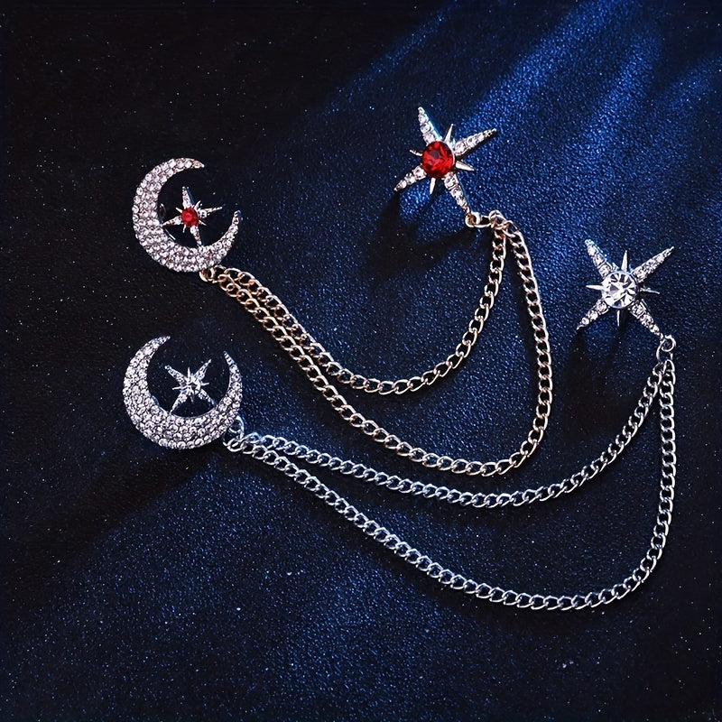 Add a touch of celestial style to your suit with this men's moon and star brooch featuring a tassel chain. Perfect for formal events or everyday wear.