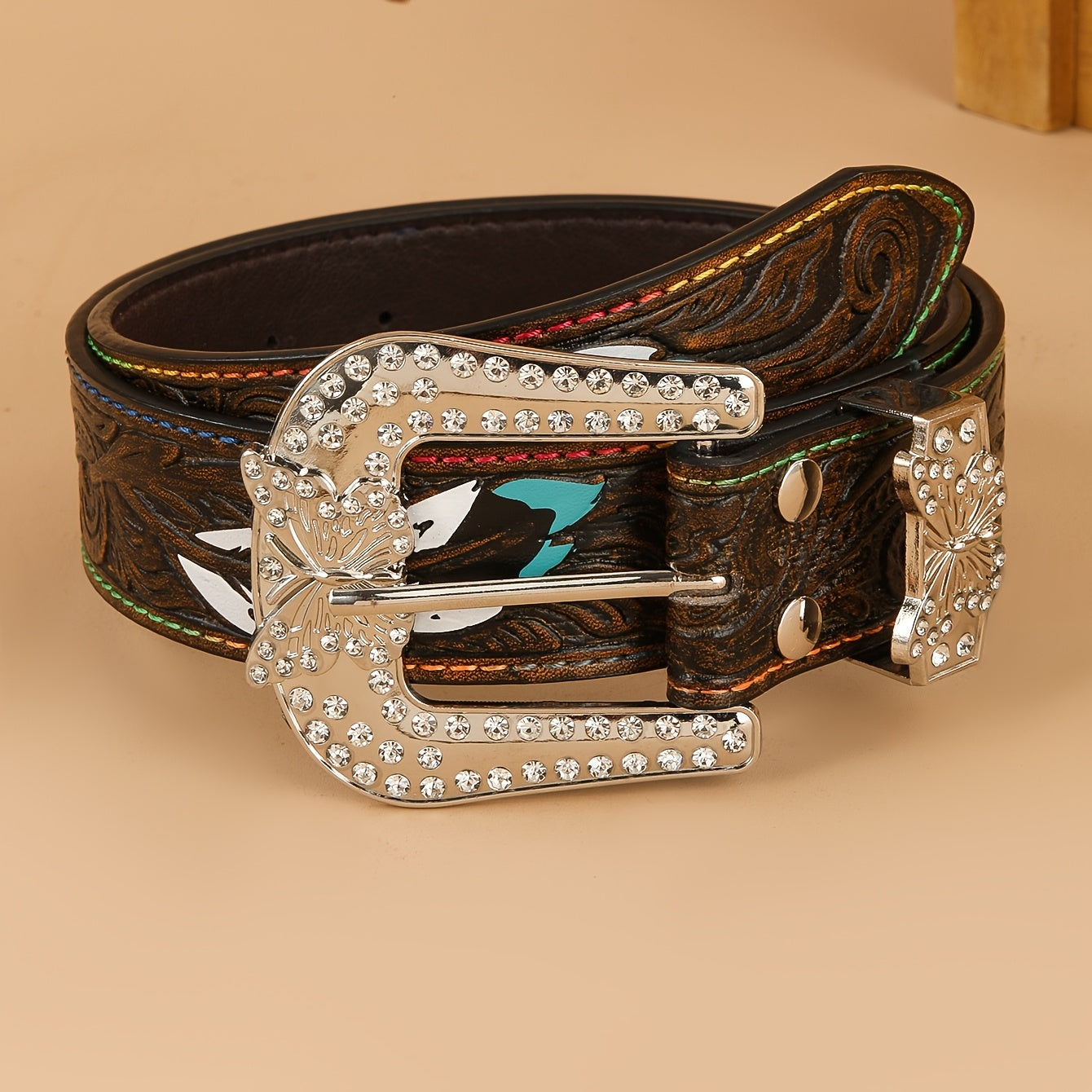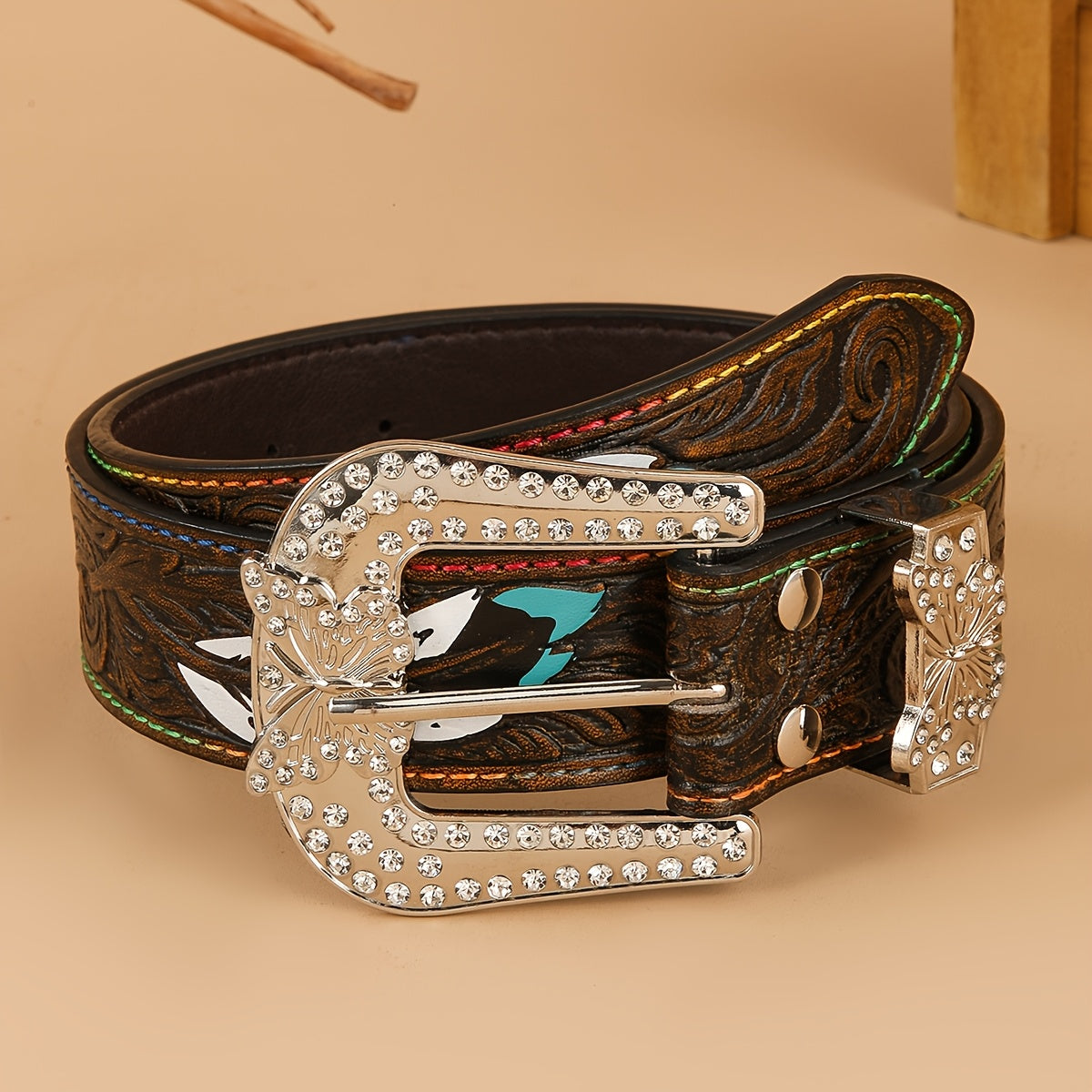 This vintage-style belt features an embossed alloy square buckle and is made of faux leather. Perfect for a punk look!