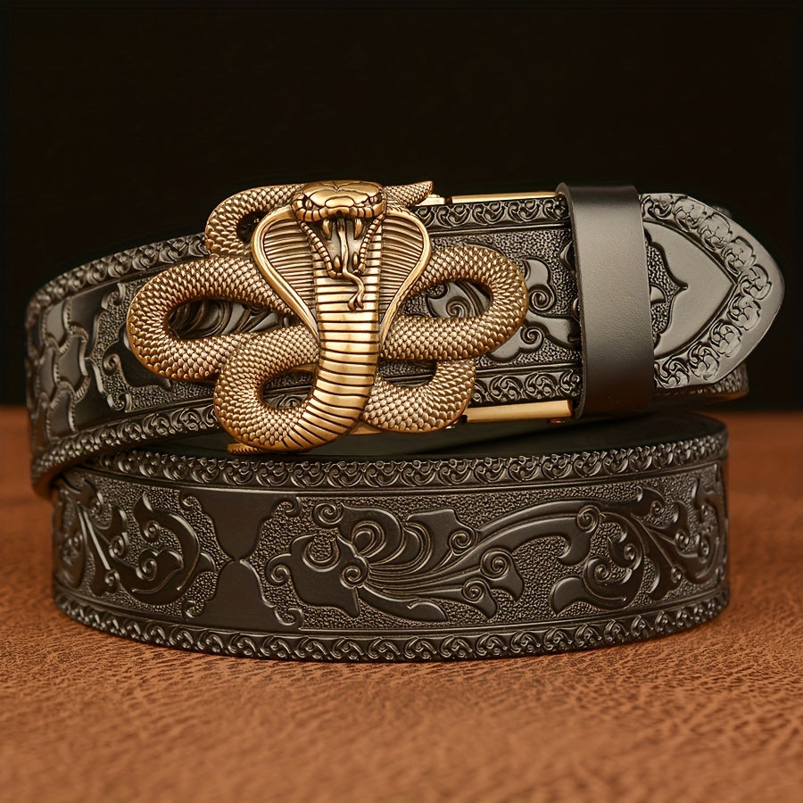 This belt is a stylish accessory for men made of high-quality cowhide with a retro automatic buckle design. It features intricate carvings on the leather and is perfect for casual wear. A great gift for husbands or partners.