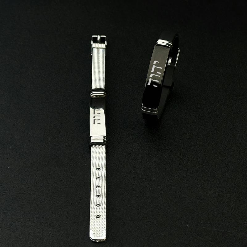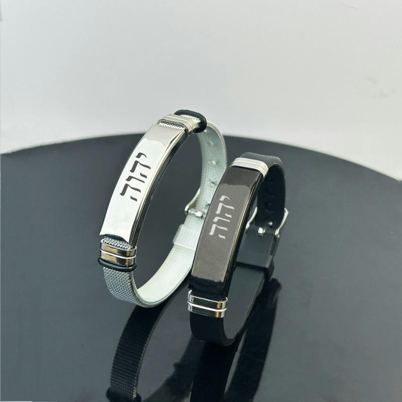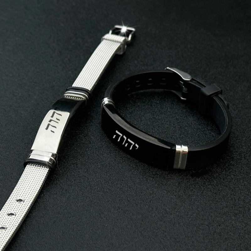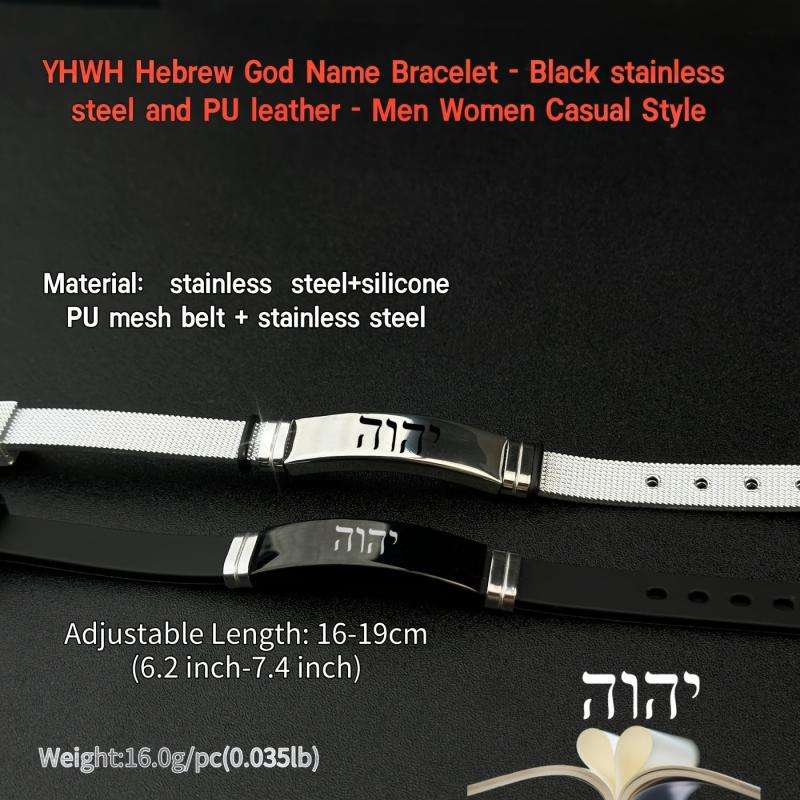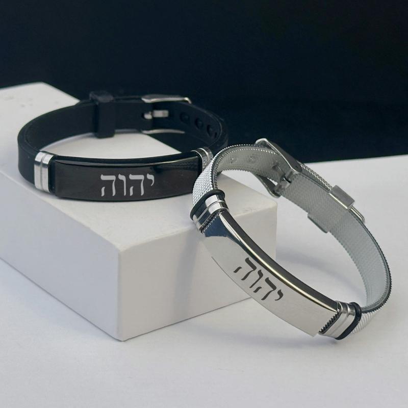 Casual style bracelet featuring the YHWH Hebrew God name design. Made of stainless steel with silicone leather cuff.