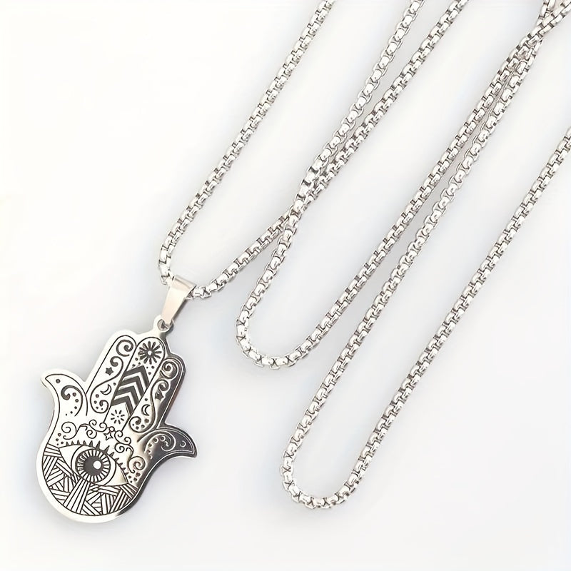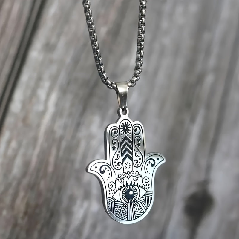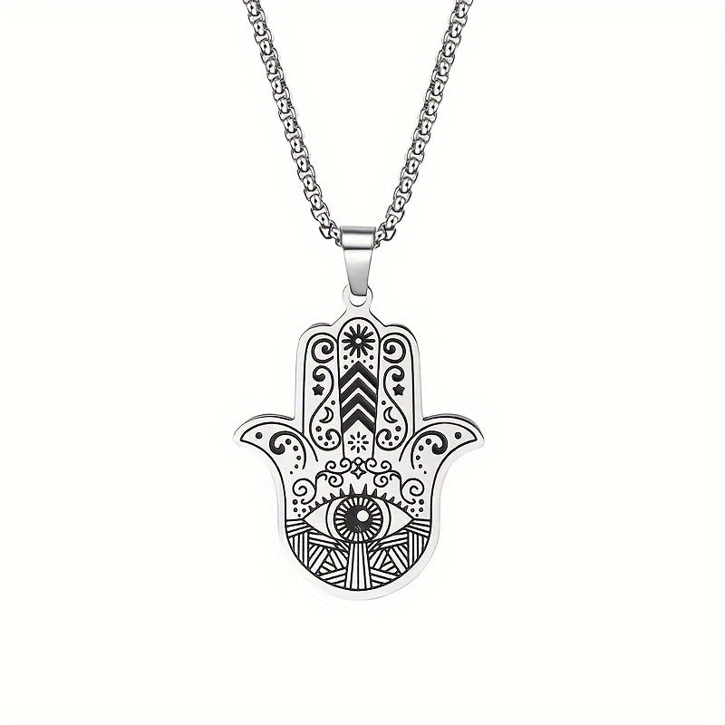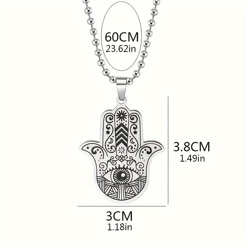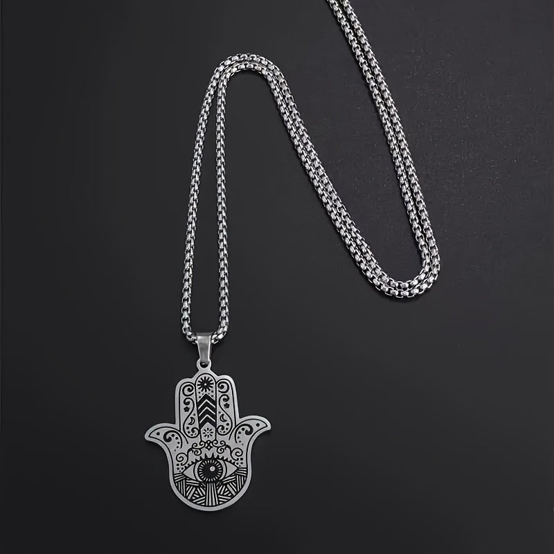 This classic palm-shaped pendant necklace features an evil eye Fatima design, suitable for both men and women. The silvery retro style adds a touch of elegance to any outfit.
