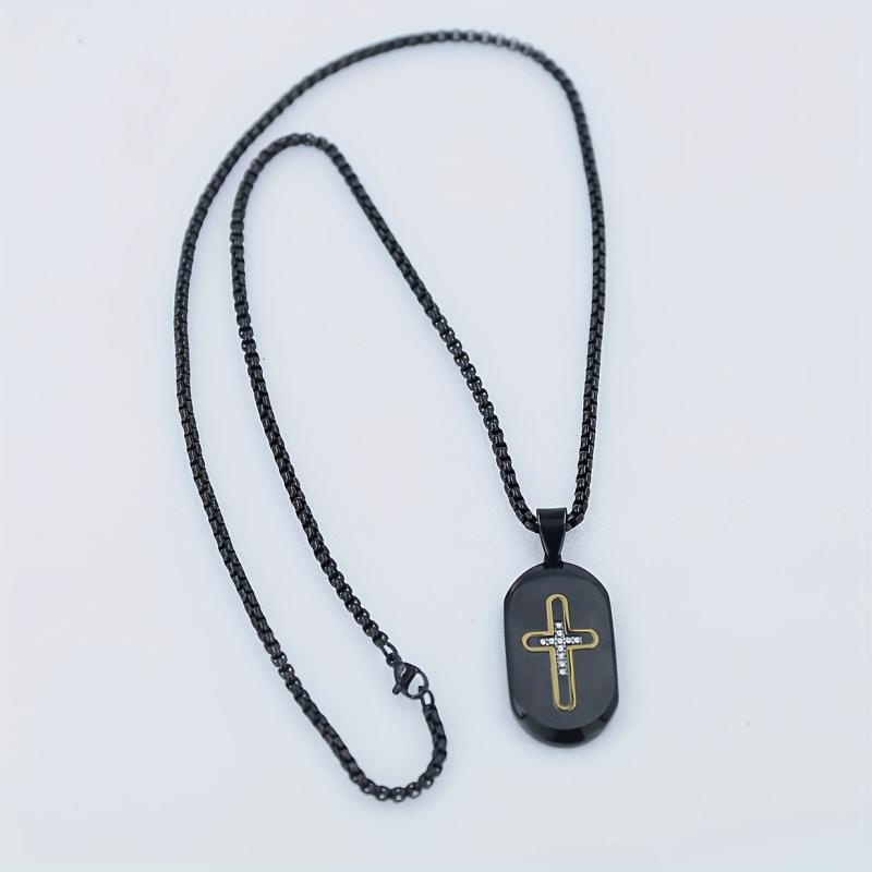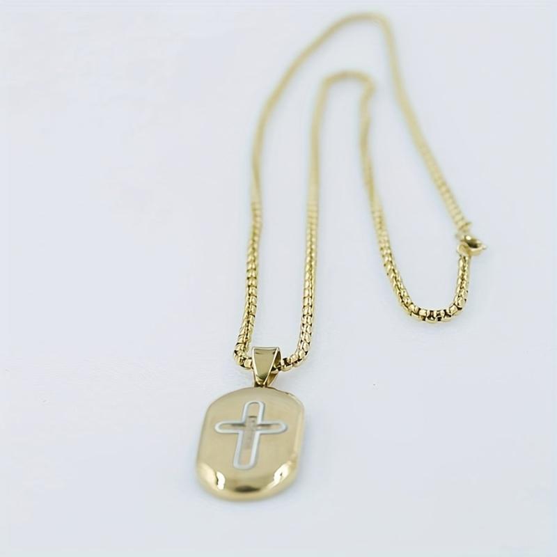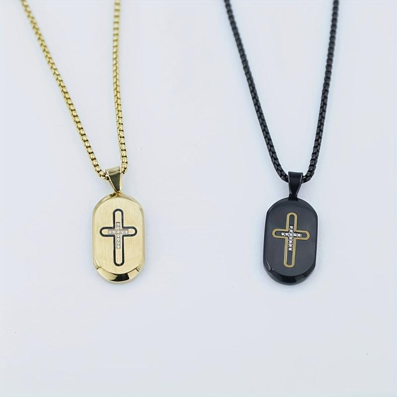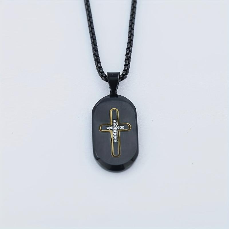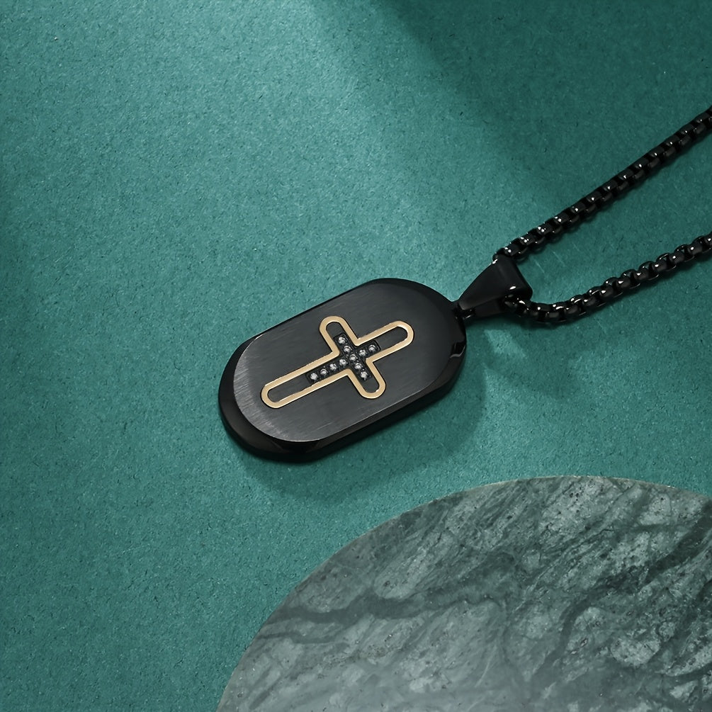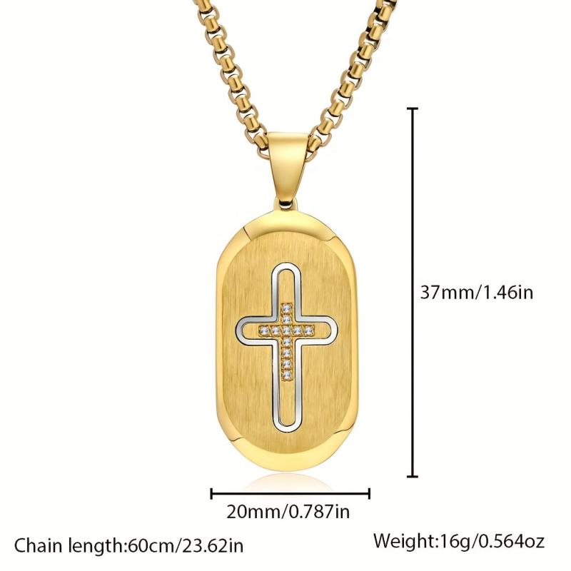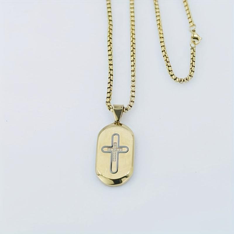 This stylish necklace is a perfect accessory for both men and women. Crafted from stainless steel, it features a golden cross pendant with cubic zirconia accents in a geometric design. An ideal birthday gift for him or her.