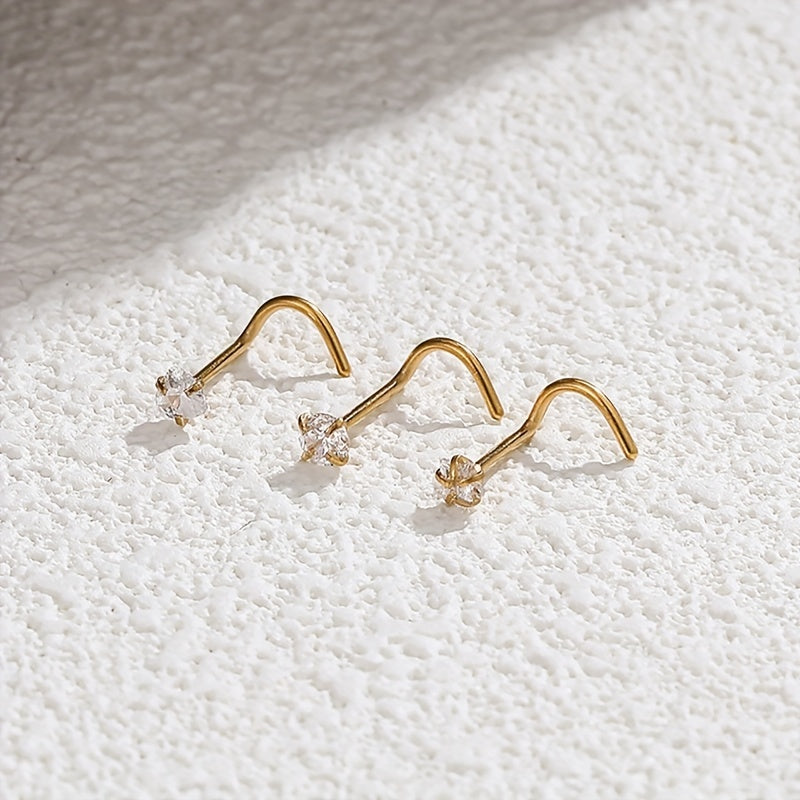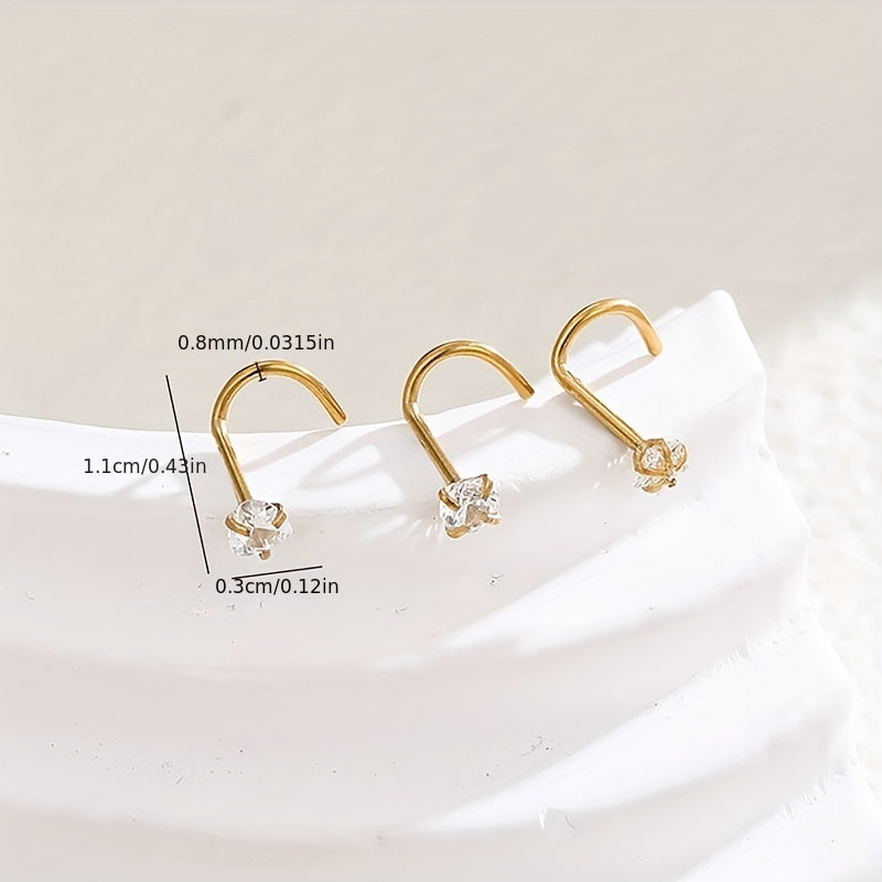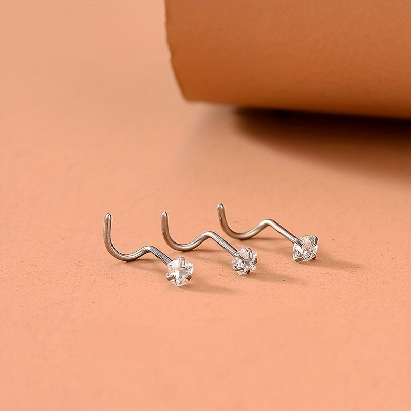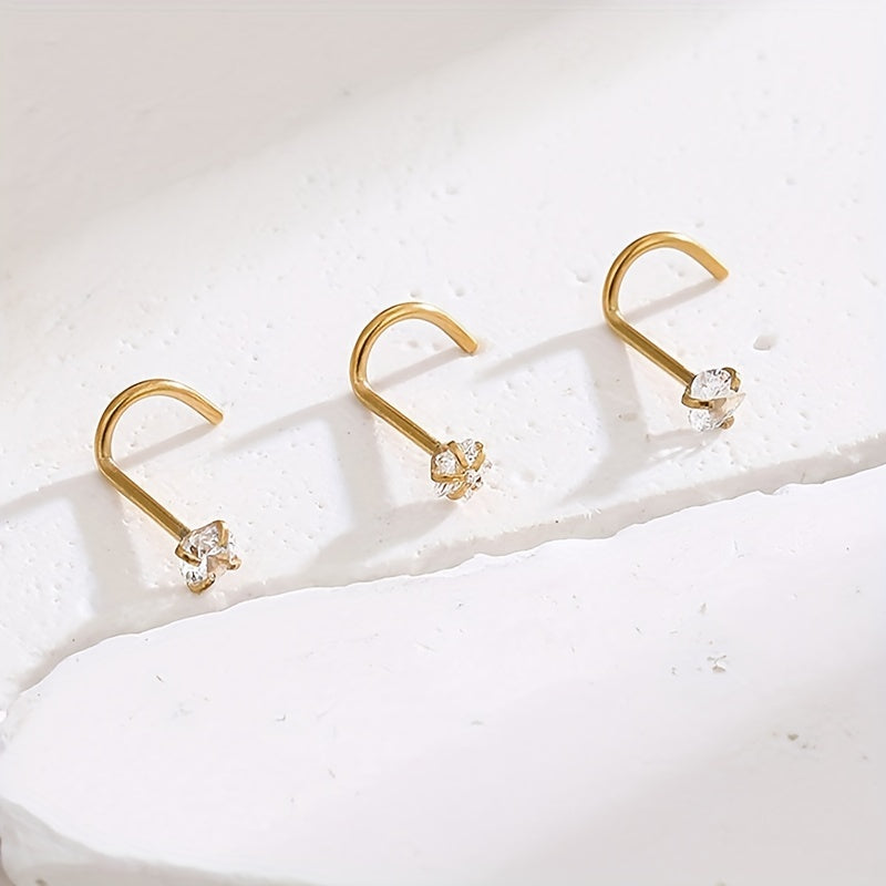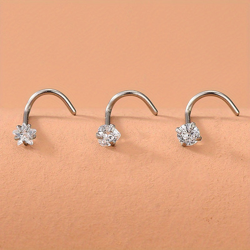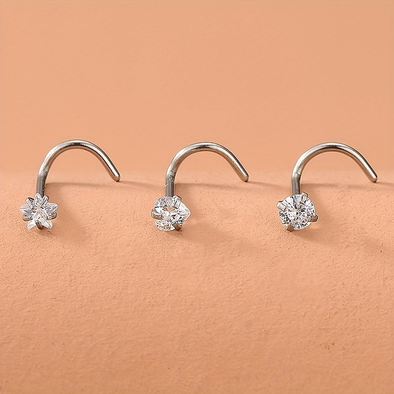Enhance your style with this set of 3 nose rings featuring inlaid zircon stones. Made of high-quality stainless steel, these nose nails are perfect for women and girls.