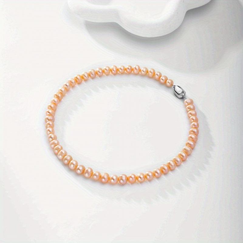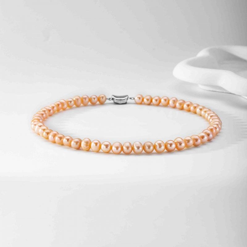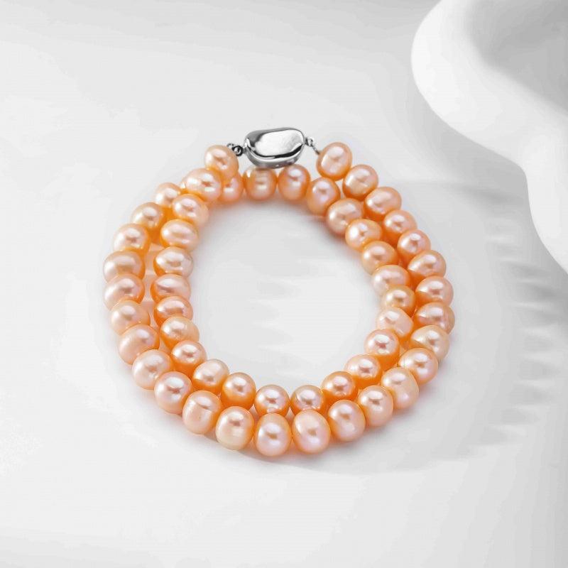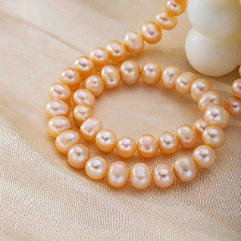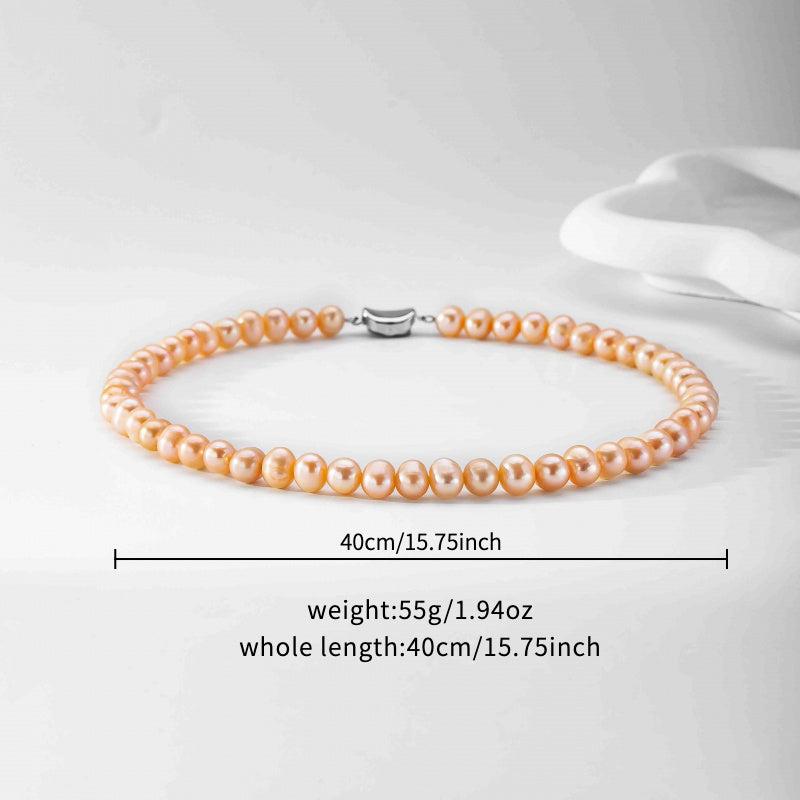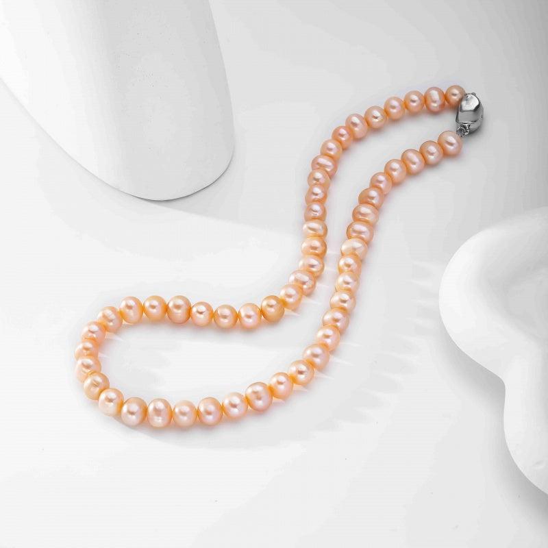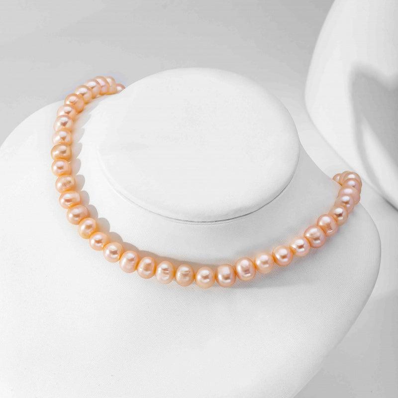 This stunning necklace features near round pink freshwater pearls in a vertical pattern. Each pearl is approximately 8-9mm in size with a beautiful pearlescent sheen. The large pointed freshwater pearls add a touch of elegance to this classic piece of jewelry.