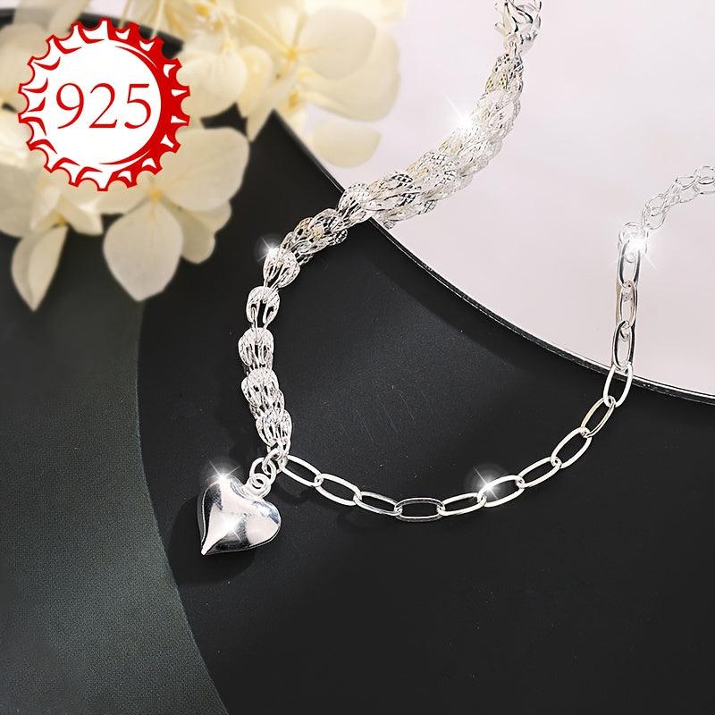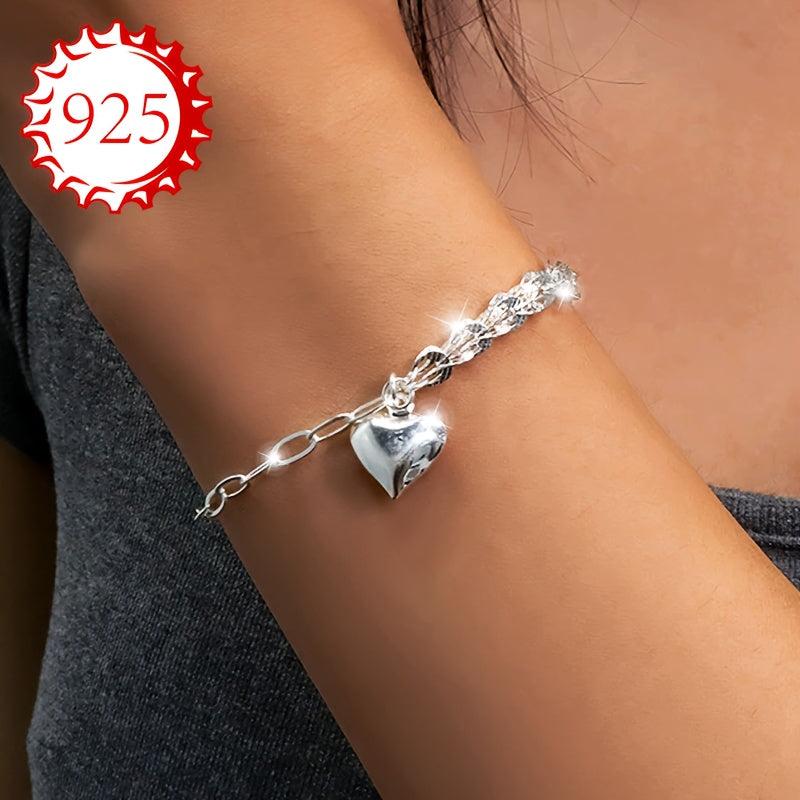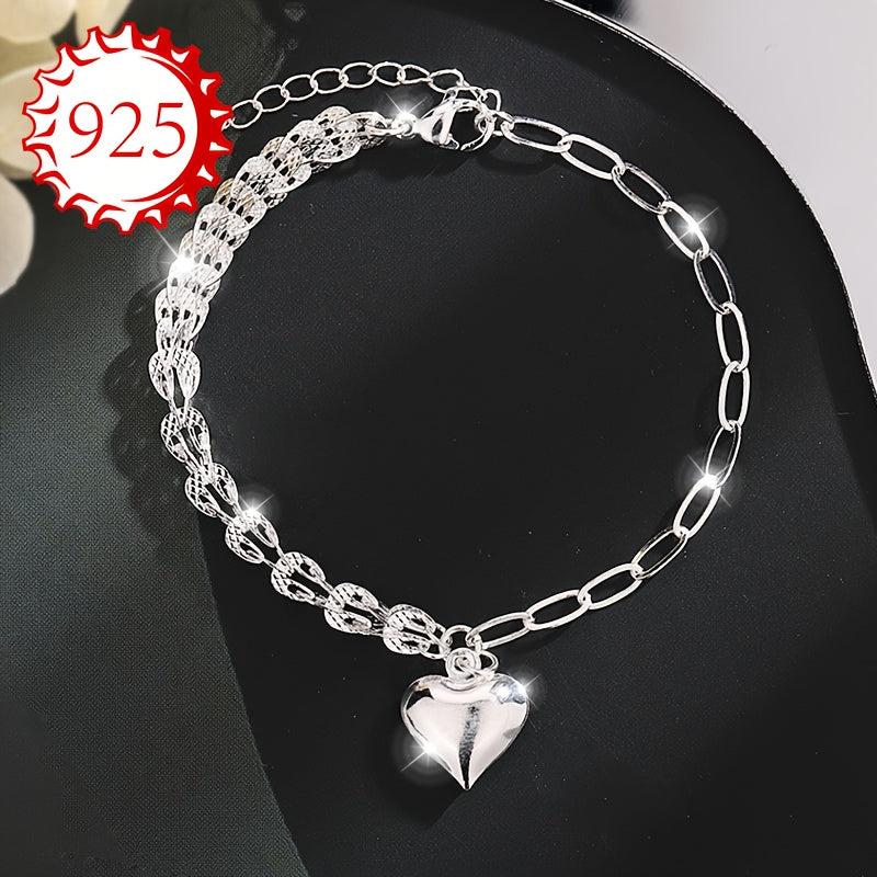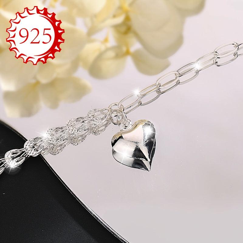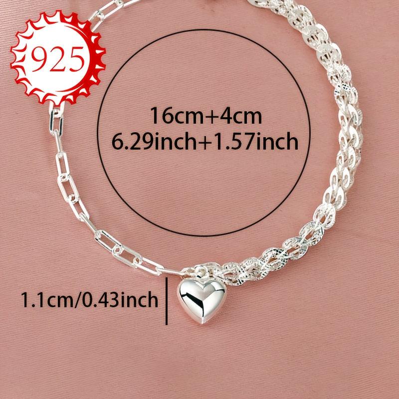 This 925 silver bracelet features an asymmetrical design with a feather and heart motif. It is low allergen, versatile, and makes a perfect gift for mothers, weddings, beach vacations, and more. Seasonless style.