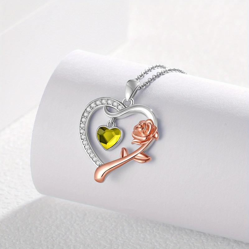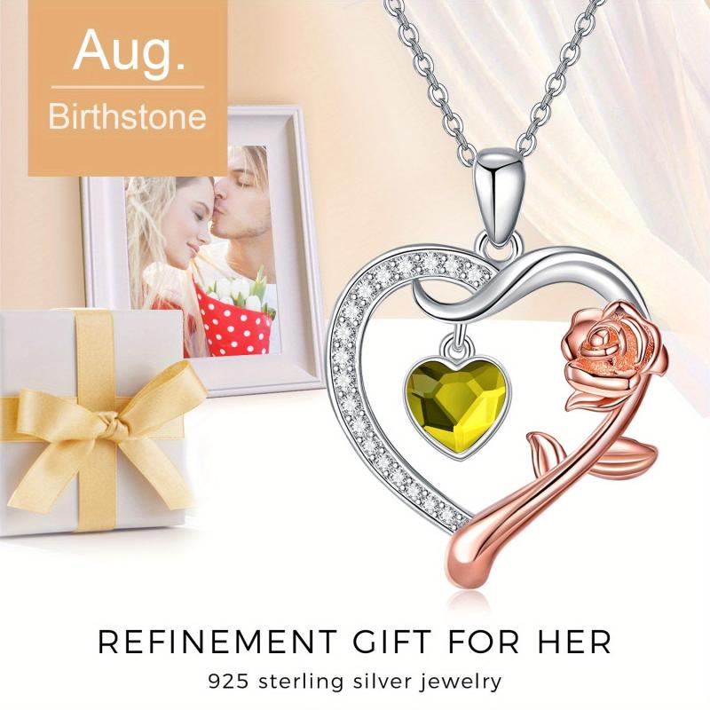 This stunning August birthstone necklace features a silvery 925 heart-shaped pendant with a rose golden accent. It makes a perfect gift for women, showcasing their birthstone in a beautiful piece of jewelry.