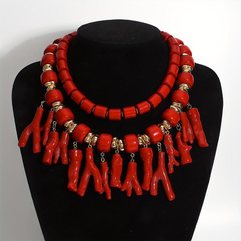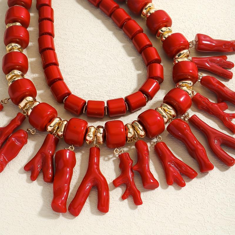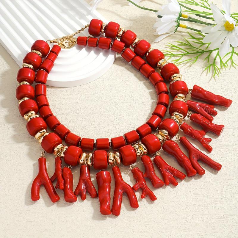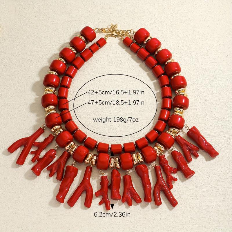 Enhance your beach party look with this 2pcs bohemian necklace set featuring red coral pendants. Perfect gift for friends and family!