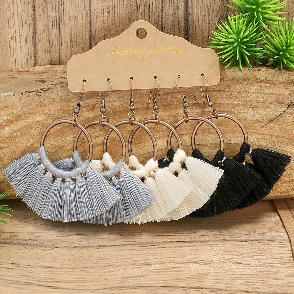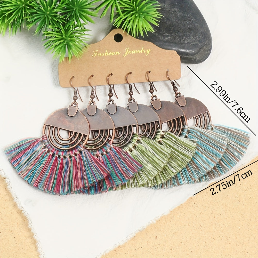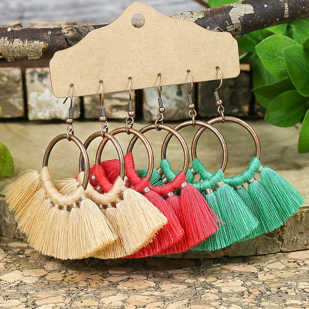 Enhance your bohemian style with this set of 3 pairs of earrings featuring multicolor fringe, bronze ring pendants, and ethnic designs. These earrings are perfect for adding a touch of flair to any outfit.
