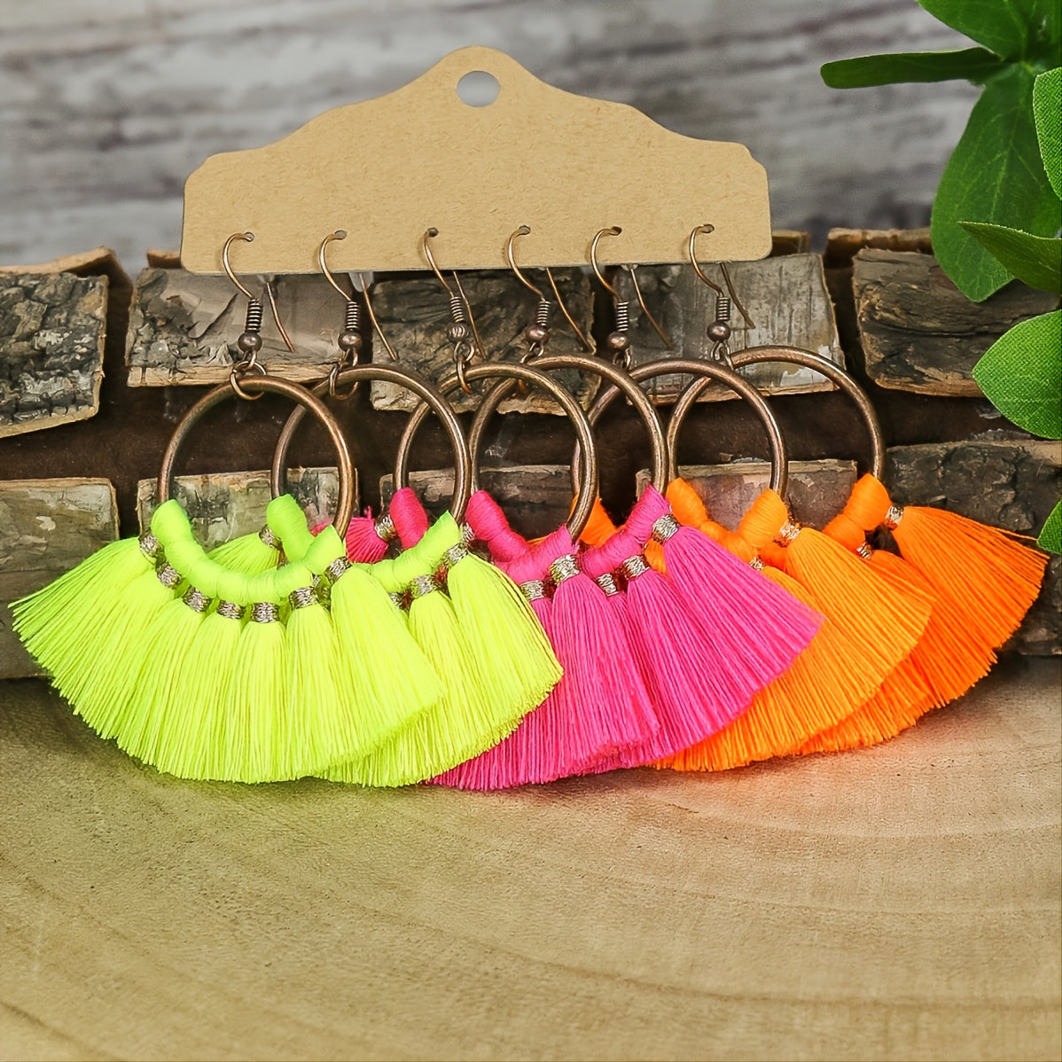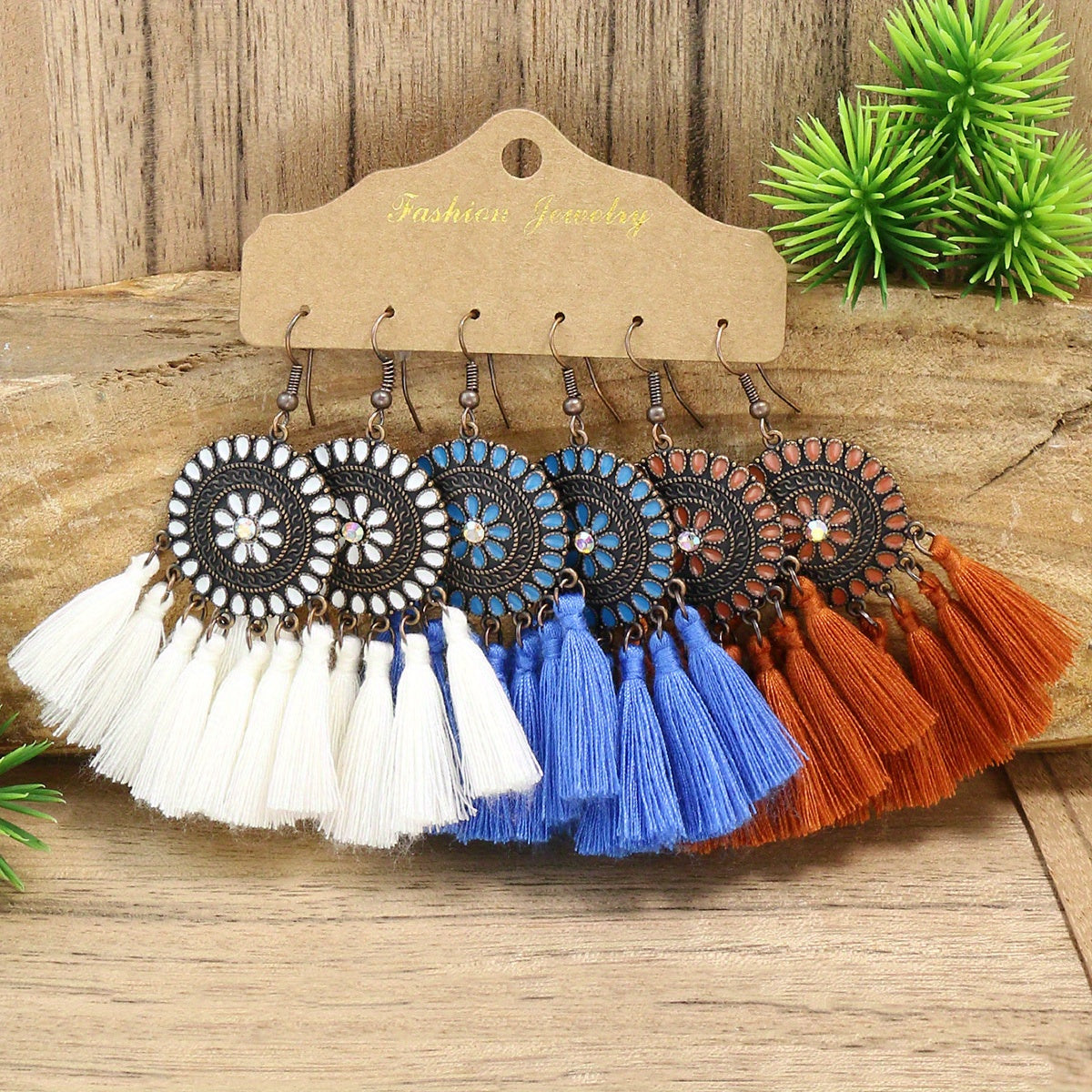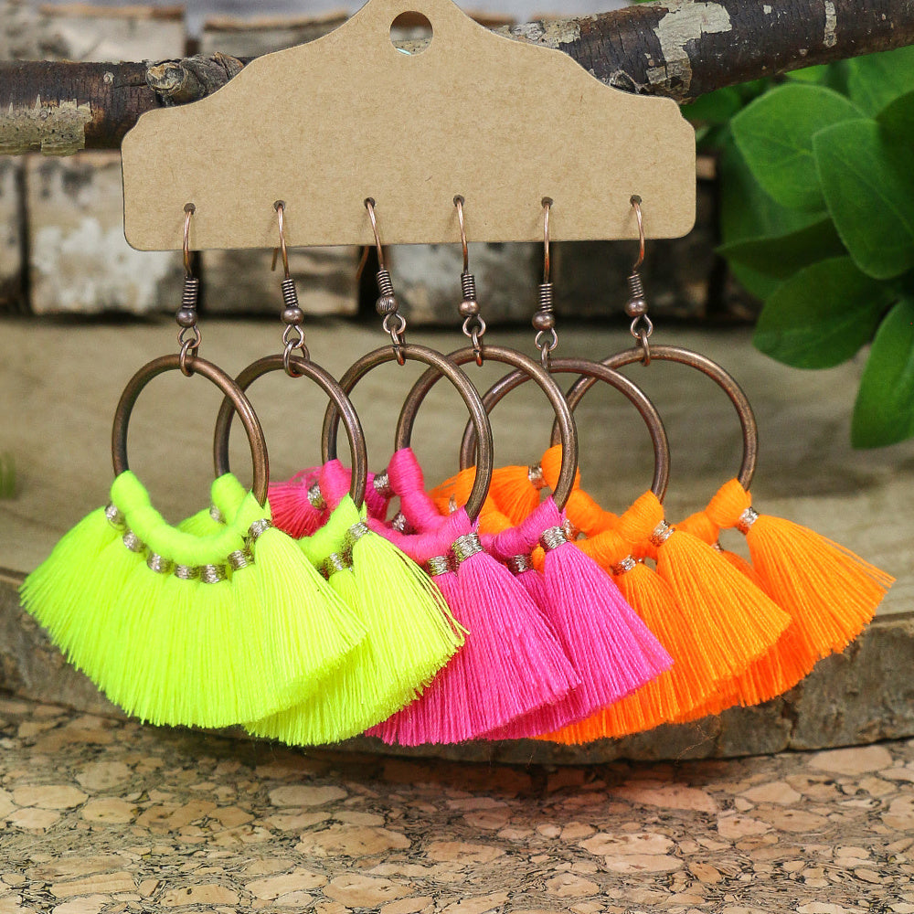 Enhance your bohemian style with this set of 3 pairs of earrings featuring multicolor fringe, bronze ring pendants, and ethnic designs. These earrings are perfect for adding a touch of flair to any outfit.