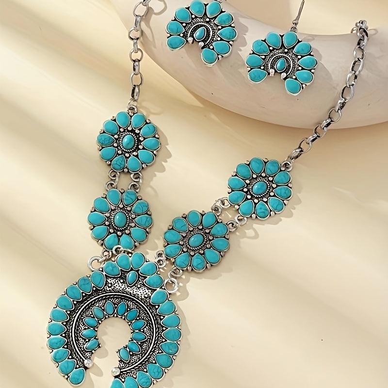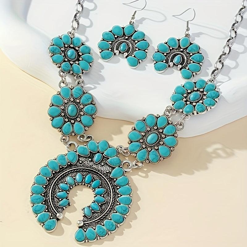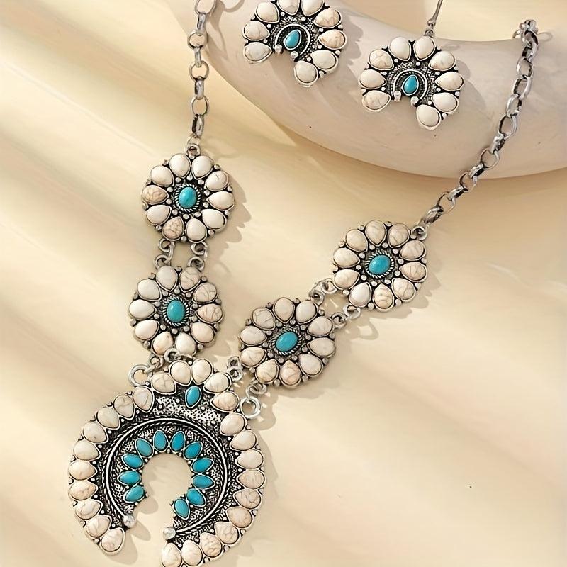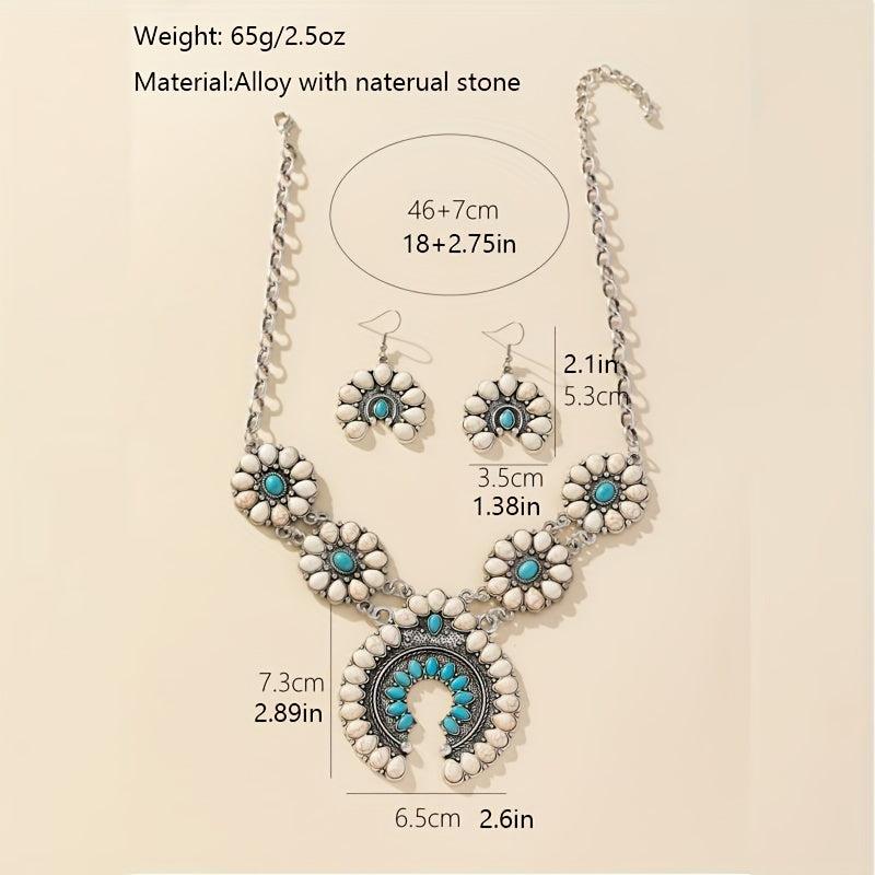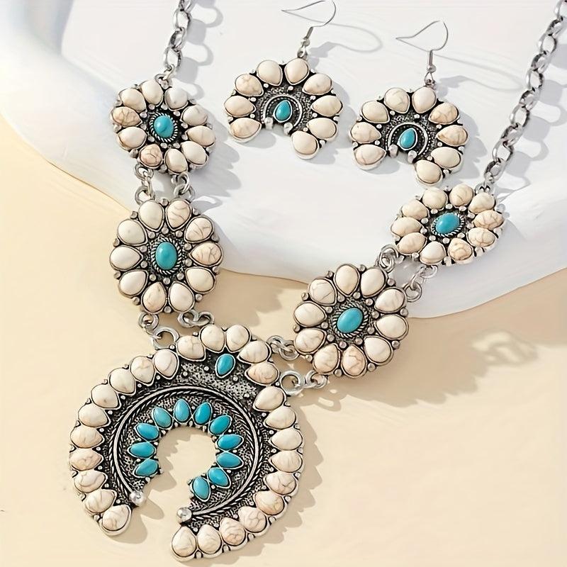 This vintage boho horseshoe pendant necklace and earrings set features synthetic turquoise on an alloy base, perfect for daily wear or as a gift for someone special.