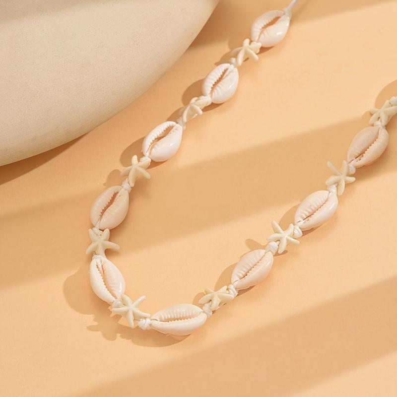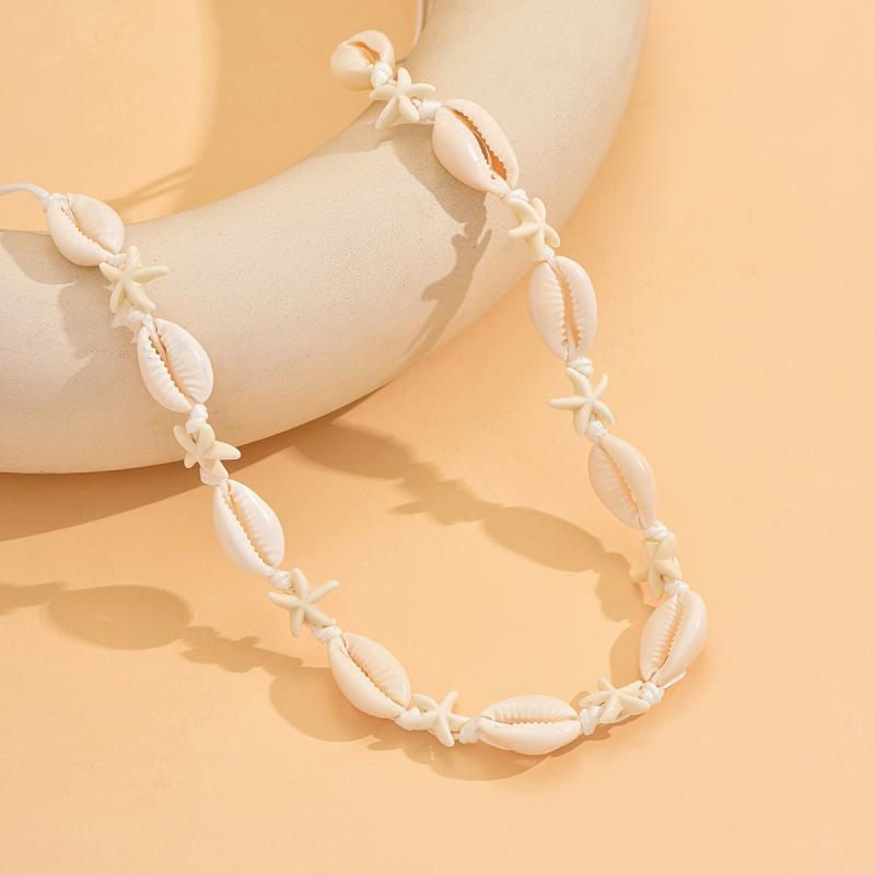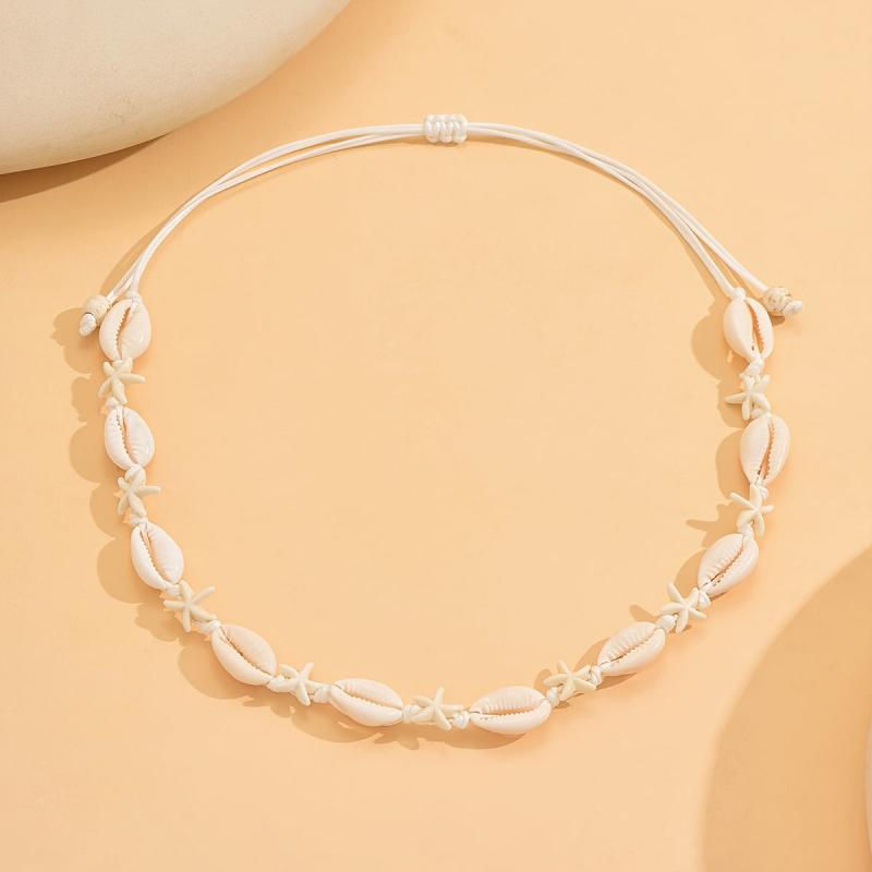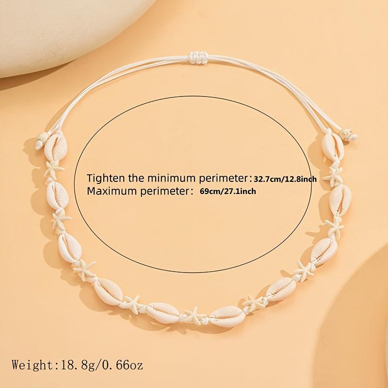 Elevate your beach style with this adjustable bohemian necklace featuring a shell and starfish pendant adorned with synthetic turquoise beads on a cord. Perfect for casual attire and beach vacations.