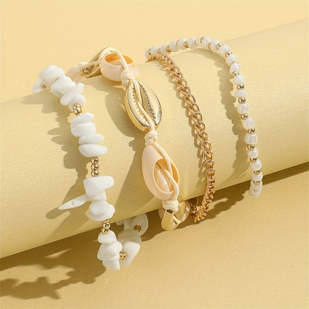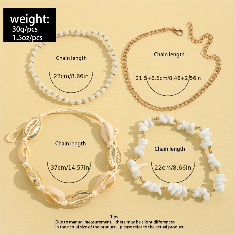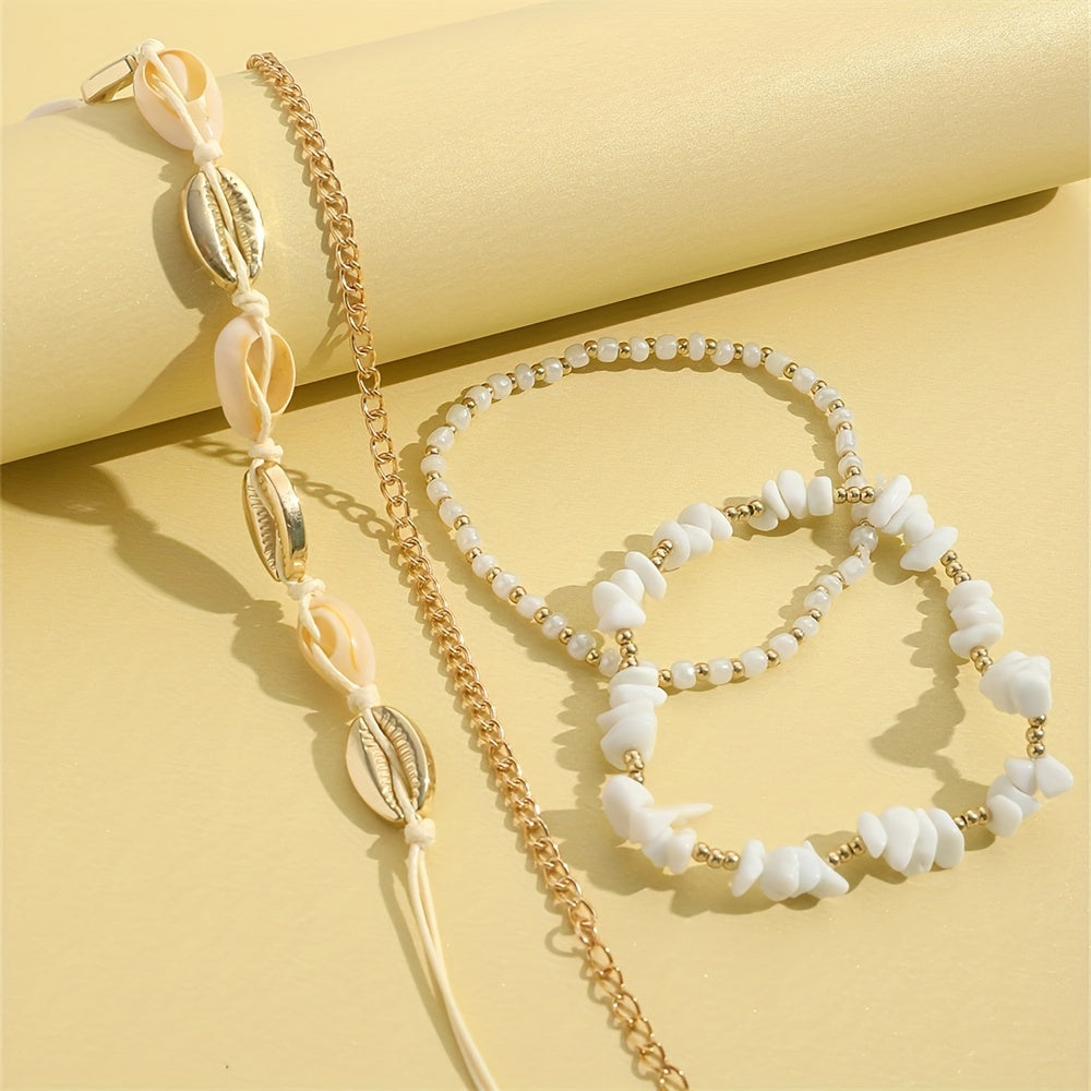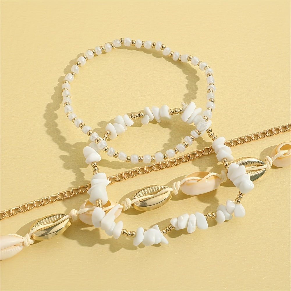 Elevate your beach look with this stylish anklet set featuring shell beads, chip stone beads, and a braided design. Perfect for stacking and adding a touch of boho flair to your summer outfit.