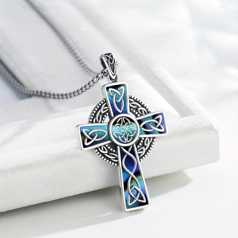 Elegant Irish Celtic cross pendant made of 925 sterling silver with intricate details and vibrant abalone shell inlay.