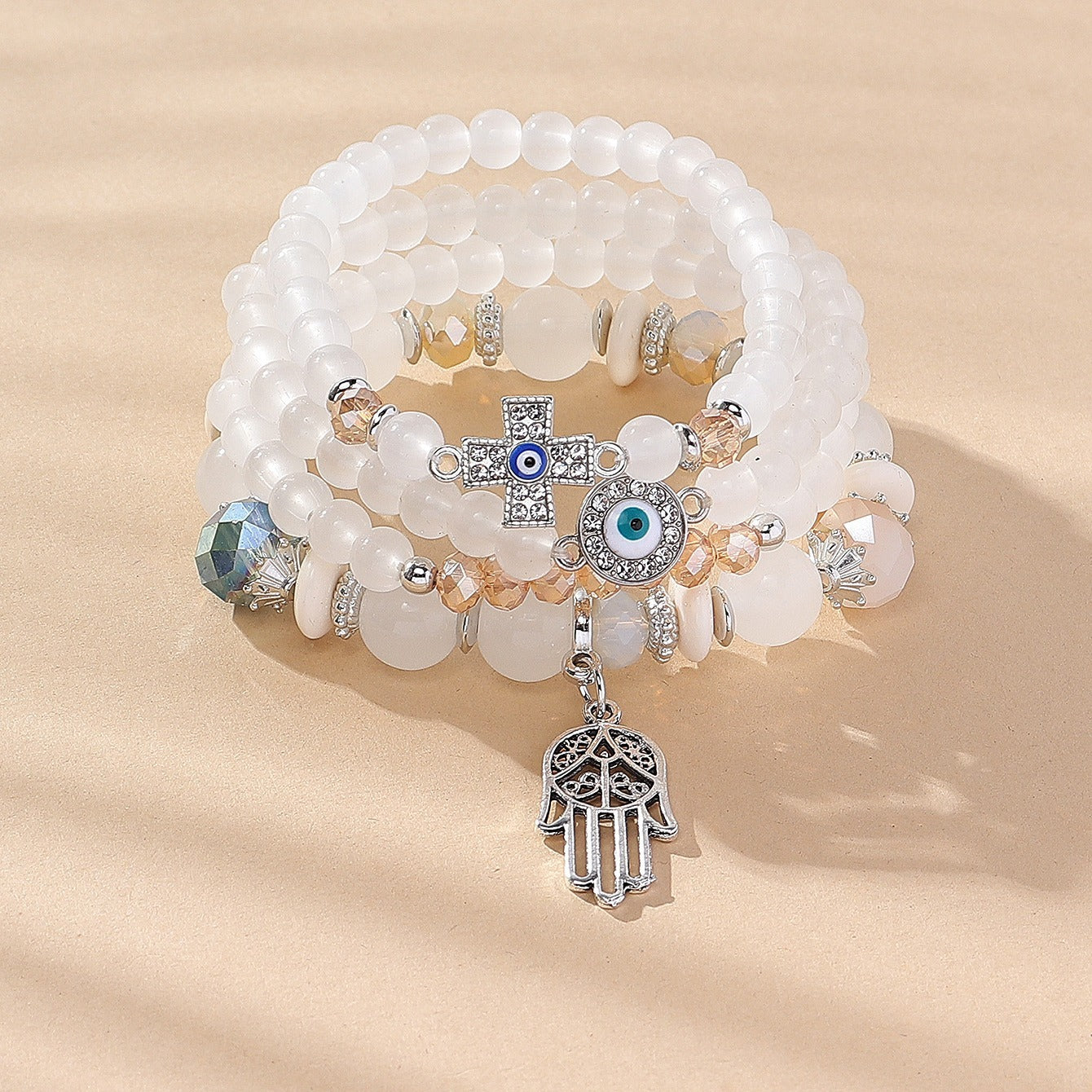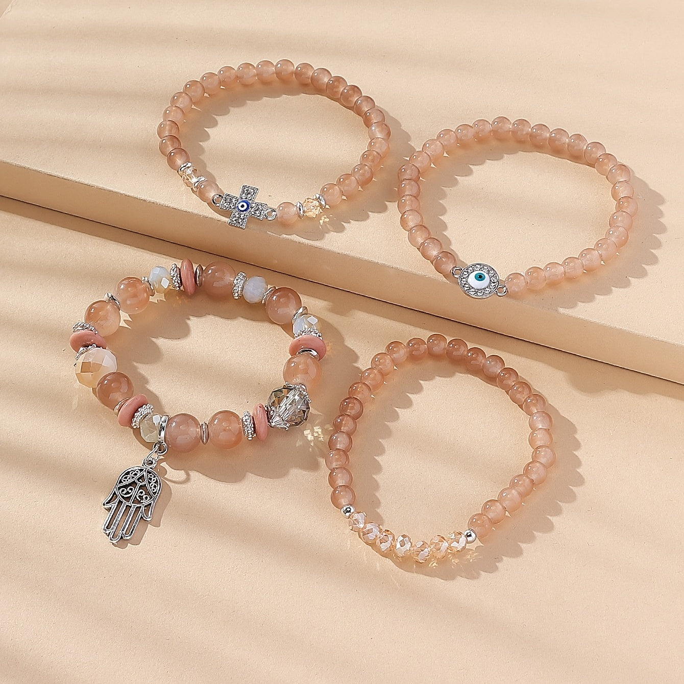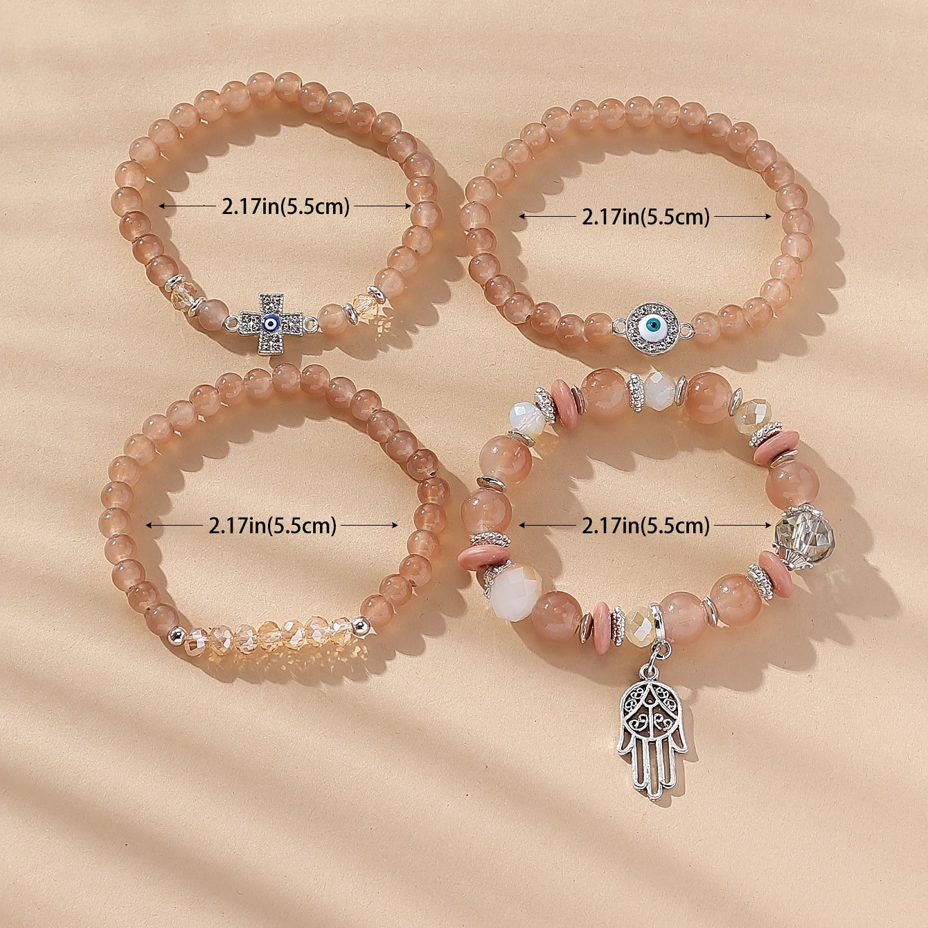 Add a touch of creativity to your style with this 4pc set of hand beaded bracelets featuring a criss cross eyes design. Perfect for adding a fun and unique element to your outfit.