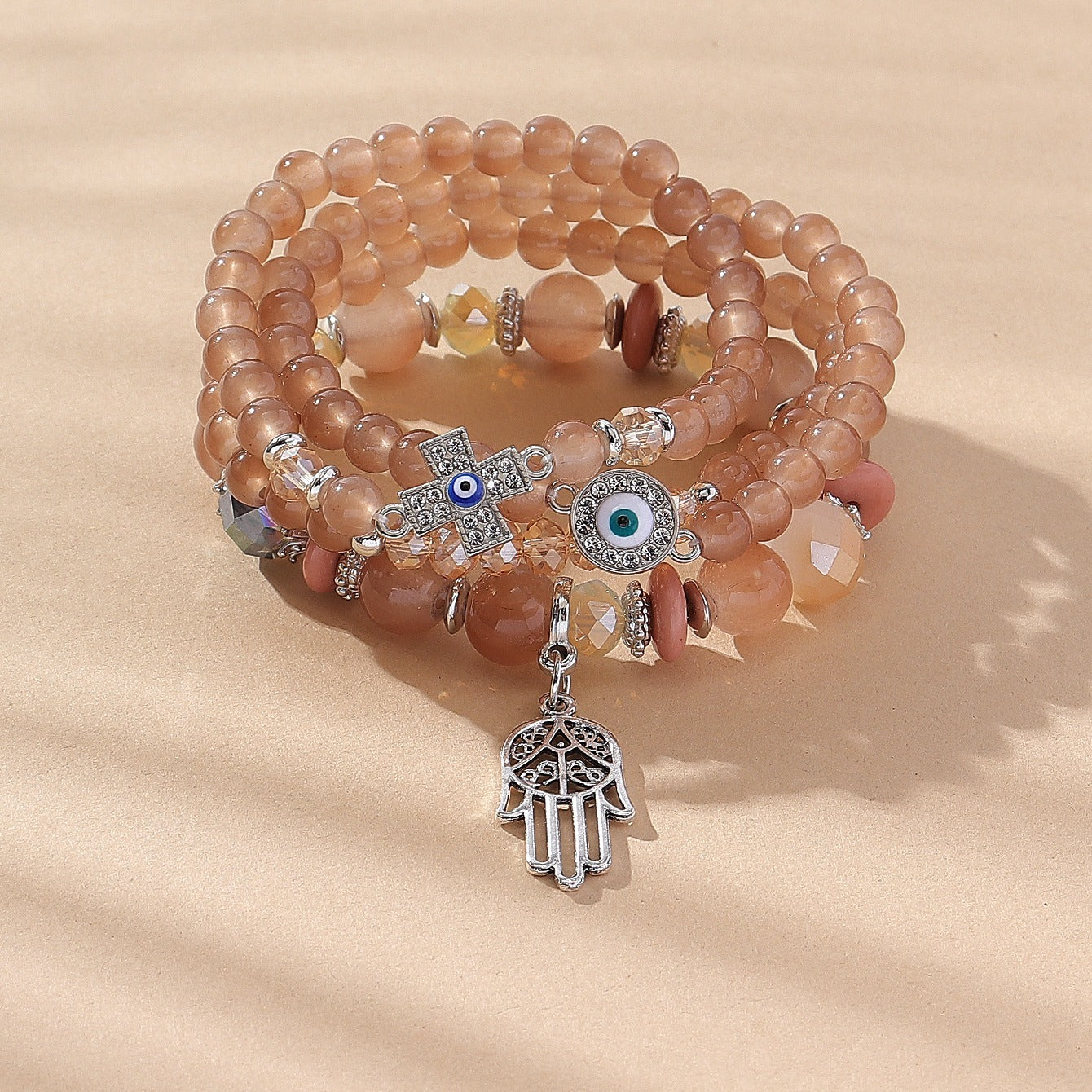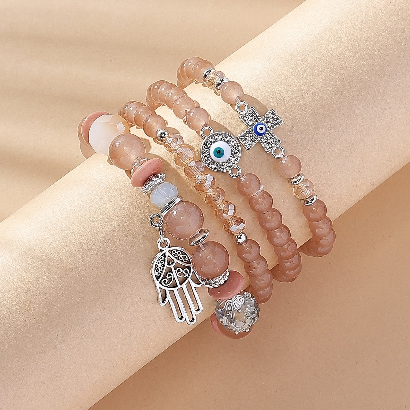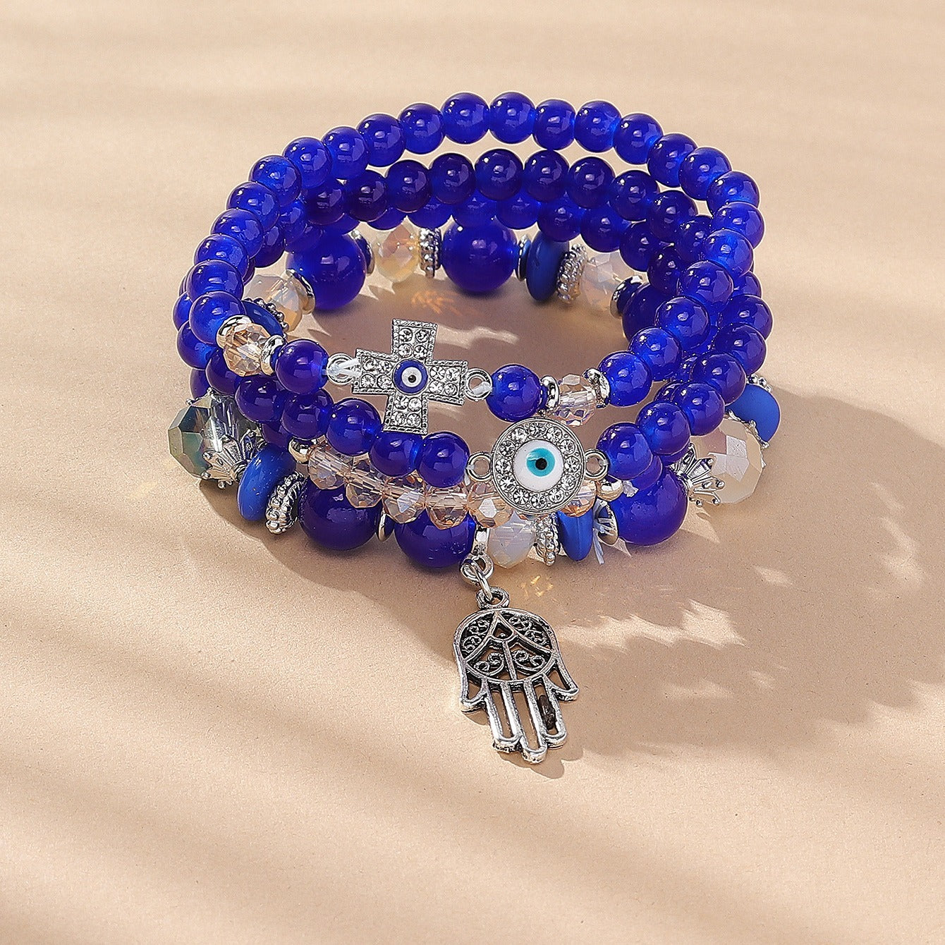 Add a touch of creativity to your style with this 4pc set of hand beaded bracelets featuring a criss cross eyes design. Perfect for adding a fun and unique element to your outfit.