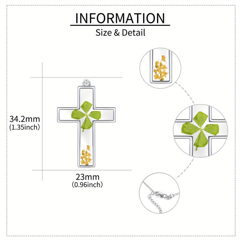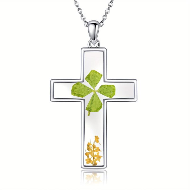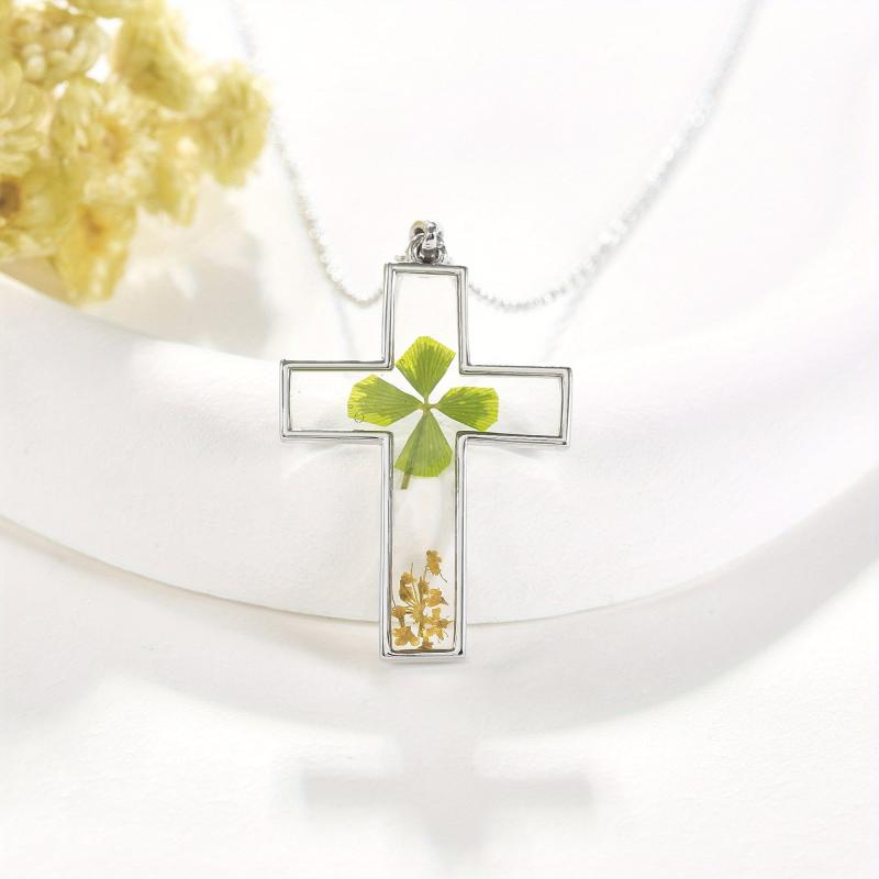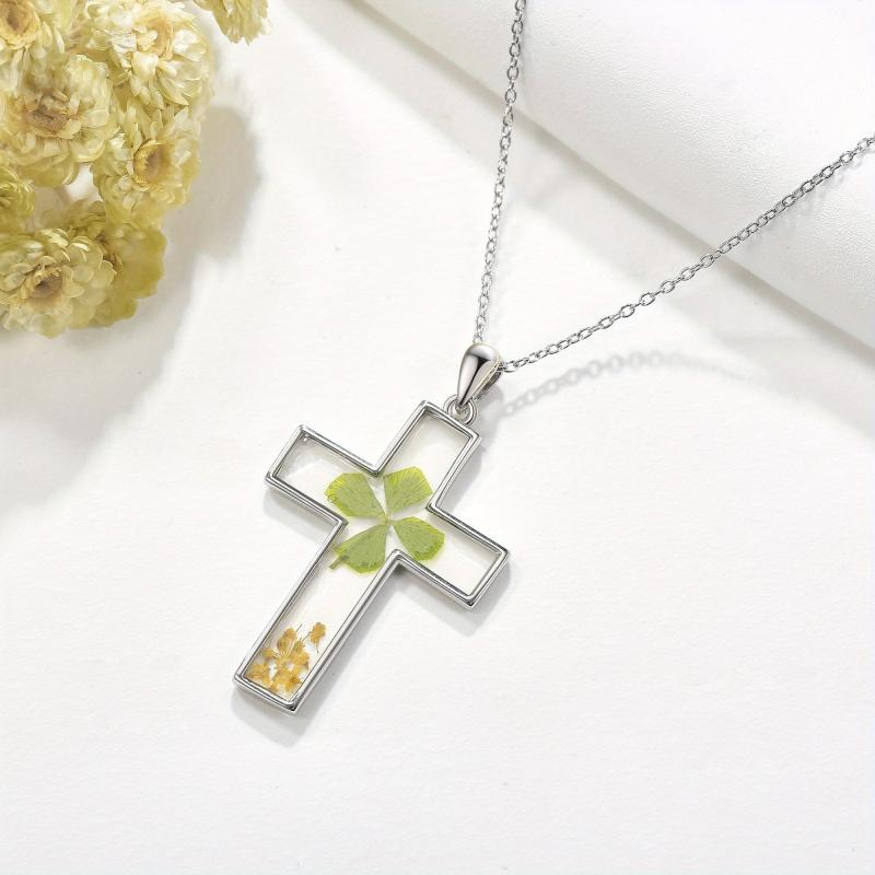 This beautiful necklace features a cross design with four leaf clovers and a unique pressed flower pendant. Made of sterling silver, it is a symbol of faith and nature's beauty.