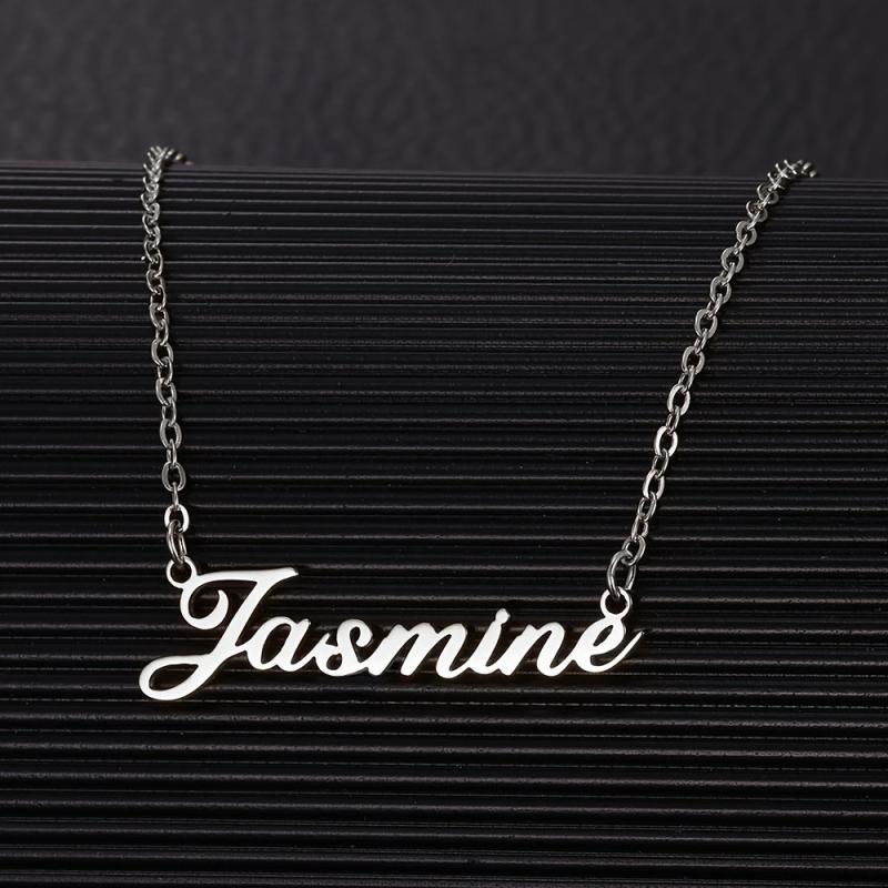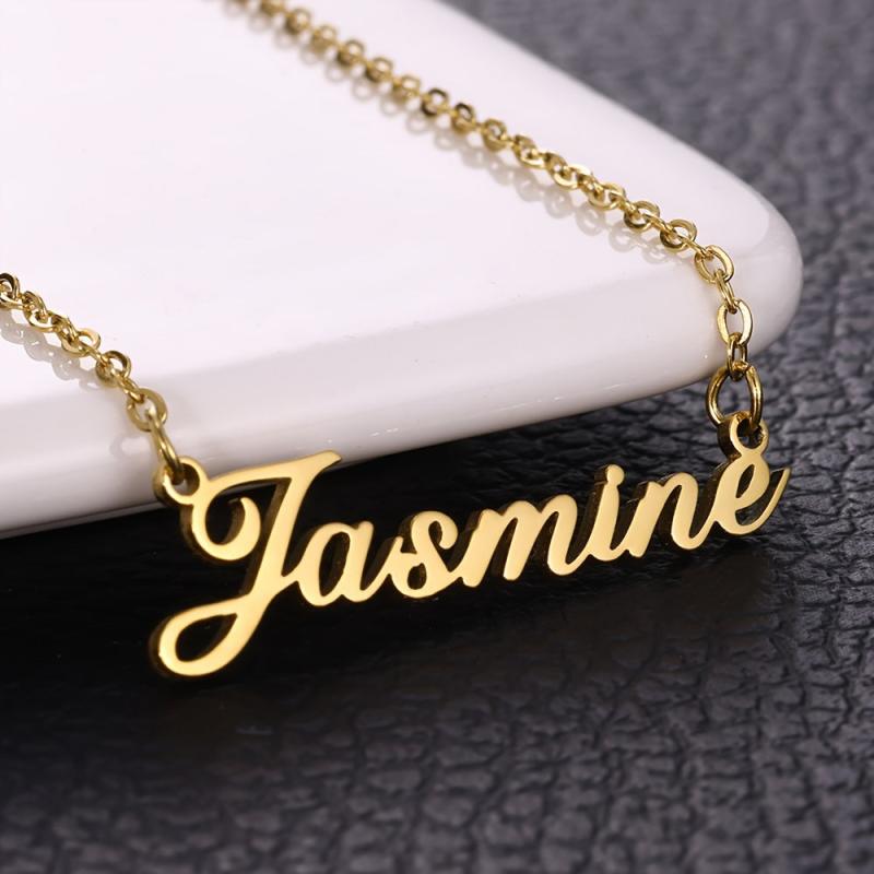 This custom cursive name necklace features a golden tone finish and a stainless steel chain. Personalize it with any name or word.