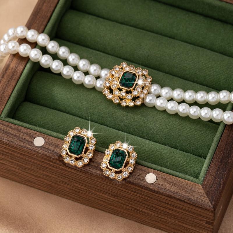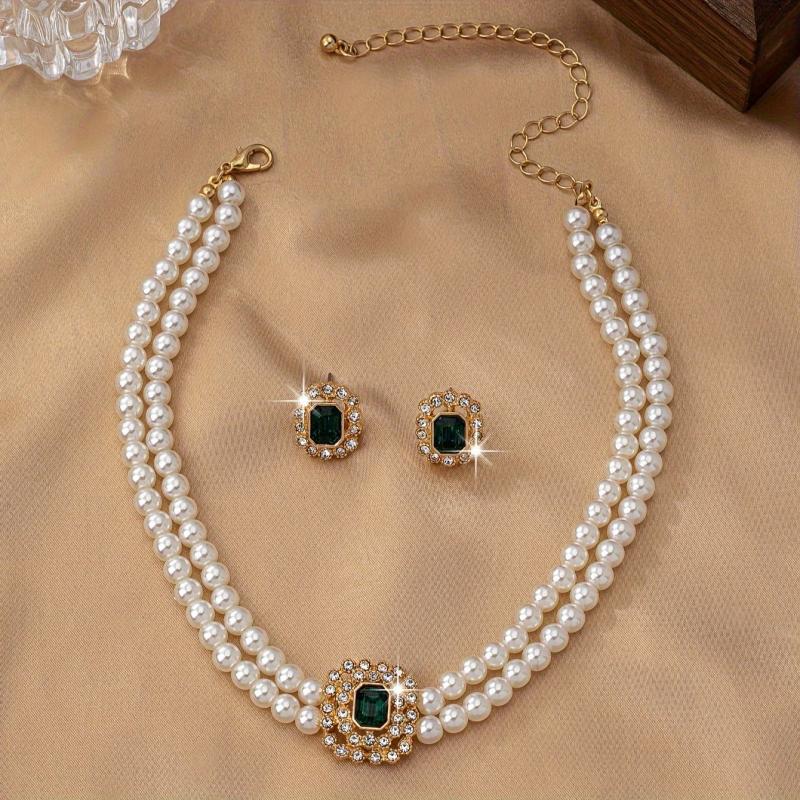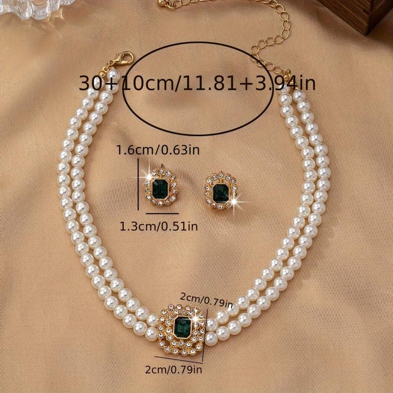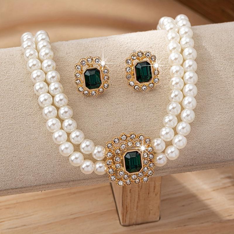 Elegant Faux Pearl Necklace & Stud Earrings Set with Rhinestones & Green Gems
