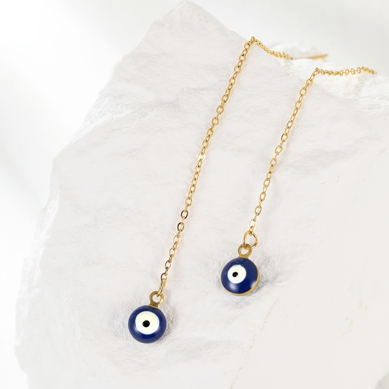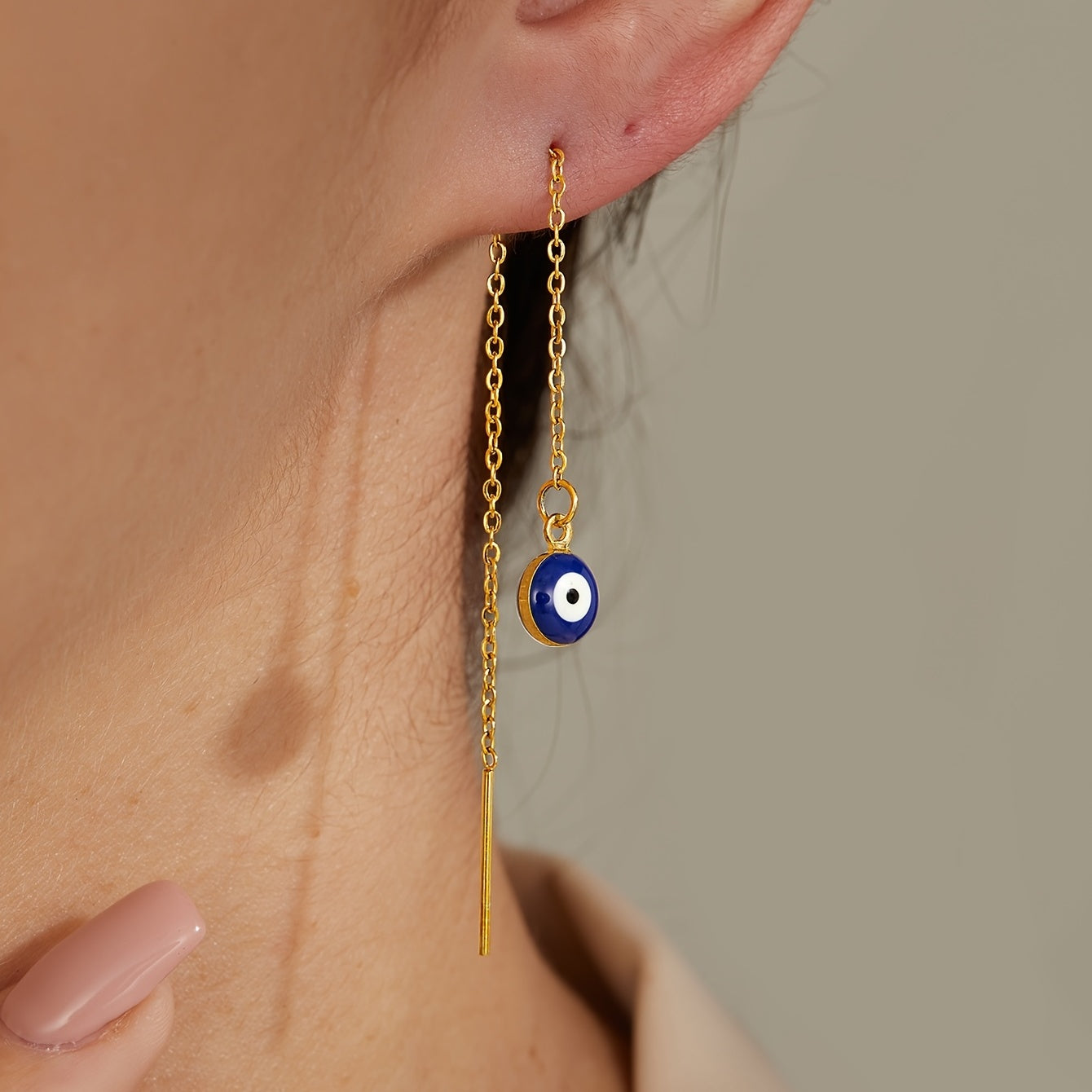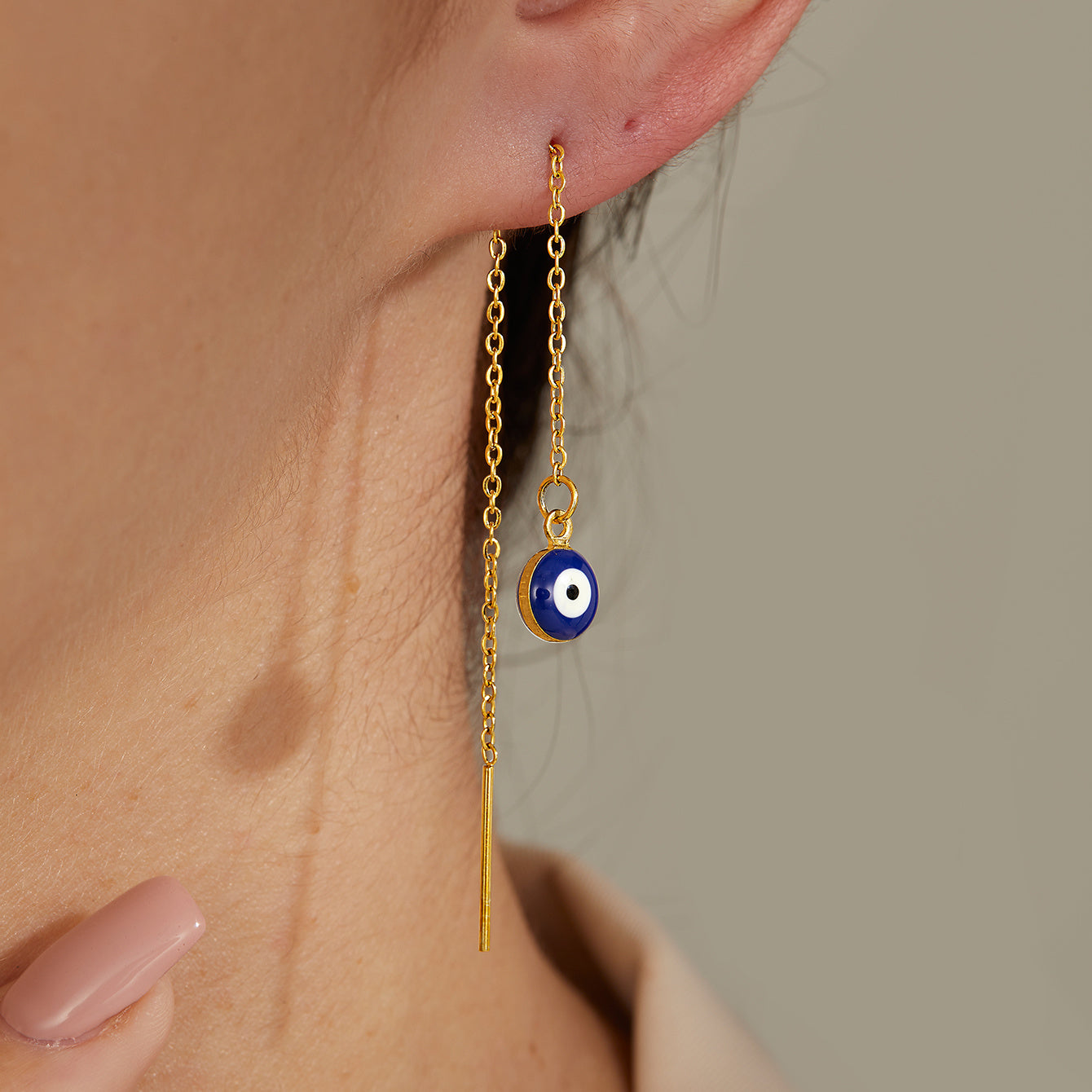 Add a touch of mystical charm with these Evil Eye linear earrings. Made from stainless steel with 18K gold plating, these earrings are versatile and eye-catching.