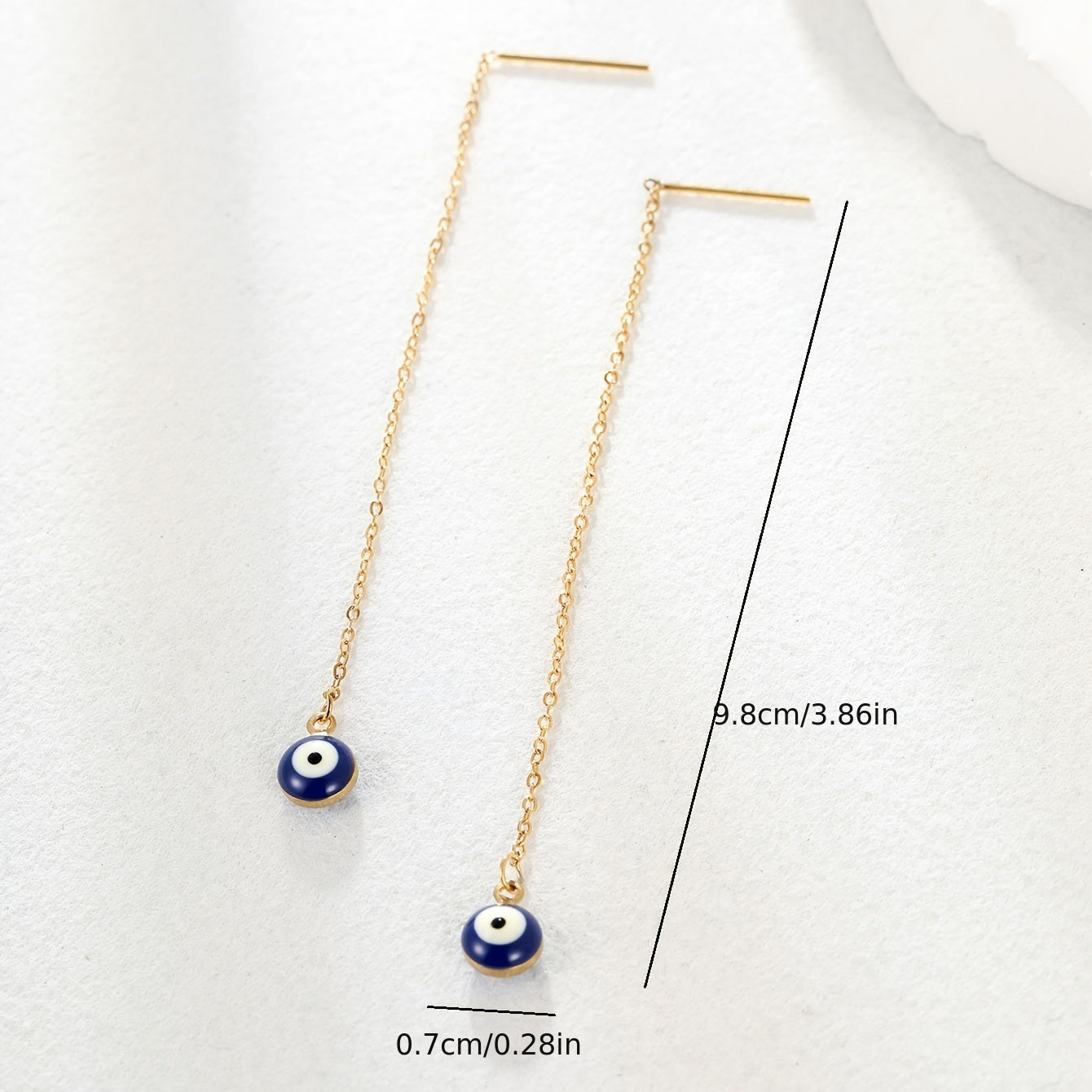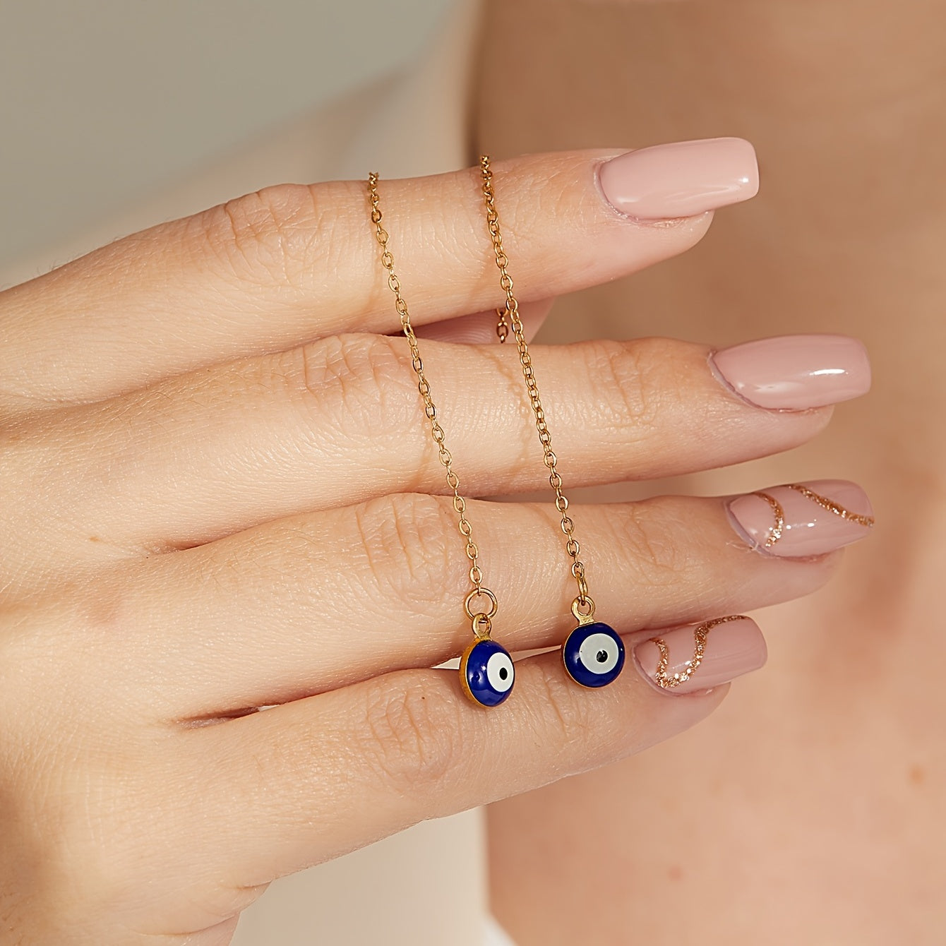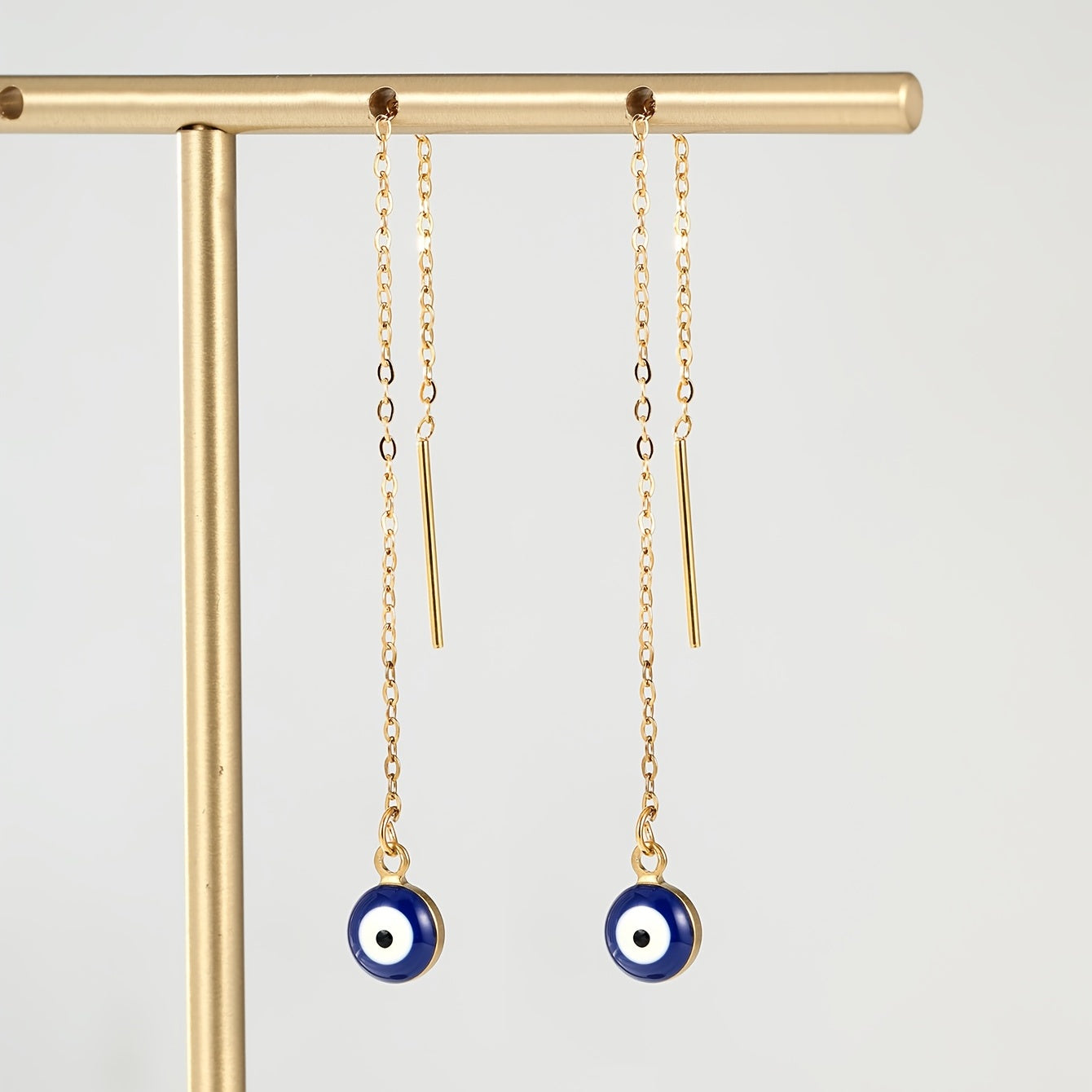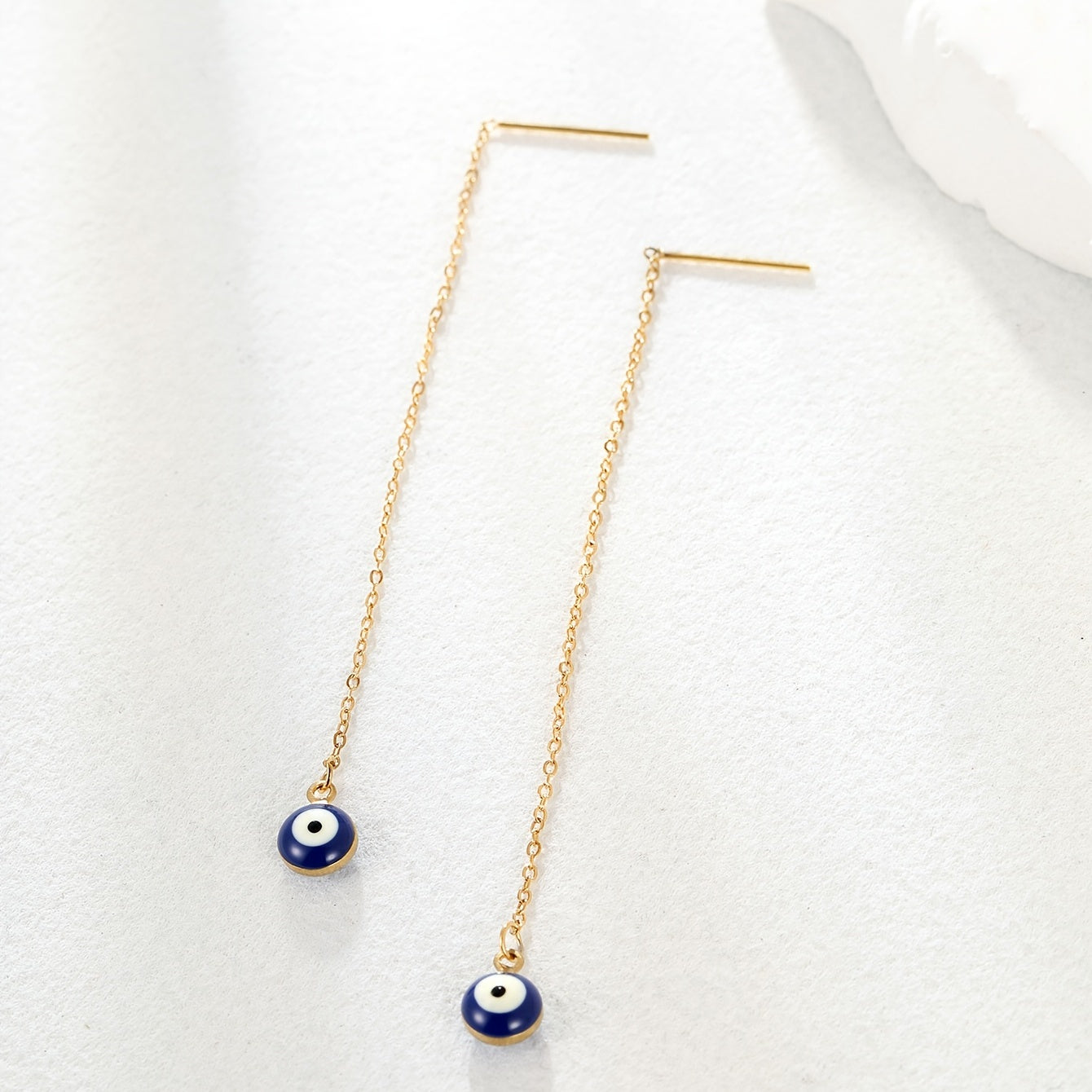 Add a touch of mystical charm with these Evil Eye linear earrings. Made from stainless steel with 18K gold plating, these earrings are versatile and eye-catching.