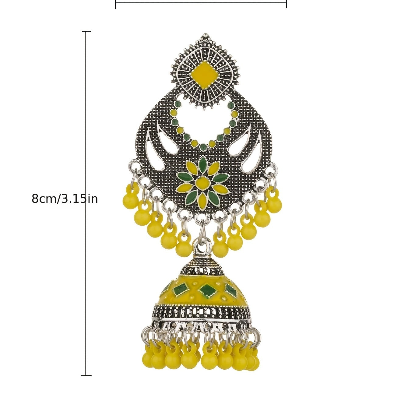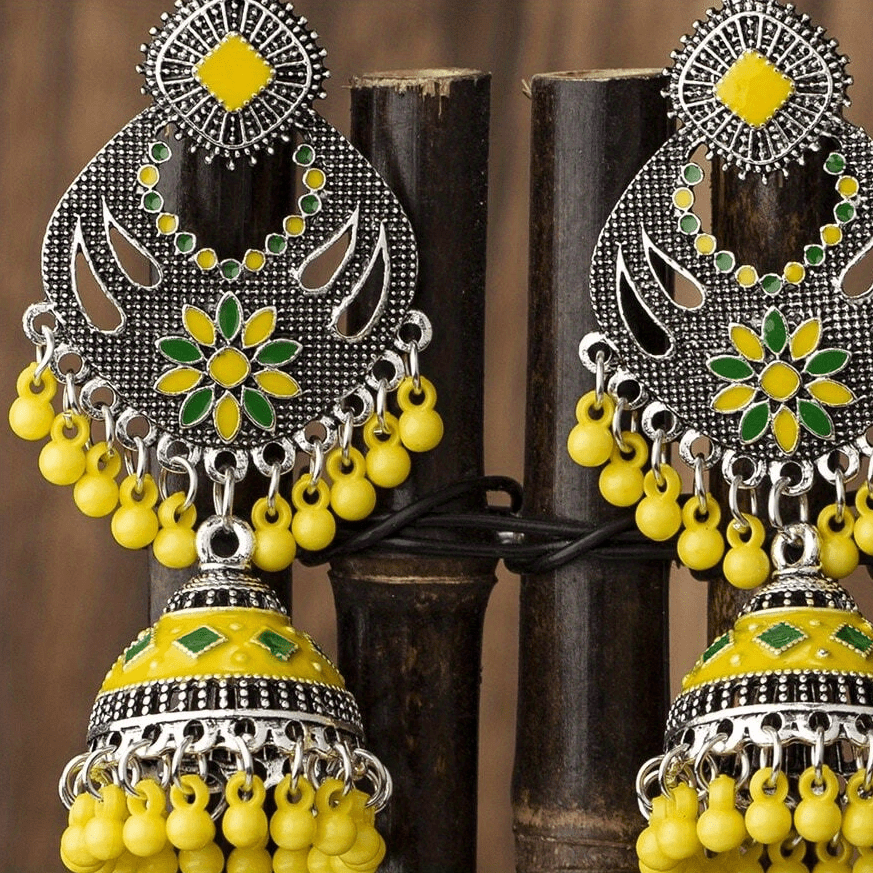 These yellow and pink dangle earrings feature a flower pattern with beads decoration, perfect for a retro bohemian style. They make a creative gift for females.