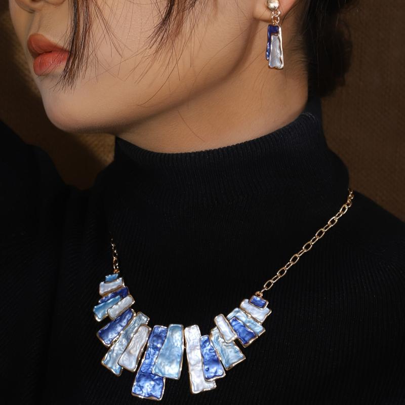 Enhance your style with this set of women's jewelry featuring a blend of Japanese and elegant design in khaki. The set includes a pair of earrings and a necklace with a geometric motif.