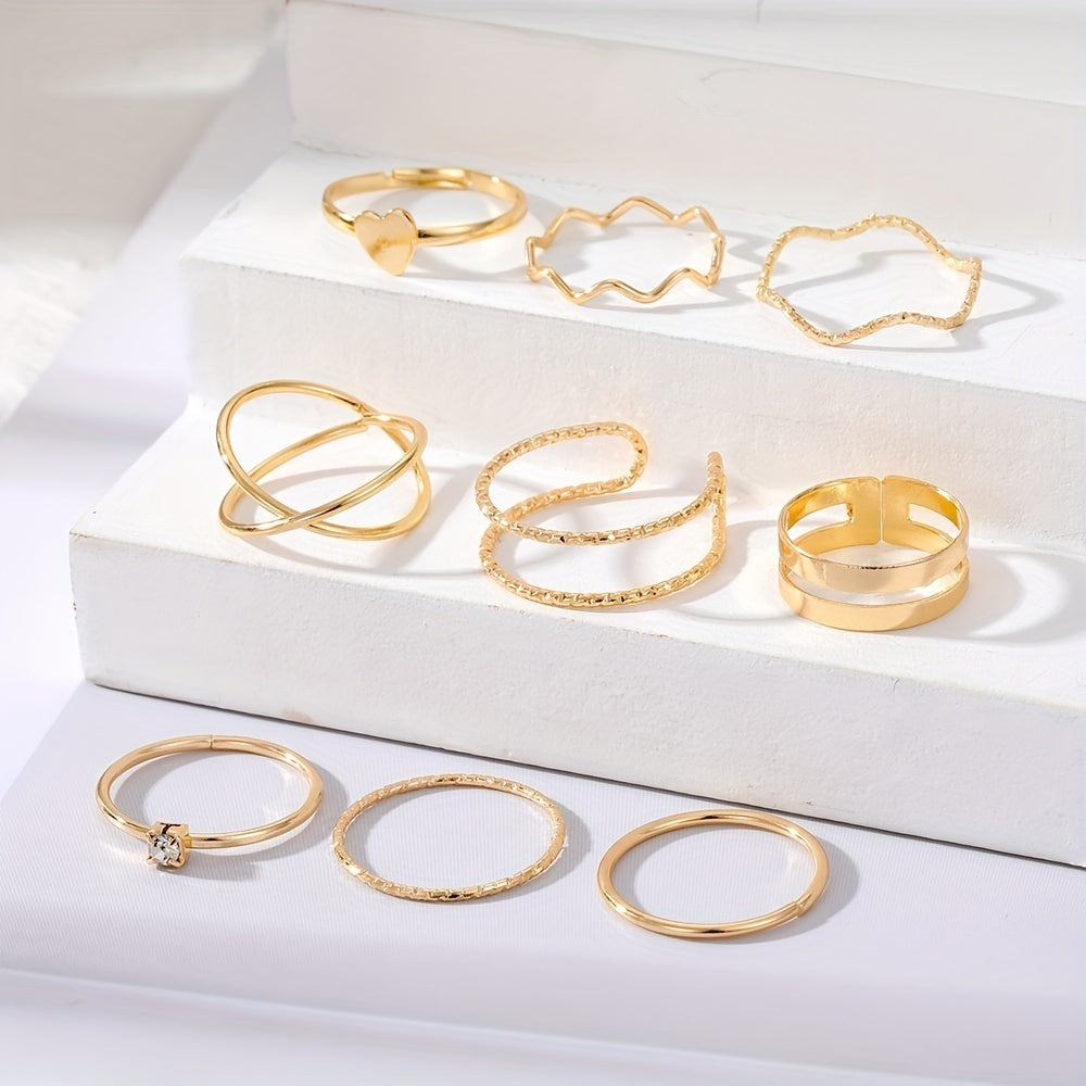 Enhance your style with this geometric ring set featuring inlaid rhinestones. Perfect for a hip hop look and adding a touch of glam to your fingers.