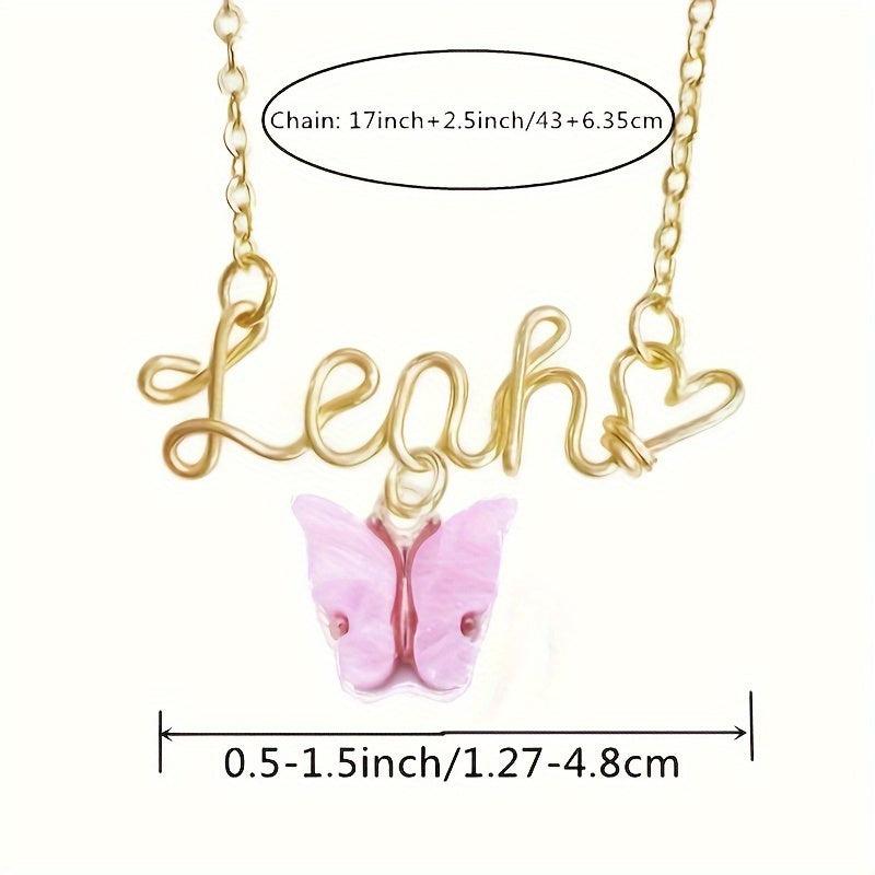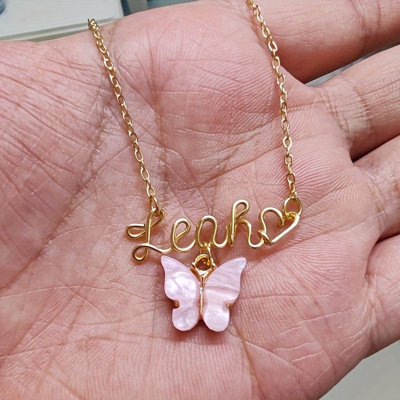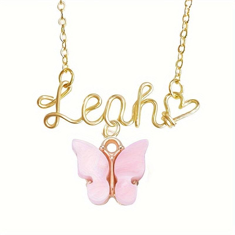 Charming butterfly necklace featuring pink enamel wings on a golden tone chain.