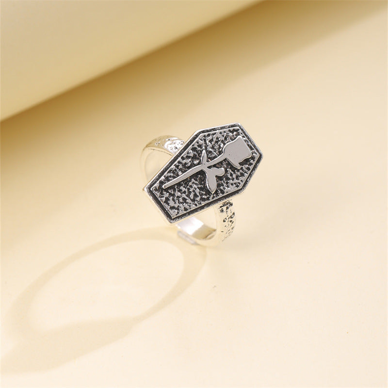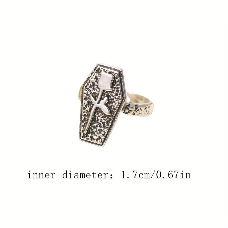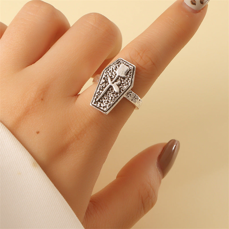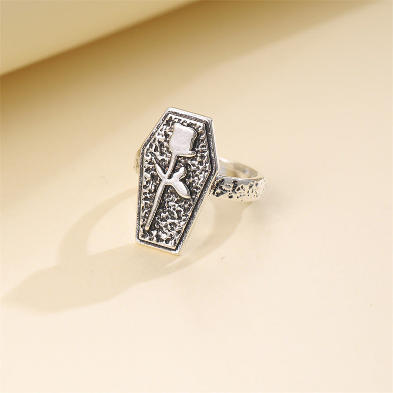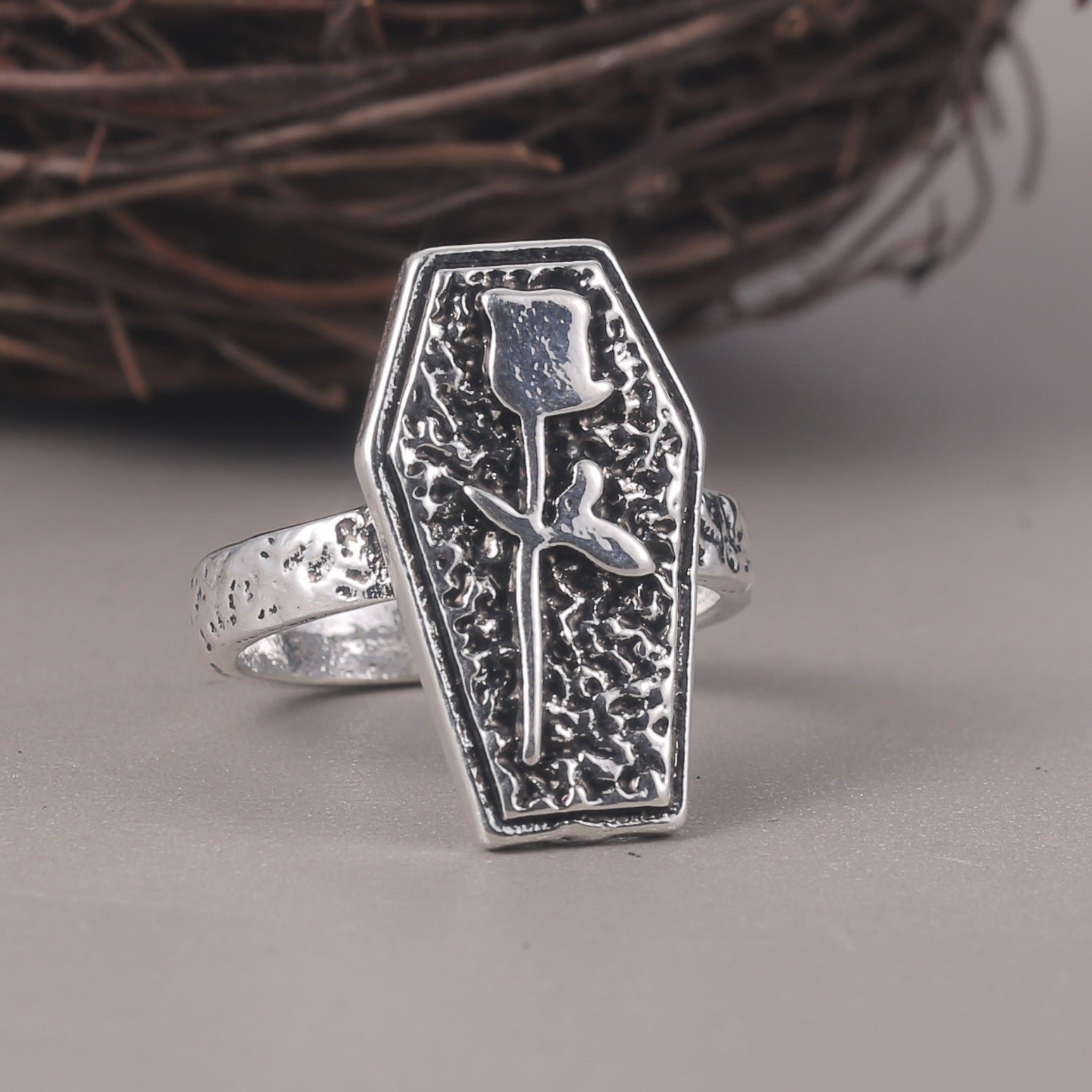 This coffin-shaped ring with a dead rose inside symbolizes elegance and is a perfect Halloween accessory that also matches daily outfits.
