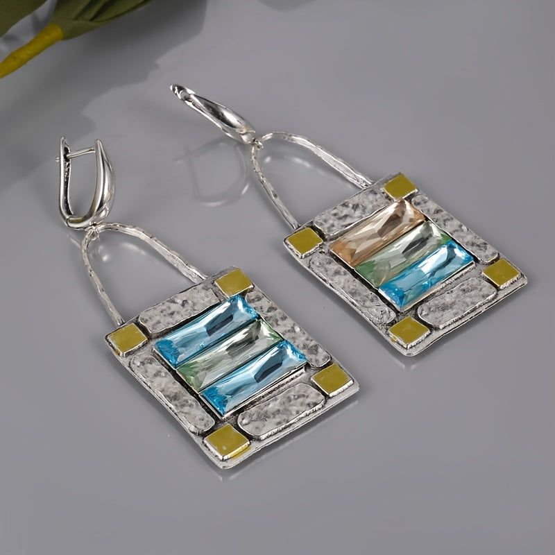 These vintage green crystal stone hook earrings feature a geometric square design with zircon detailing. Perfect for parties and special occasions.