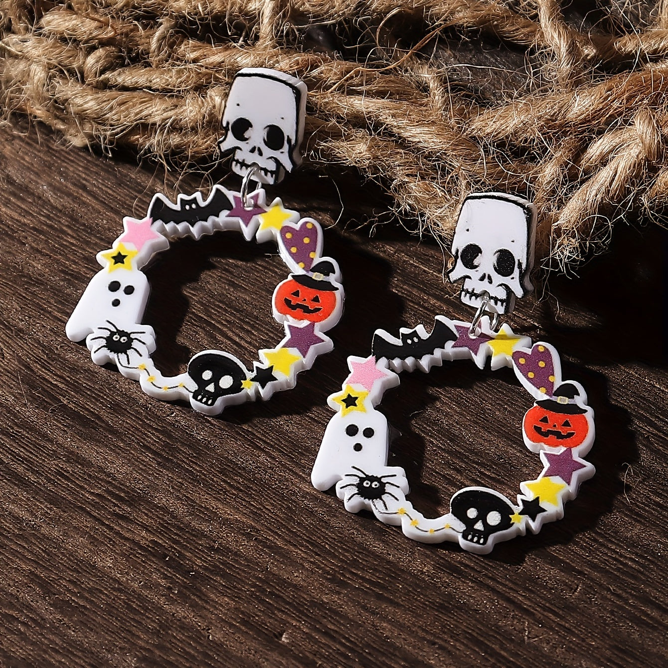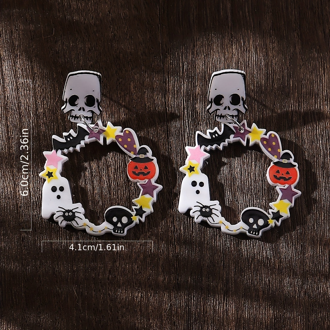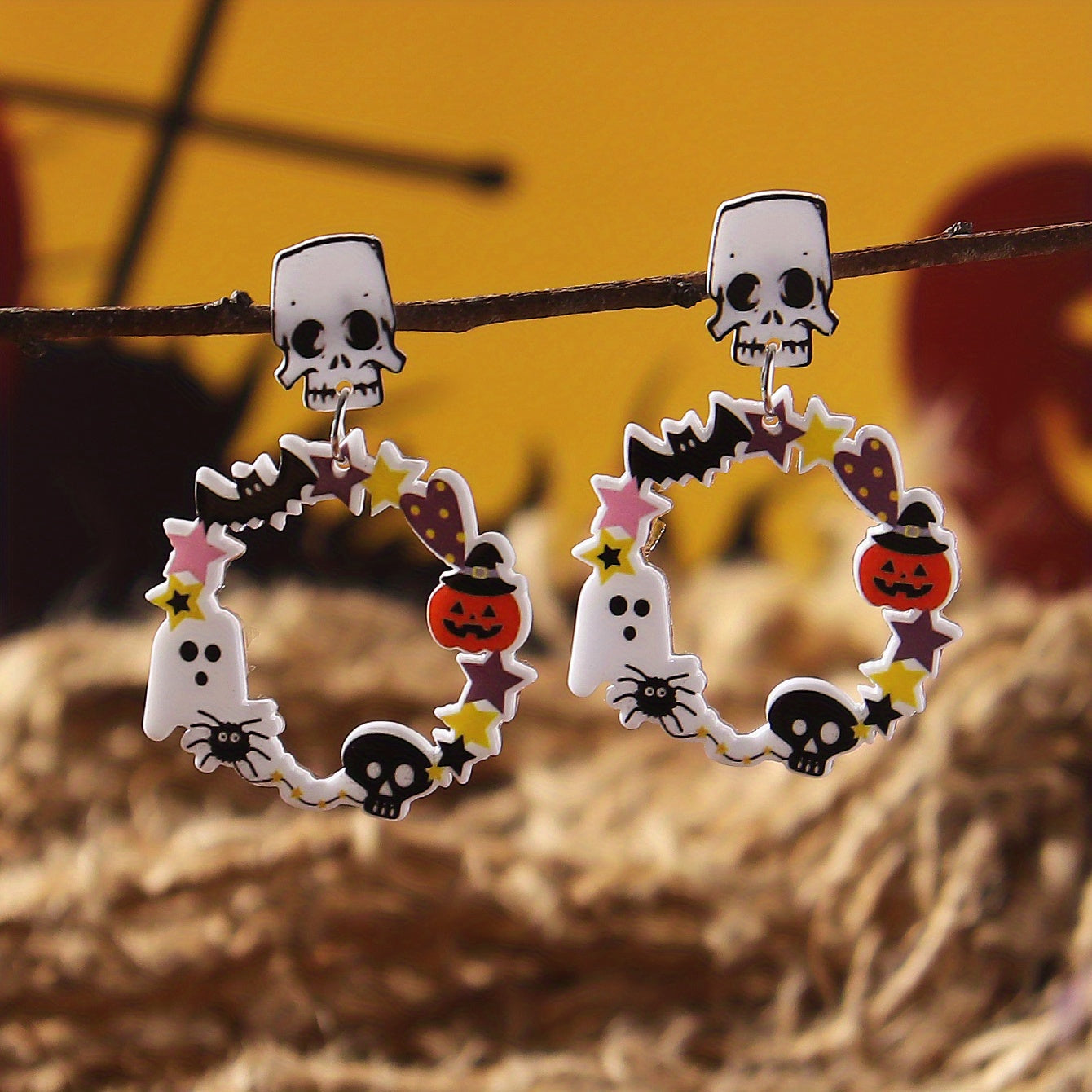These creative dangle earrings feature a cartoon-style design with pumpkin, skull, ghost, and bat decorations, making them the perfect Halloween accessory for females.