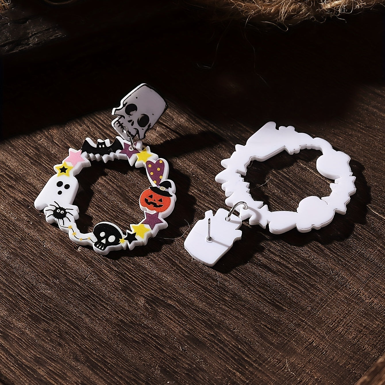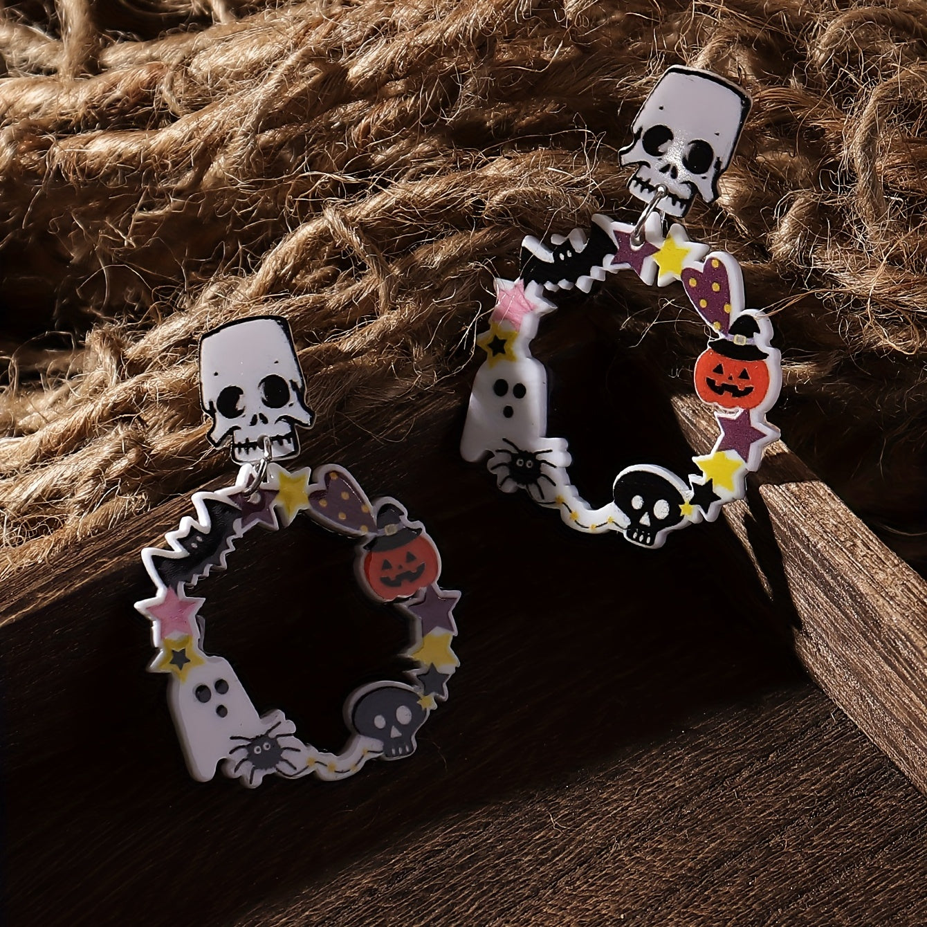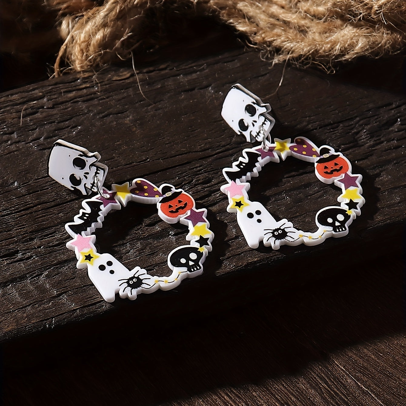 These creative dangle earrings feature a cartoon-style design with pumpkin, skull, ghost, and bat decorations, making them the perfect Halloween accessory for females.