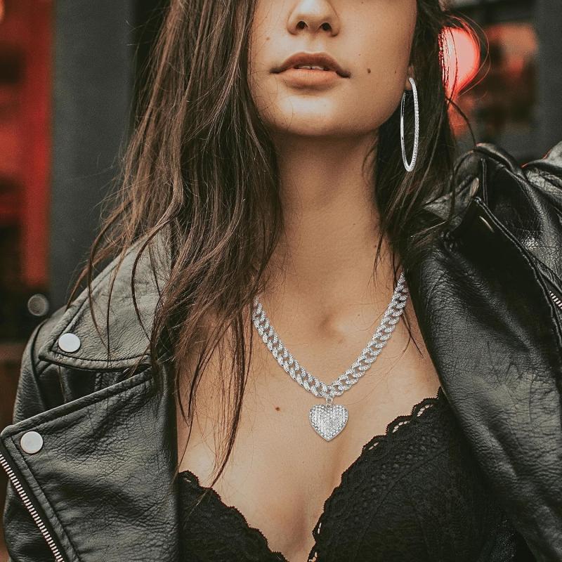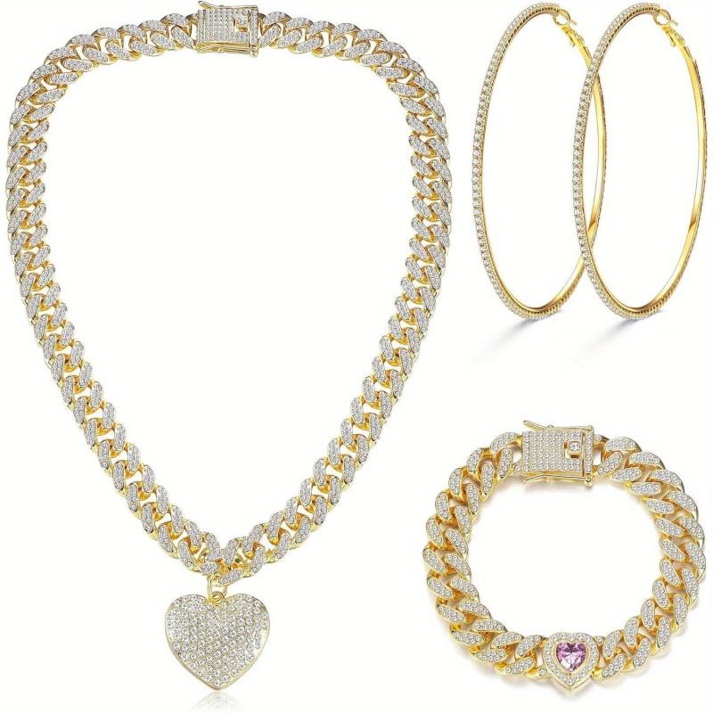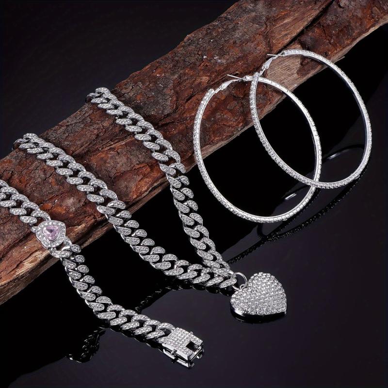 Complete your look with this stunning jewellery set featuring a heart chain necklace, rhinestone hoop earrings, and a matching bracelet. Available in golden and silvery tones. Perfect for adding a touch of glamour to any outfit.