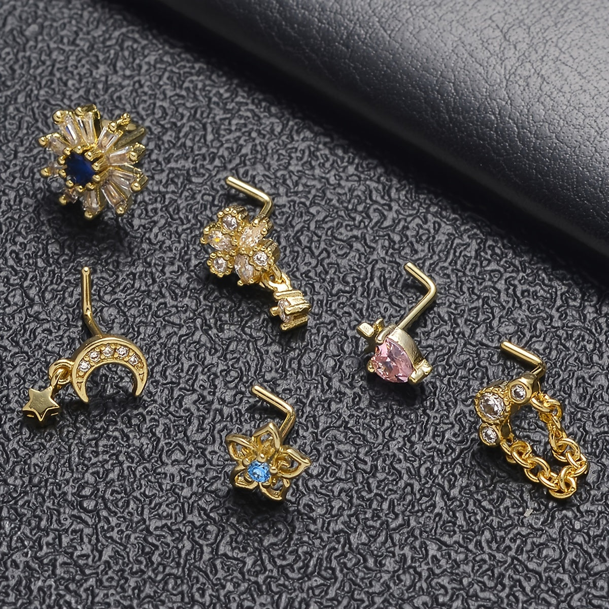 Elevate your style with these trendy nose rings studs made of stainless steel with 18K plating. Featuring CZ heart, moon, and butterfly designs, this set is perfect for adding a touch of edginess to your look.