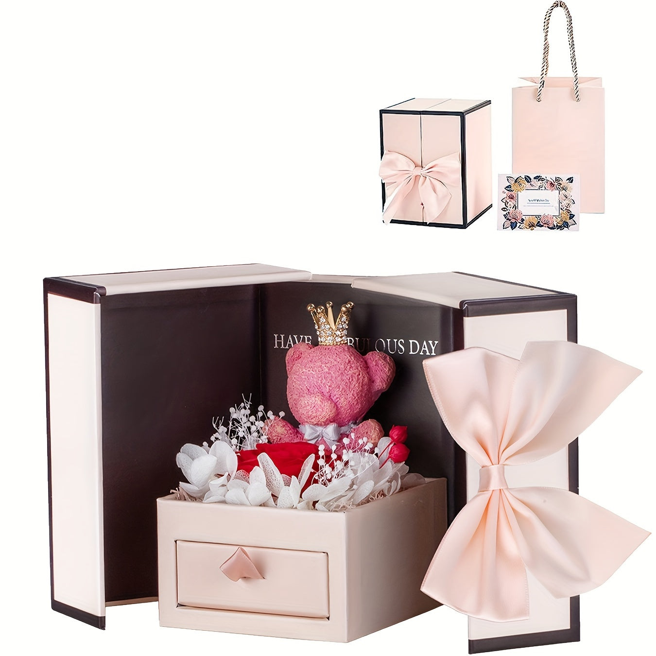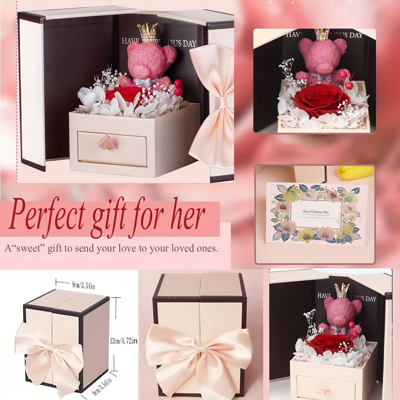 This stunning necklace features a hollow love heart pendant inlaid with purple zirconia stones. It also includes a cute bear charm and a faux rose flower for added charm.