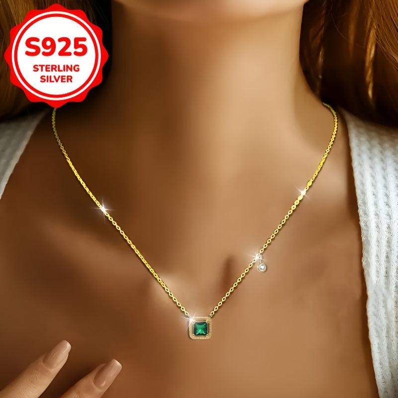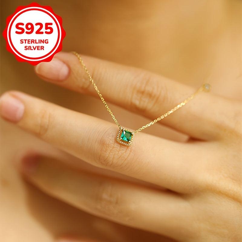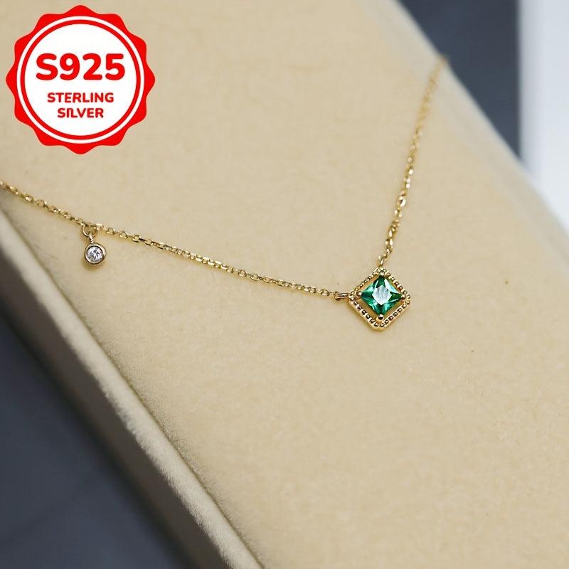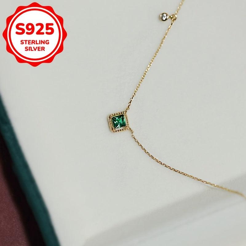 Elegant and delicate pendant necklace featuring a square created emerald pendant with synthetic zirconia on a S925 silver collarbone chain. Perfect for daily wear or special occasions.