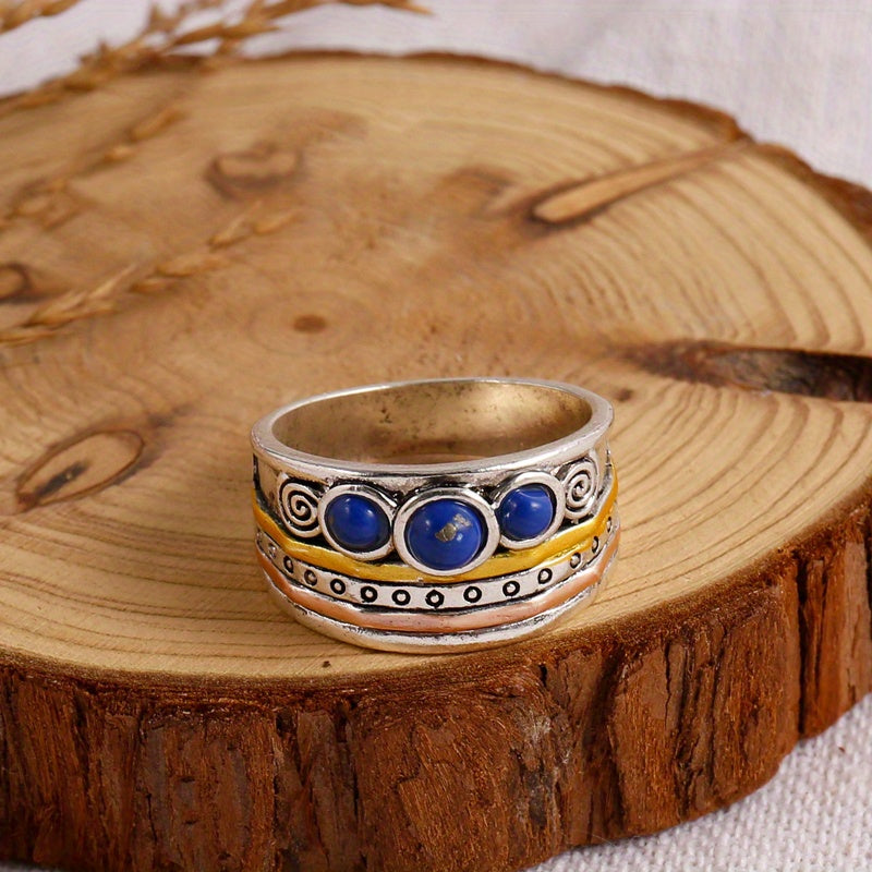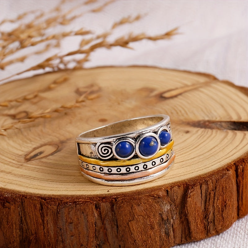 This three tone ring features a beautiful lapis lazuli stone, perfect for meditation and anxiety relief. The spinning band adds a touch of boho style to your look.
