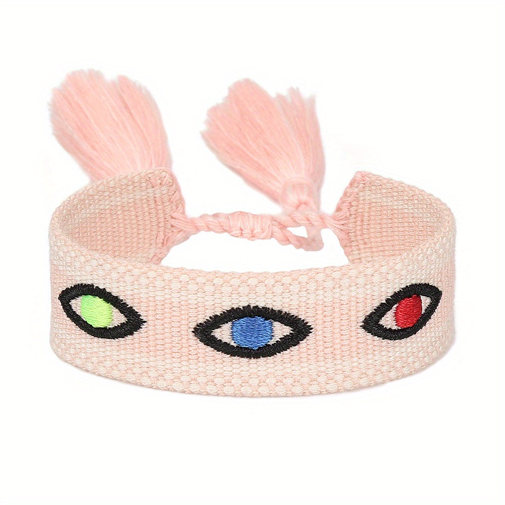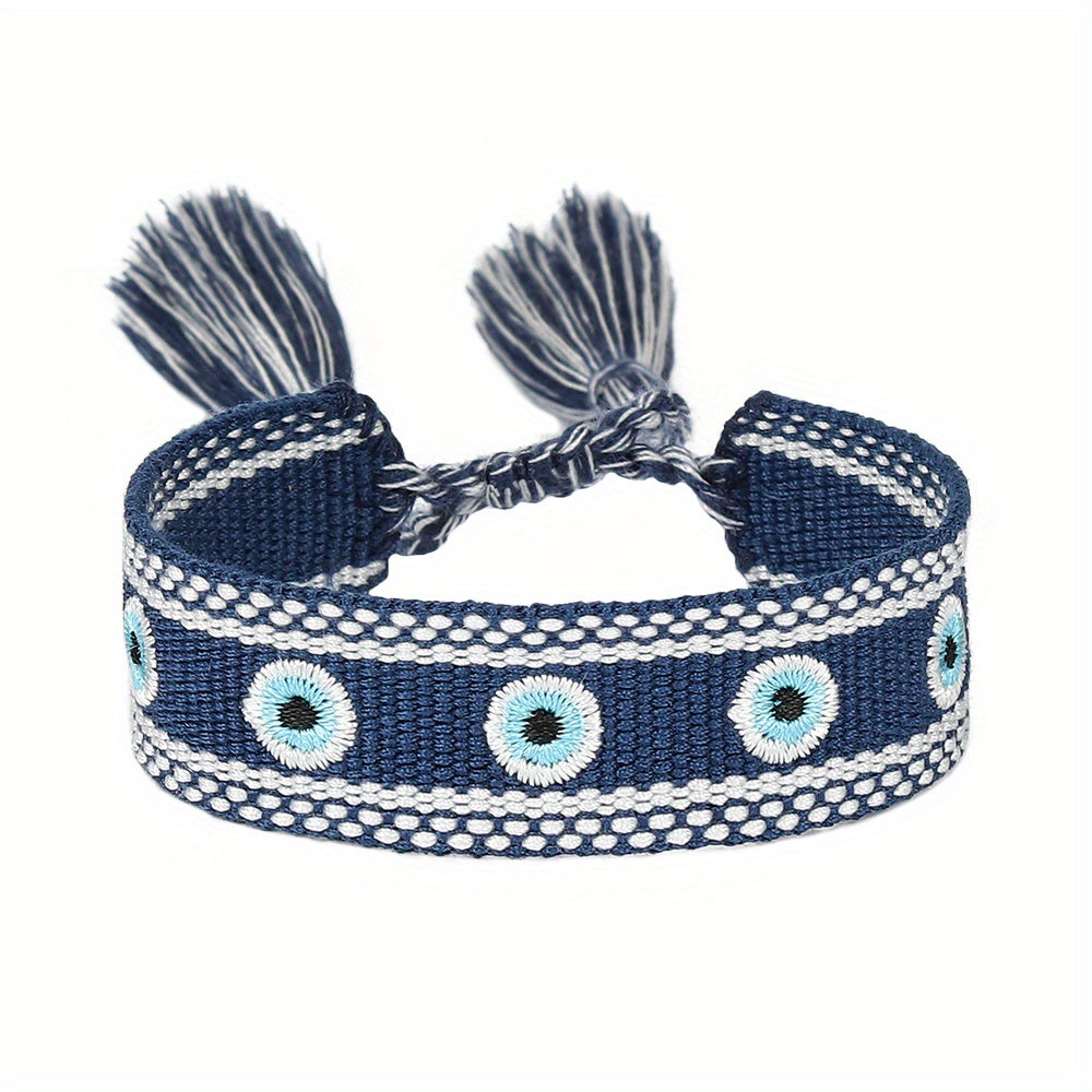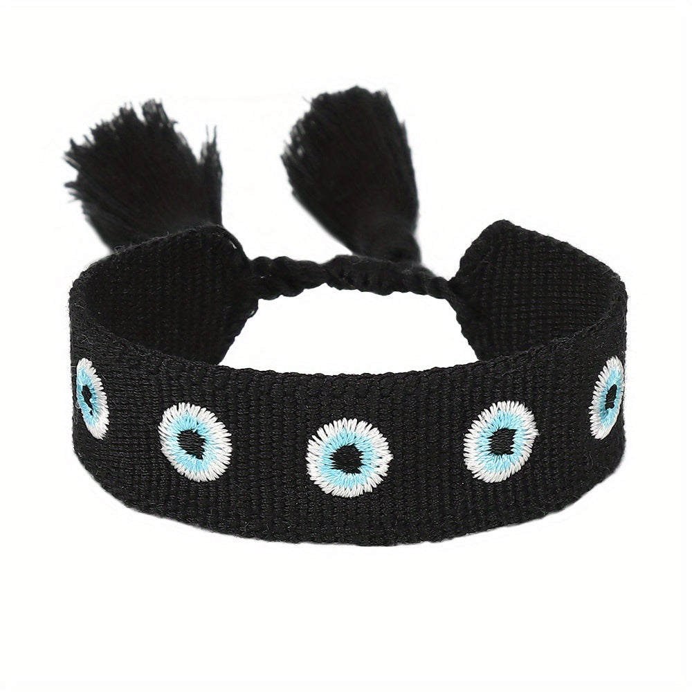 This braided rope bracelet features evil's eyes embroidery with tassel details, perfect for weddings, parties, or as a thoughtful gift. Available in 10 vibrant colors.