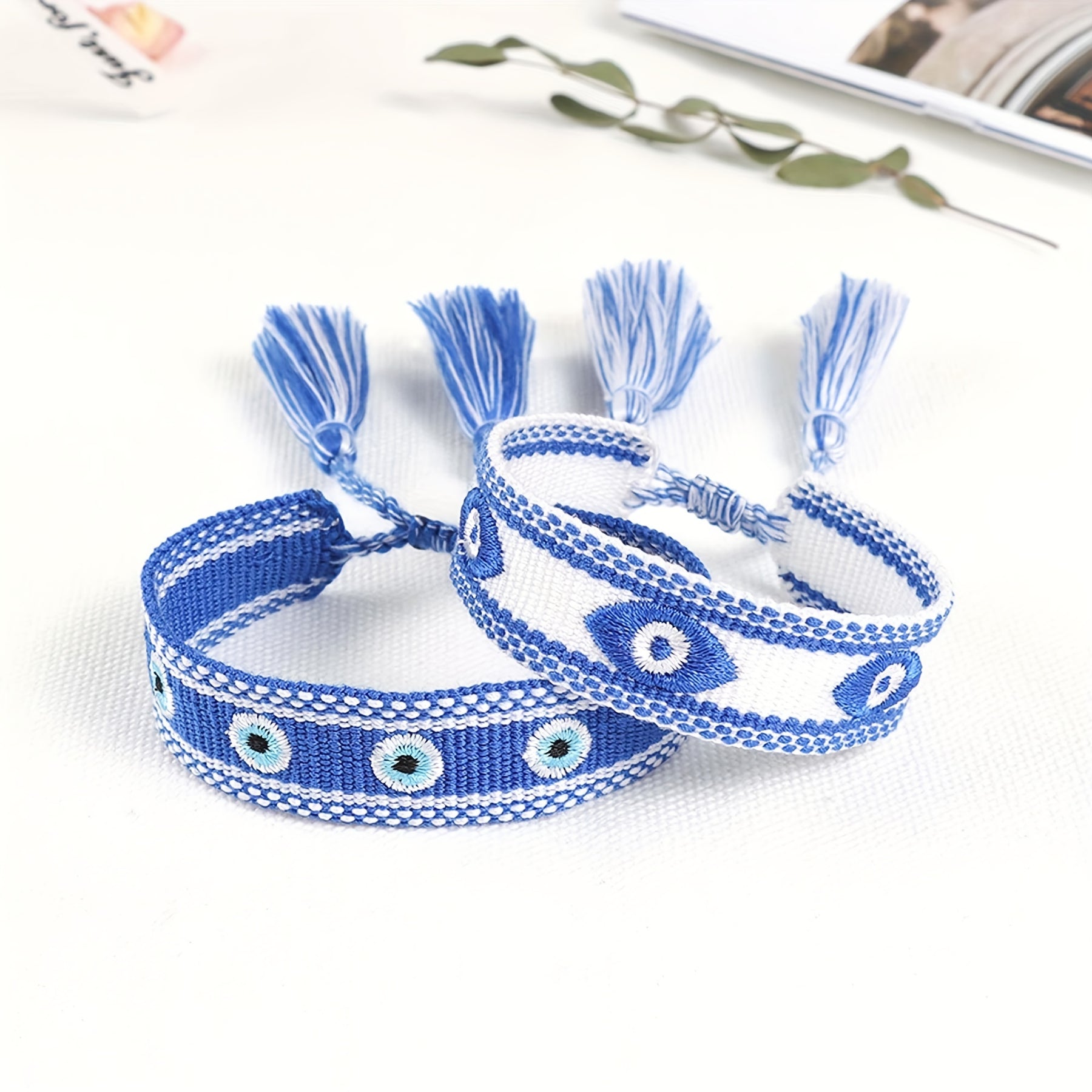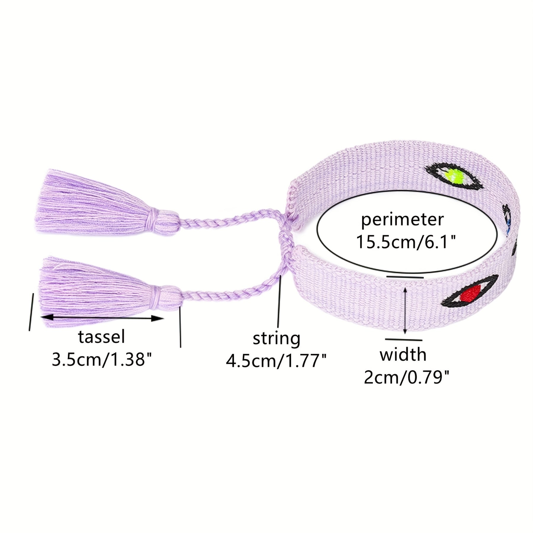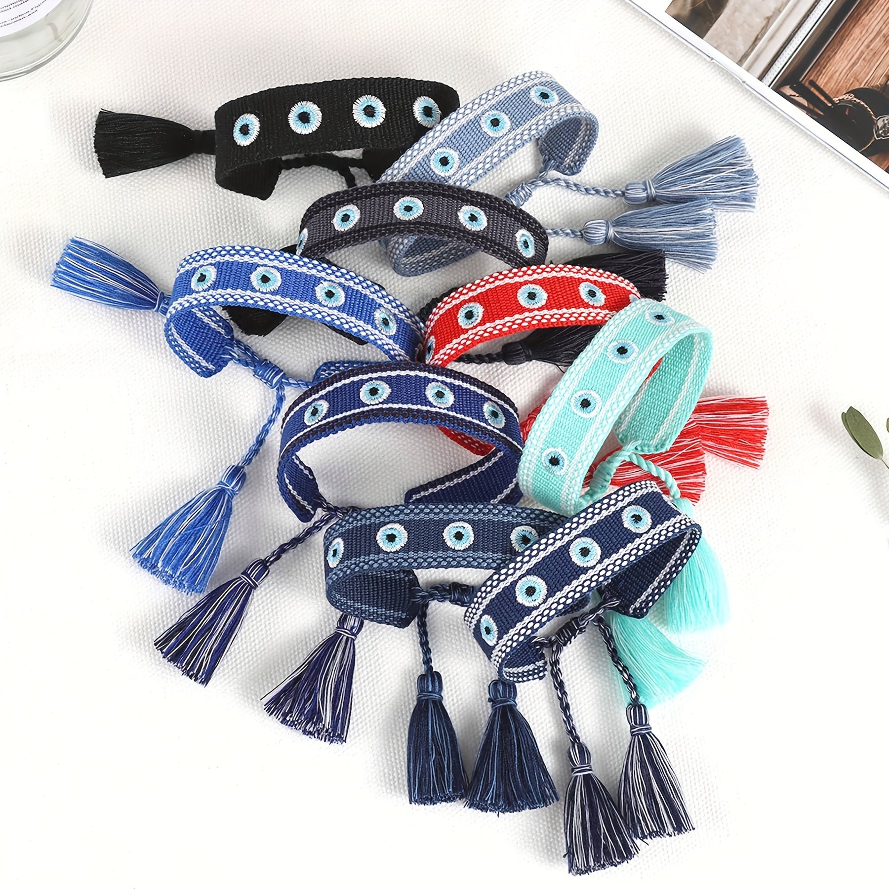 This braided rope bracelet features evil's eyes embroidery with tassel details, perfect for weddings, parties, or as a thoughtful gift. Available in 10 vibrant colors.