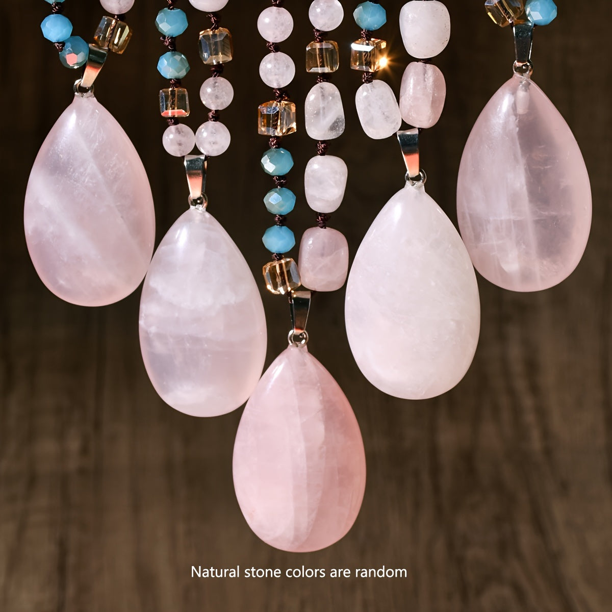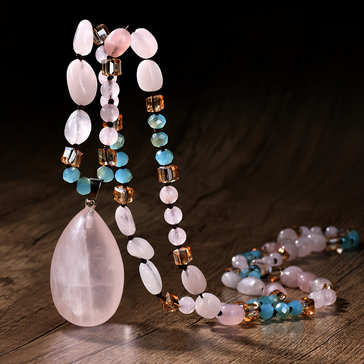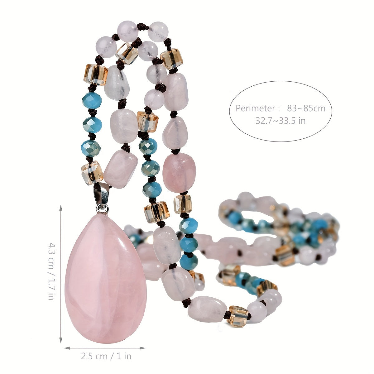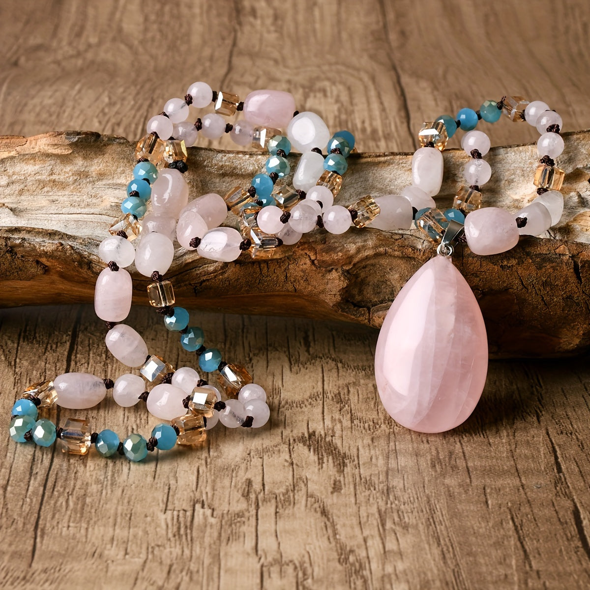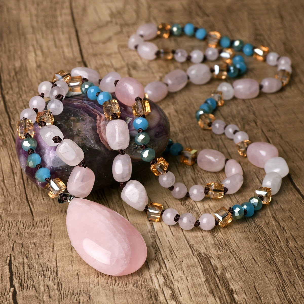 This bohemian pendant necklace features a natural pink quartz gemstone set in a handcrafted mosaic design. The long beaded chain adds a touch of elegance to any outfit. Perfect for all seasons.