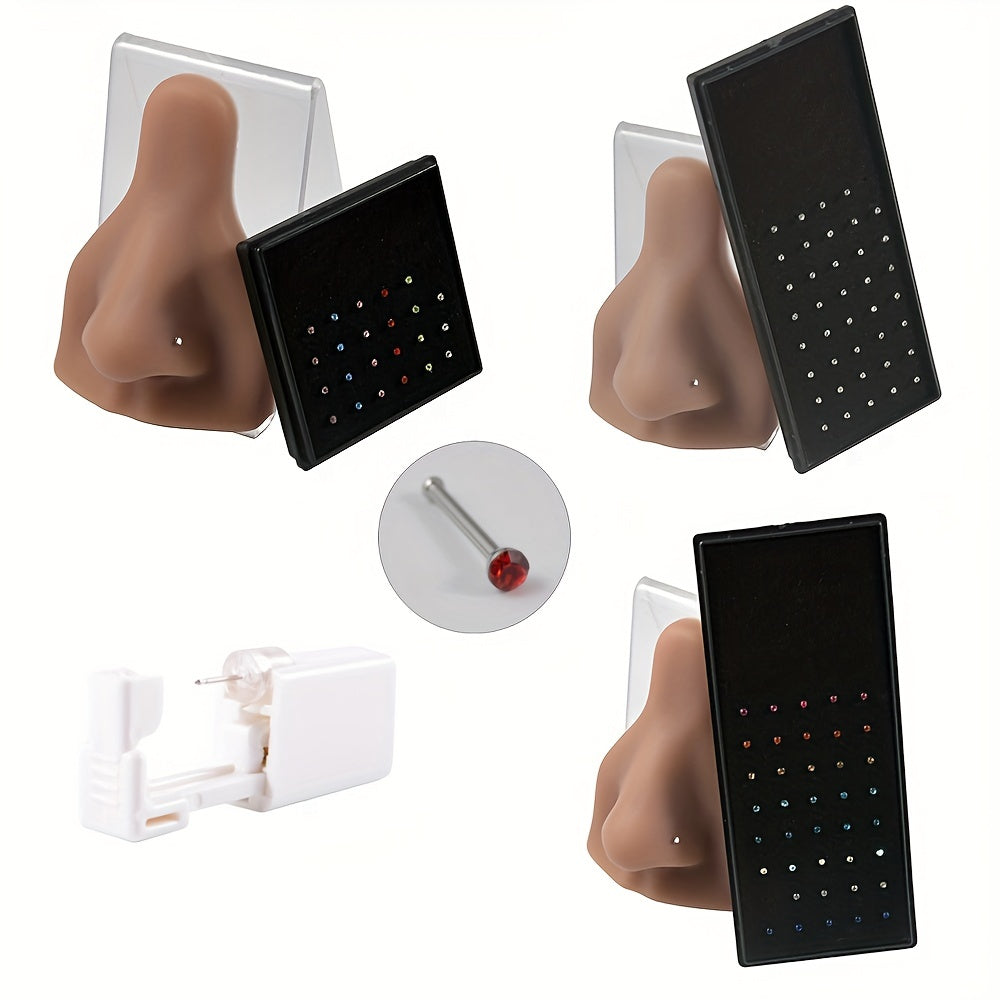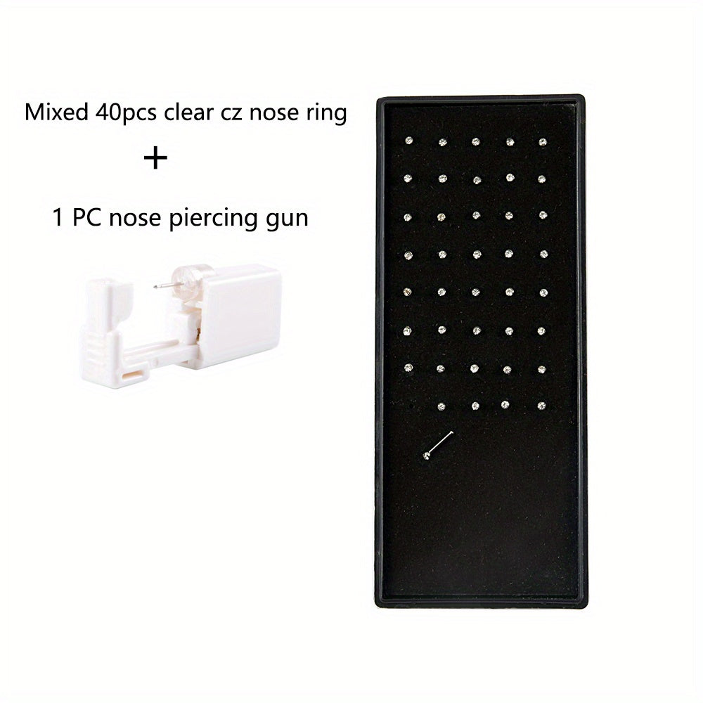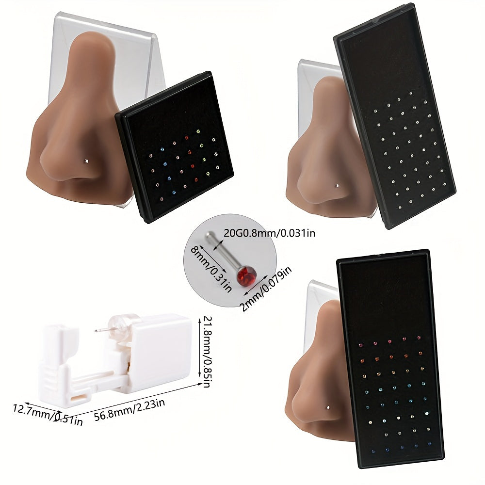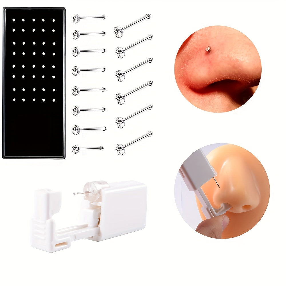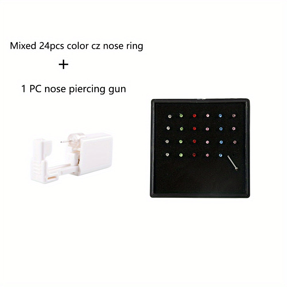 This set includes a piercing gun and 24 colored CZ straight nose studs. It is disposable, disinfectable, and provides safe piercing for earrings.