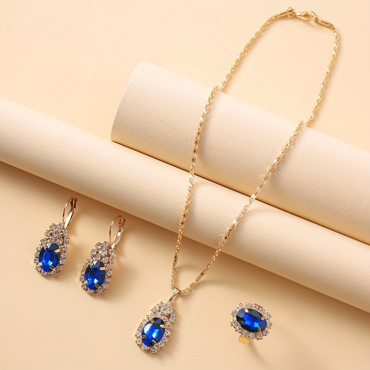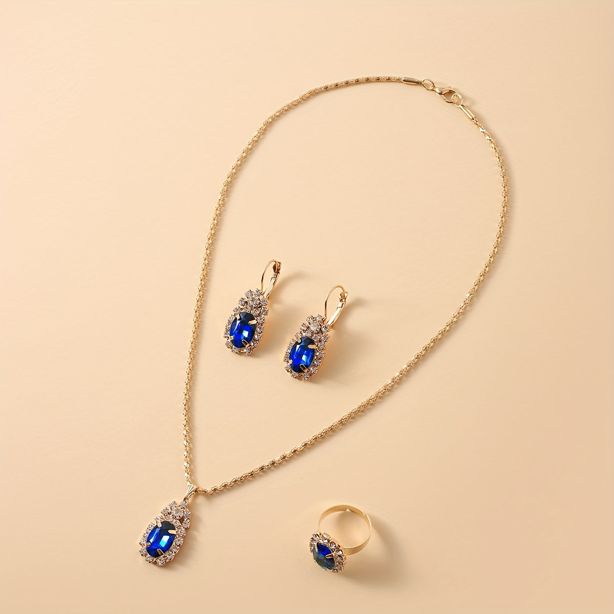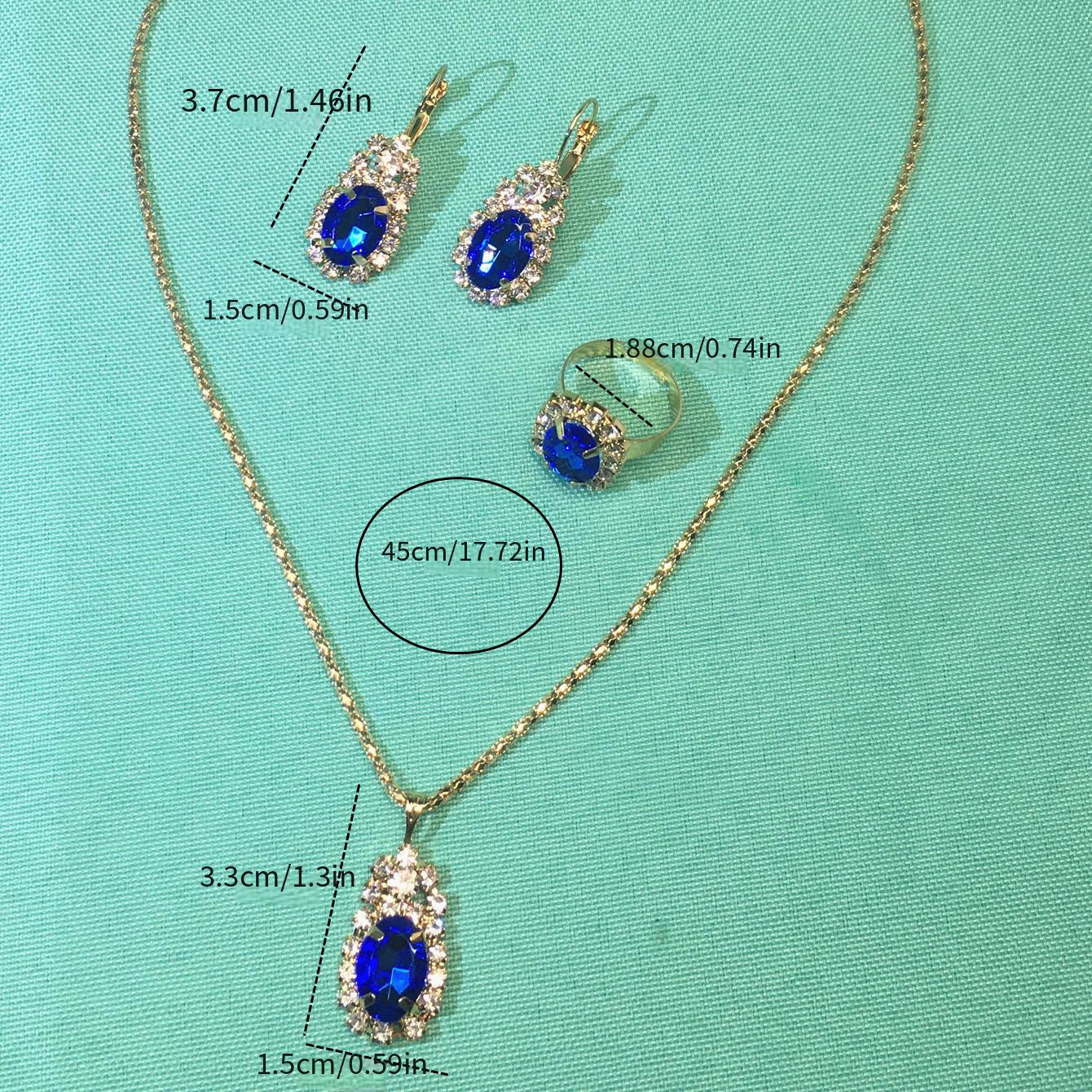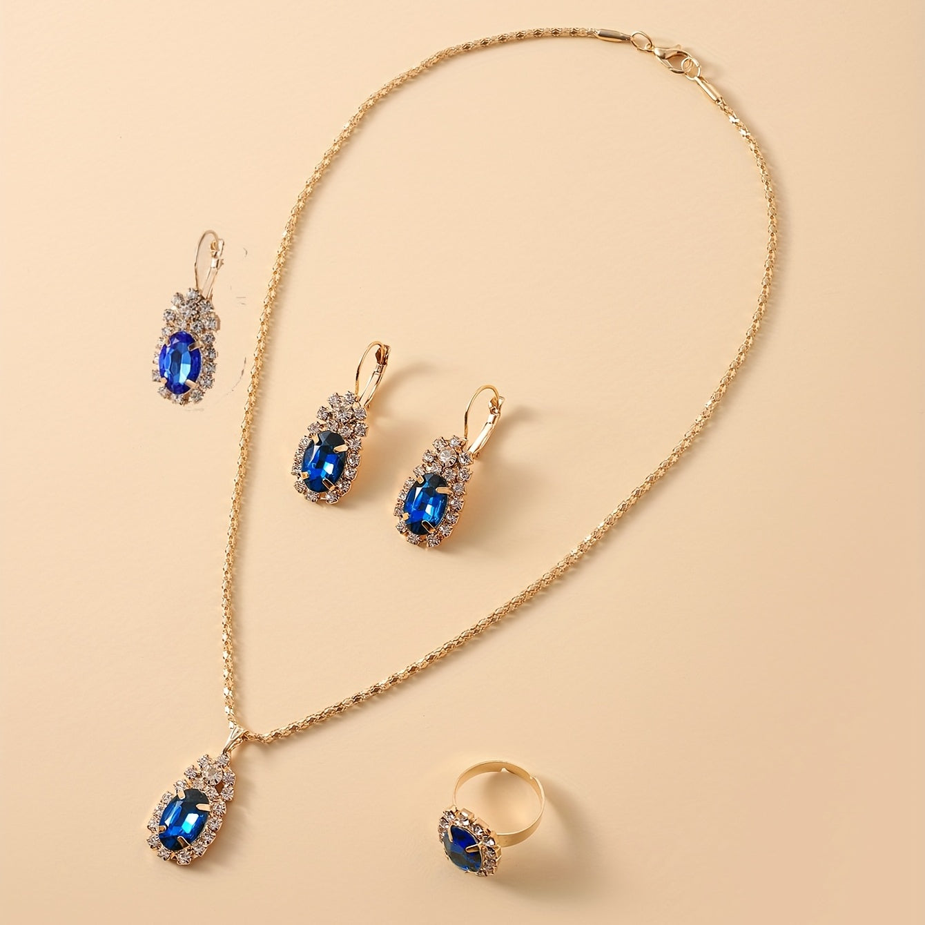 Complete your look with this elegant oval necklace, earrings, and ring set. Perfect for any occasion.